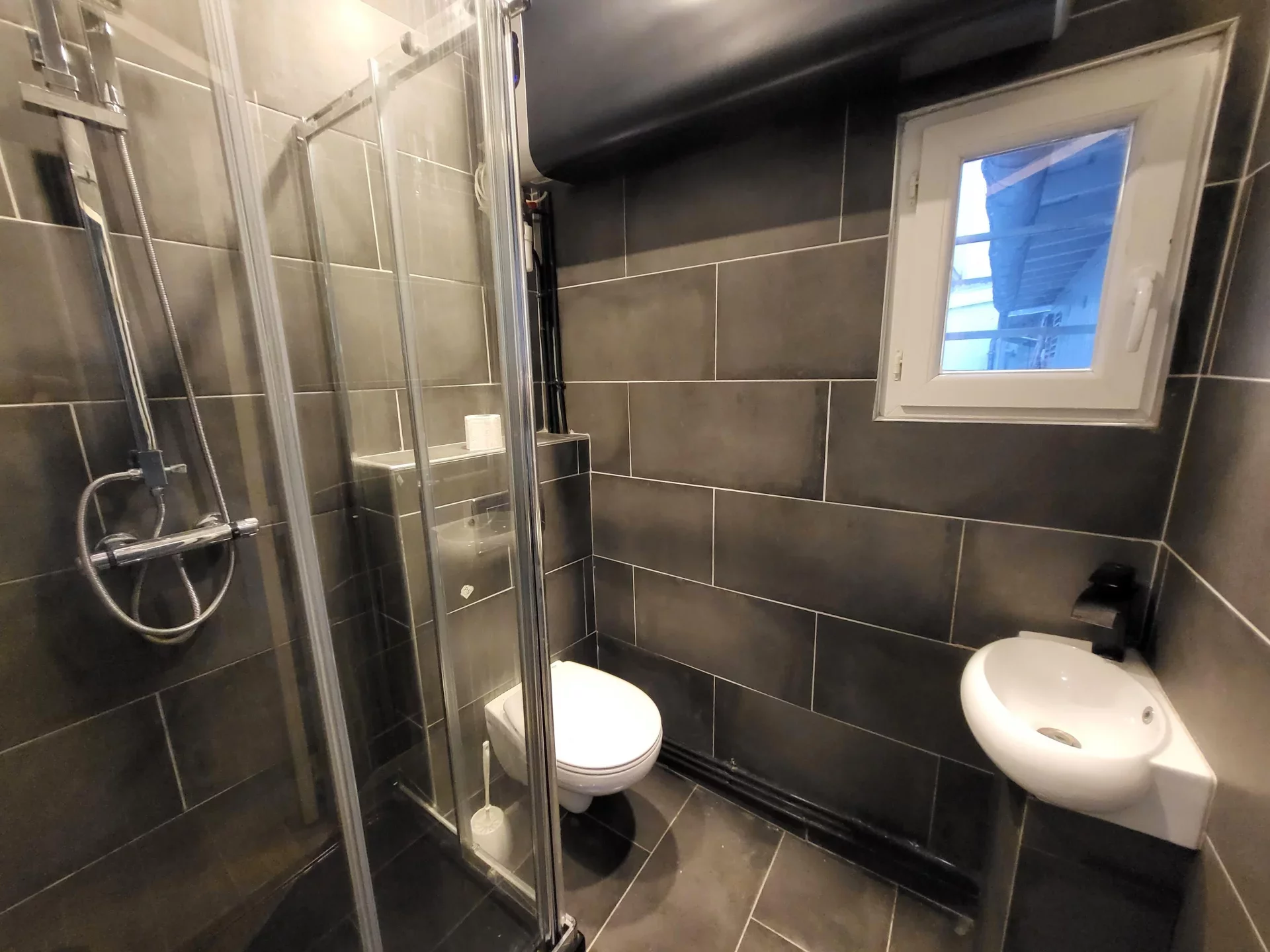 In perfect condition, it comprises, on the first floor, a walk-through room with a window overlooking the street and a window overlooking the inner courtyard. At the far end of this room are a kitchen area, a shower room and a toilet. There is also a marble fireplace and an extractor fan. In the basement, an office accessible via an internal staircase.