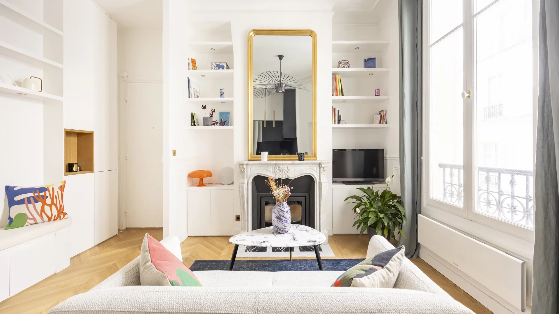 It comprises an entrance hall opening onto a living room with functional fireplace overlooking the courtyard, an open-plan fitted and equipped kitchen, a bedroom with custom-made storage space, a shower room and a separate toilet.