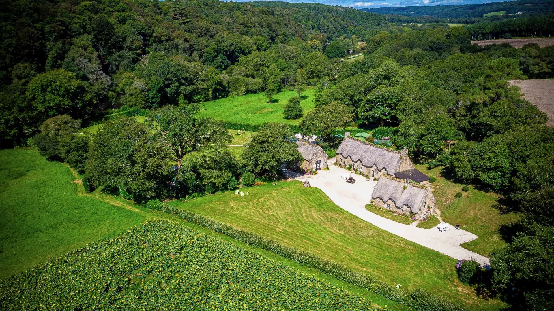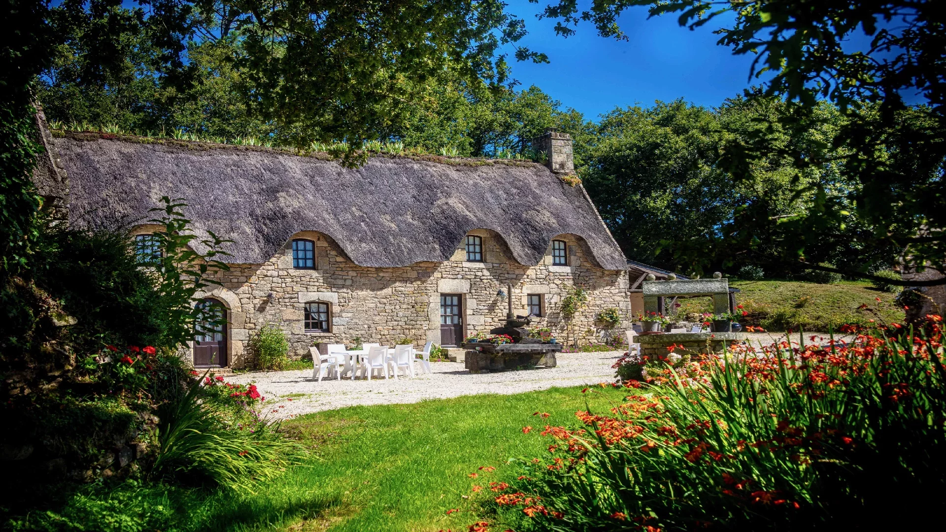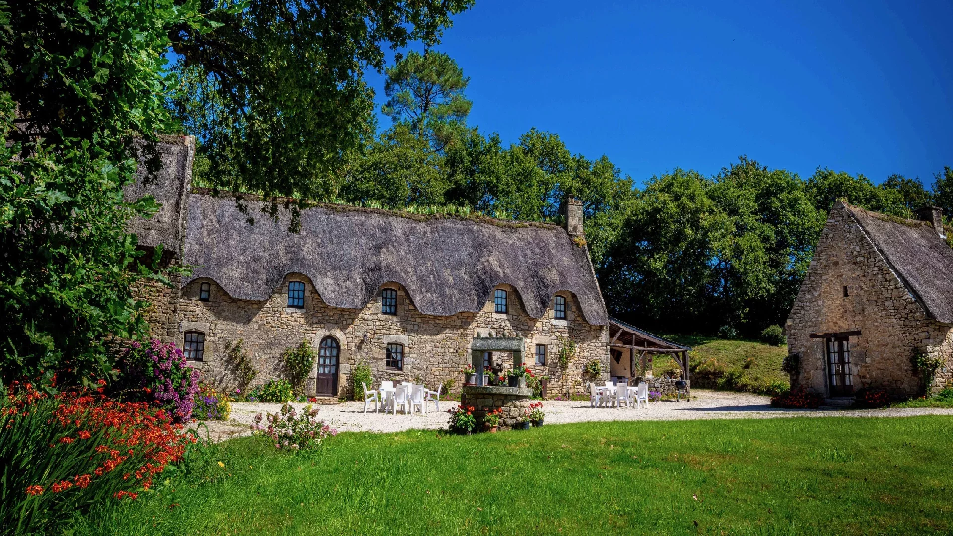 Situated in the heart of the Blavet and surrounded by an enchanting landscape, this magnificent property comprises three thatched stone cottages. Nestled in landscaped grounds spanning over 2 hectares, these independent cottages offer uninterrupted views of the park, the surrounding countryside and the water. Guests can enjoy absolute peace and quiet, as well as a timeless atmosphere, far removed from pollution and the modern era.
