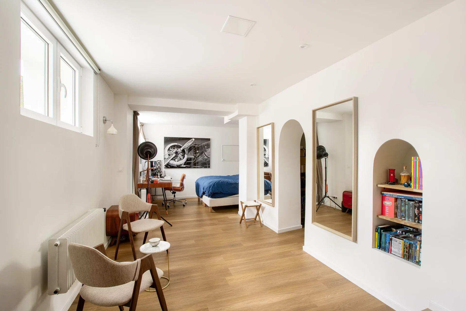In the bright, south-facing mezzanine, a very large bedroom and a laundry room with sink complete the living spaces. A shower room with toilet is also available.