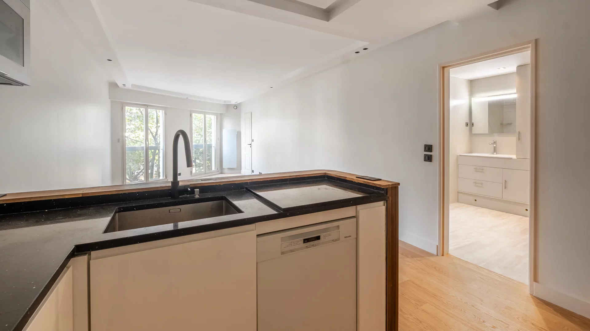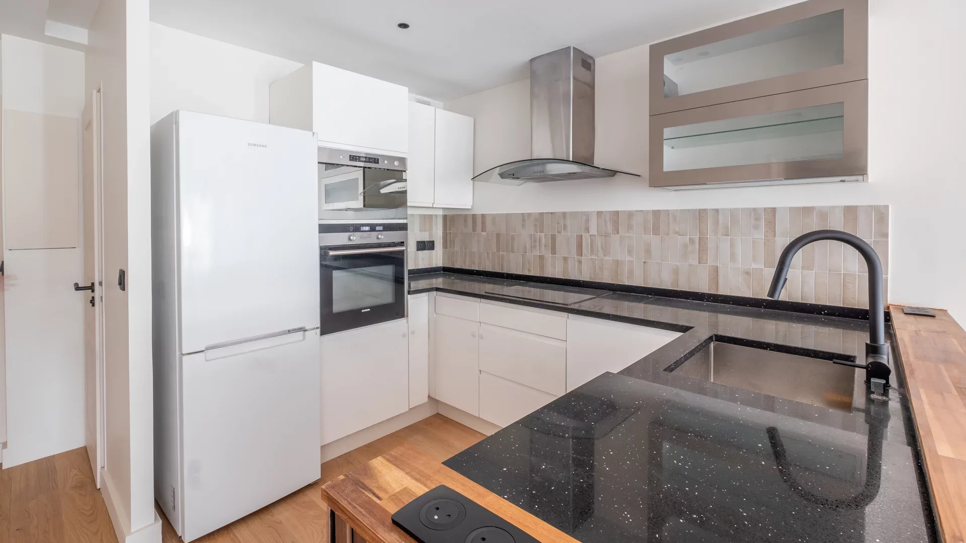 On the third floor with elevator, it comprises a light-filled living room with fully fitted and equipped open kitchen, bedroom with storage space, shower room and separate toilet.