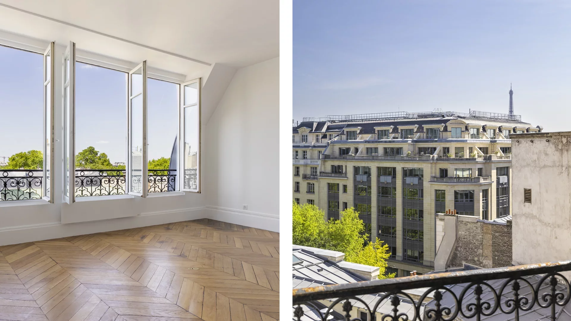 It comprises a living room, a dining room, four bedrooms including a master suite overlooking the trees of Parc Monceau and its bathroom, and a fitted kitchen.