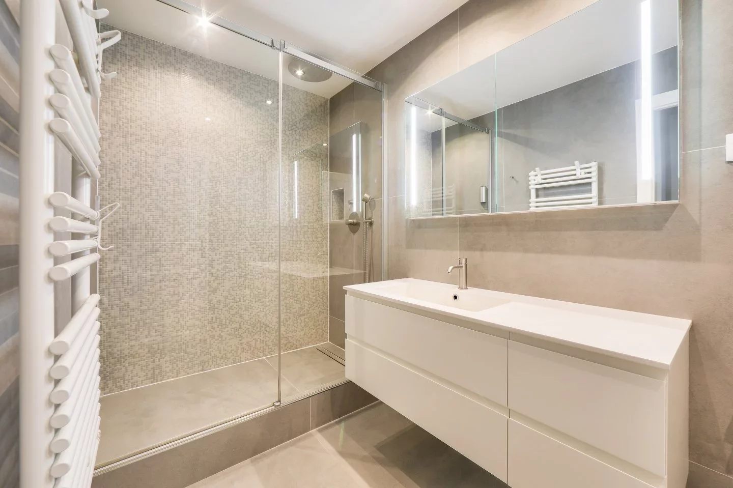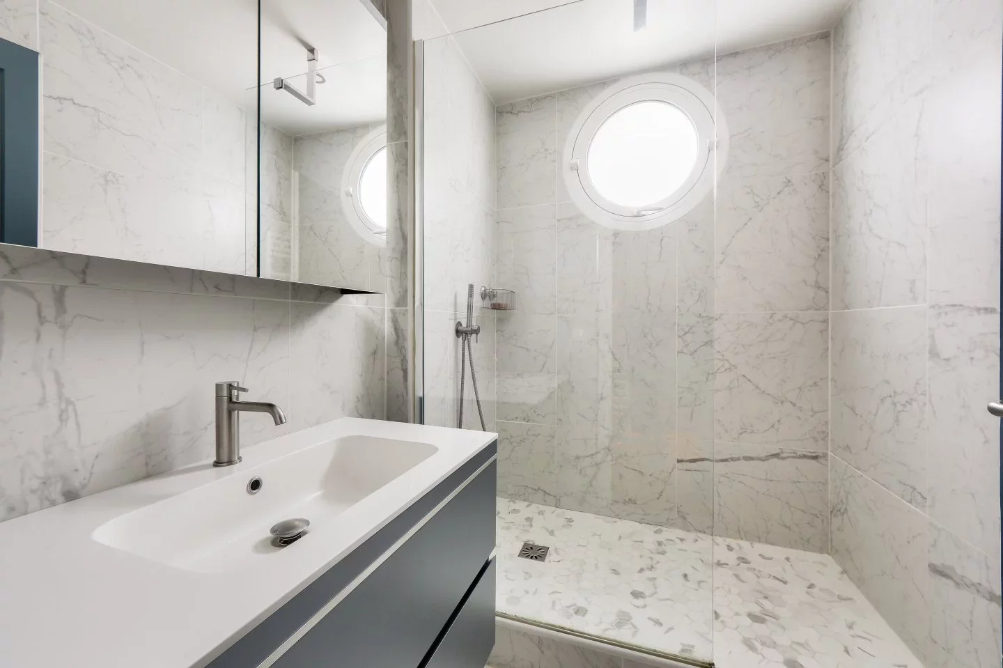 The night area comprises a master suite with shower room and built-in storage space, and two spacious bedrooms renovated with the same attention to detail, plus a second contemporary shower room, impeccably finished.