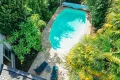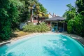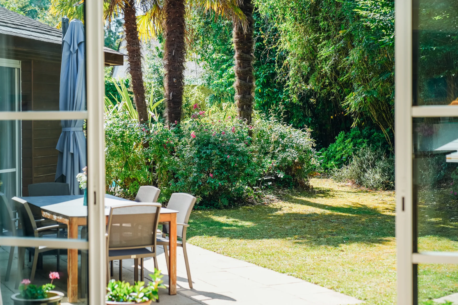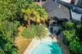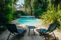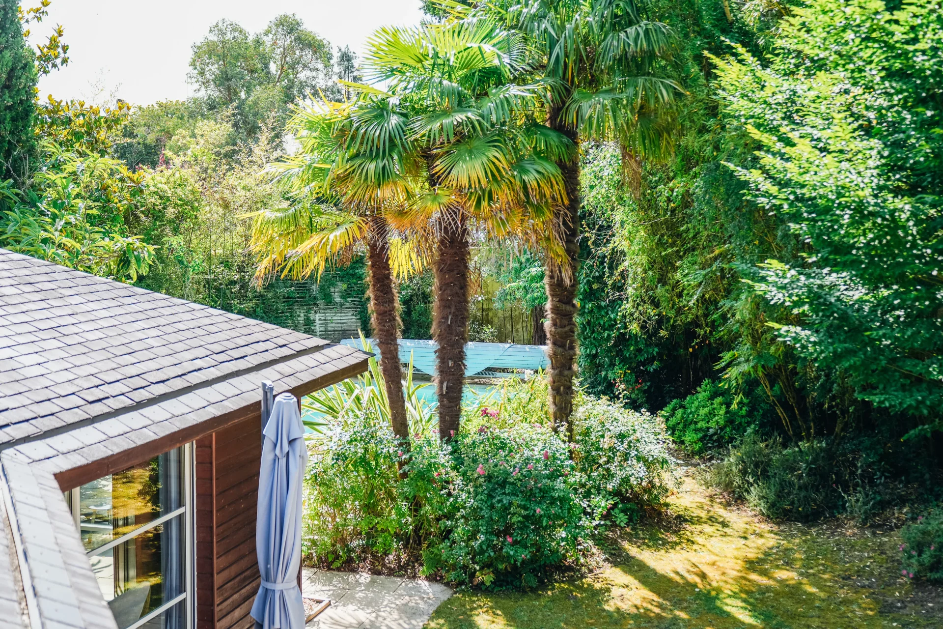 The lush, fully enclosed garden features a heated swimming pool (8.5 x 4.5 m) with above-ground cover and equipment room. Professional aerothermal heat pump (low noise level) for pool heating.