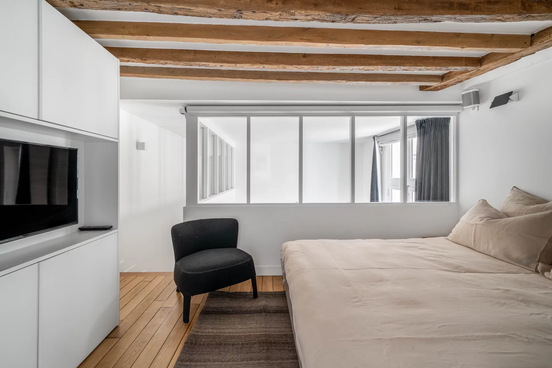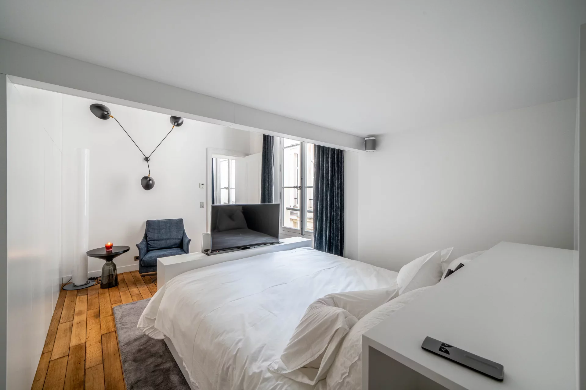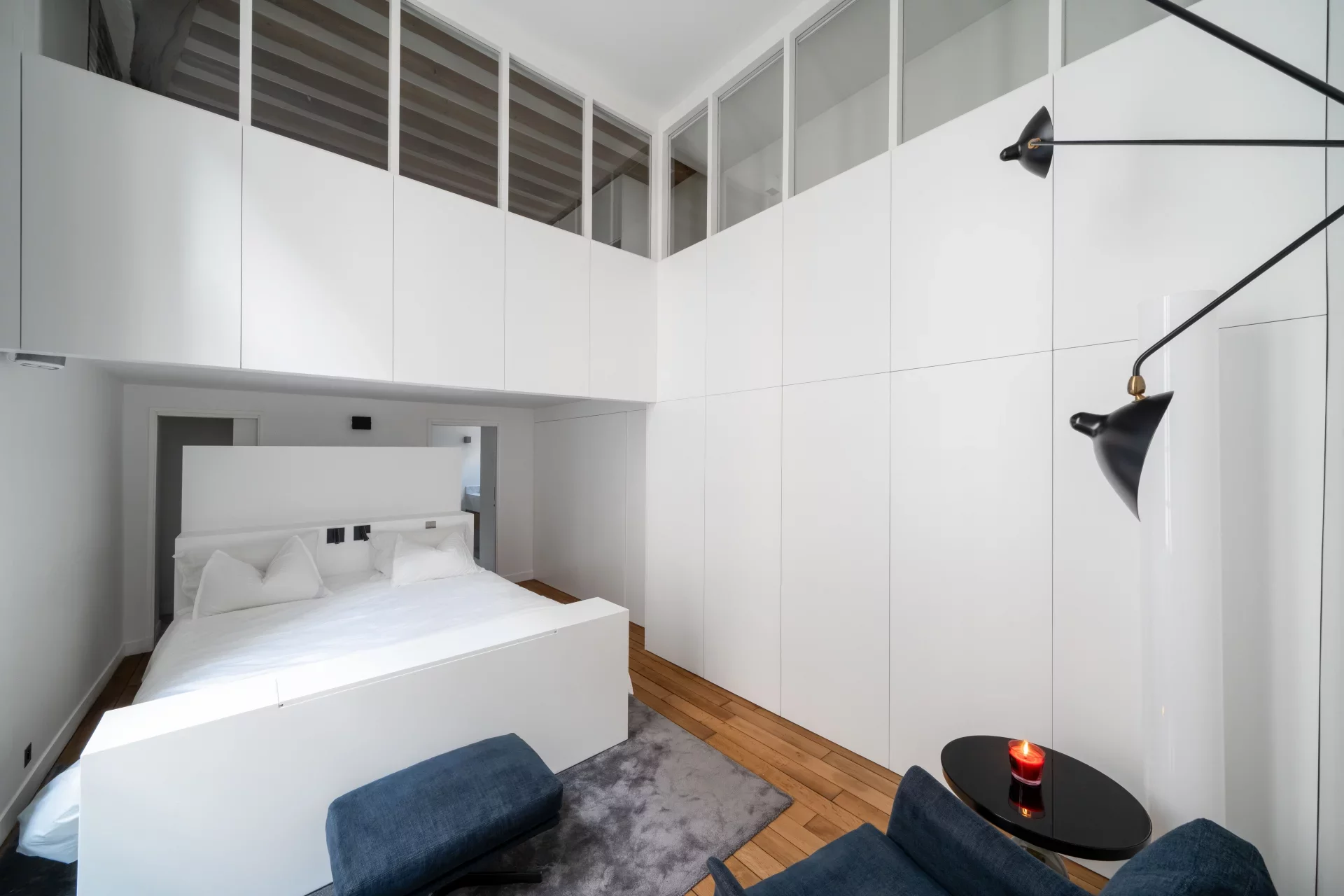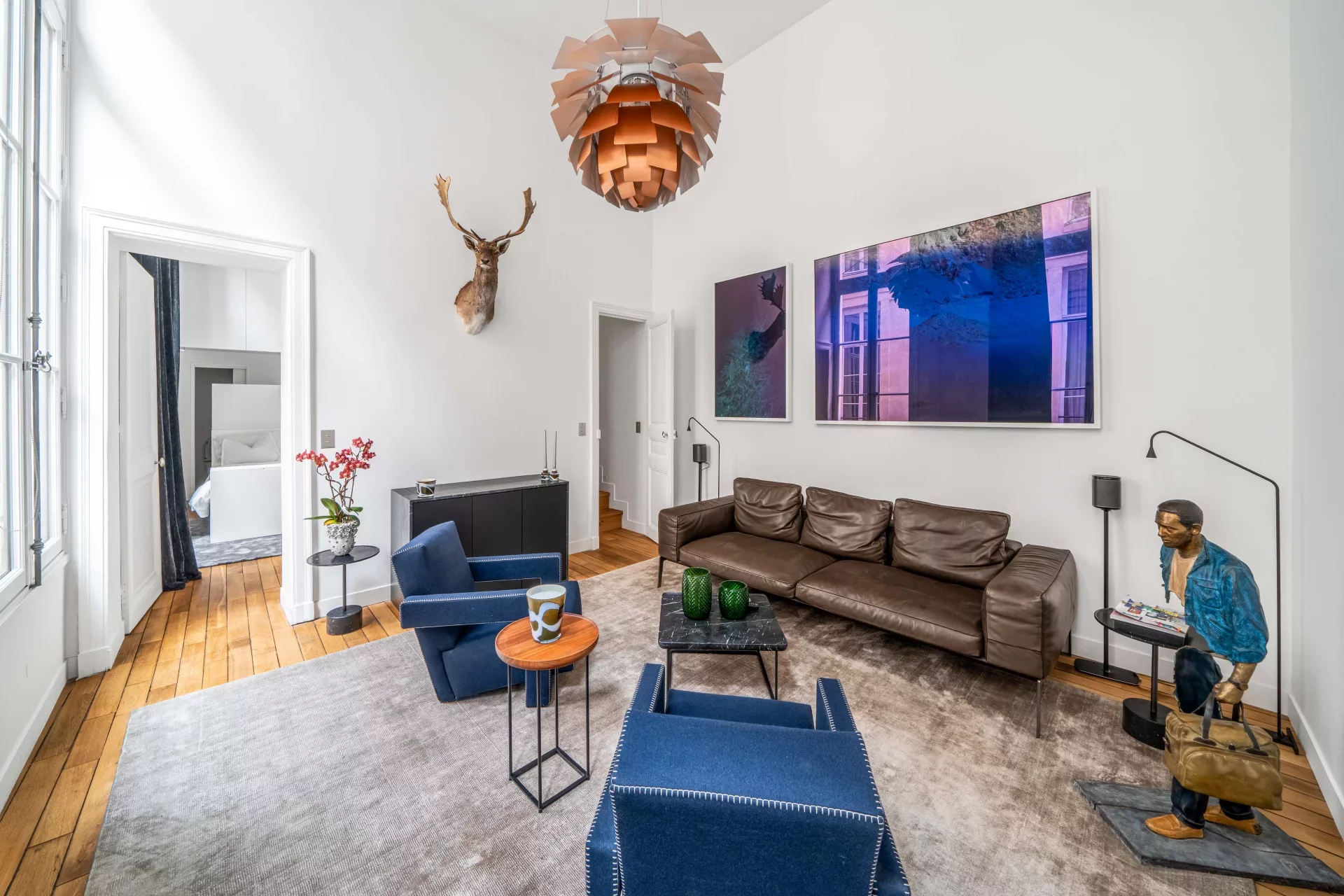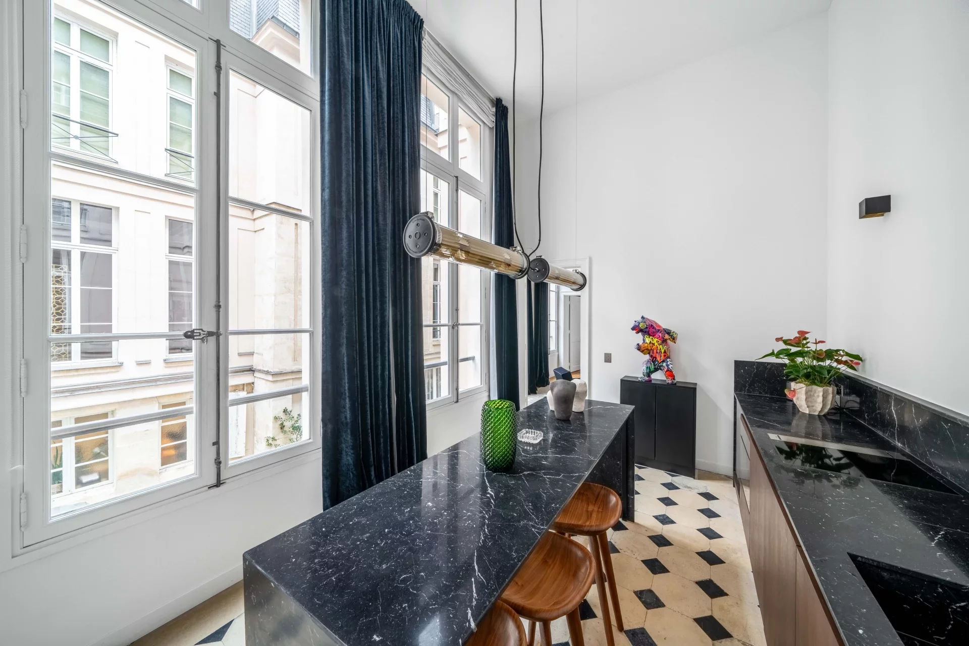 This sublime three-room 83.19sqm loi Carrez apartment is on the second floor with elevator of a beautiful, well-maintained old building with janitor. With 4.55m high ceilings, the space-saving layout comprises an entrance hall, a living room, a separate kitchen, two bedrooms including a mezzanine master suite.