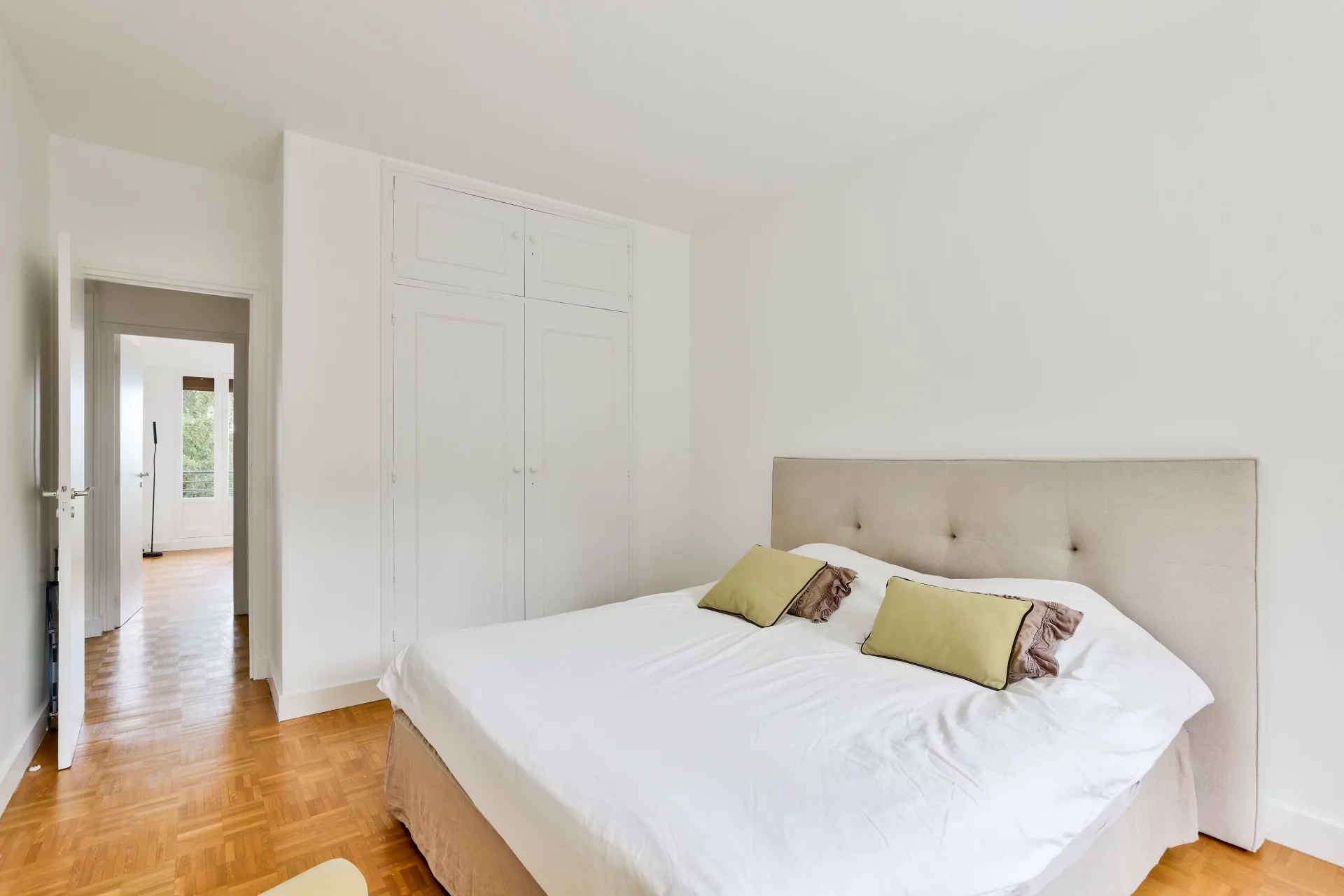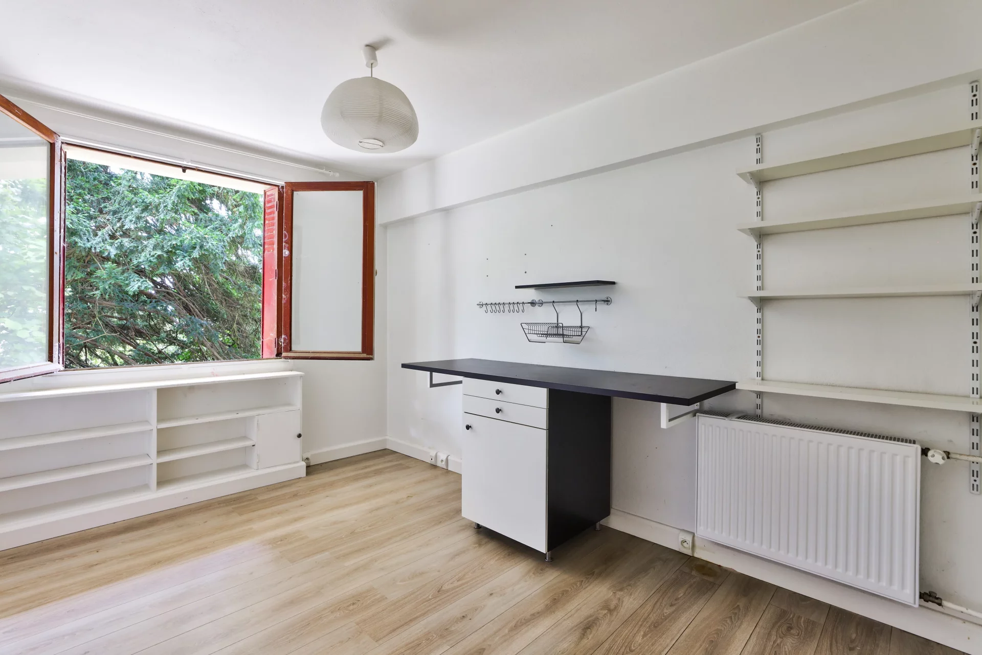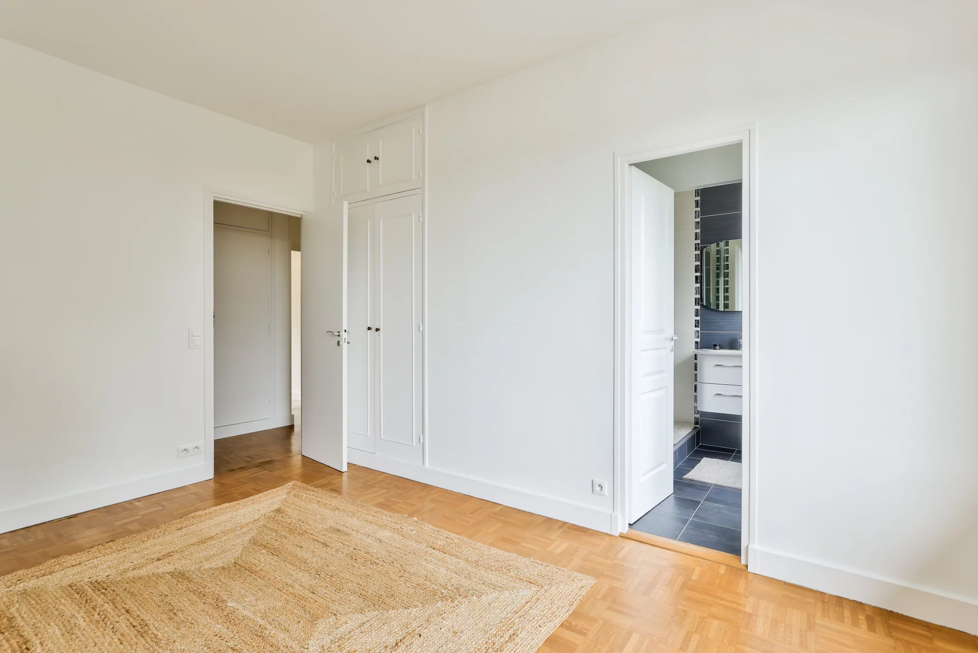 Located in an elegant, secure residence with elevator, this property captivates from the moment you enter, with its generous volumes and omnipresent luminosity. The vast entrance hall leads to a spacious double living room with large picture windows opening onto a south-facing balcony, ideal for enjoying the surrounding countryside. This reception area of almost 50sqm can easily be reopened onto a 22sqm bedroom, which was originally the dining room. The large, fully-equipped eat-in kitchen also offers an unobstructed view of the greenery.