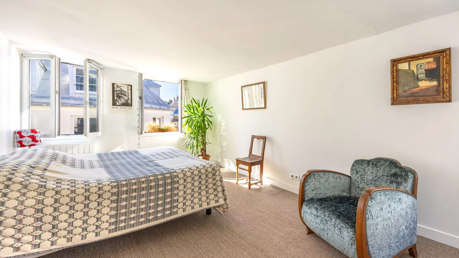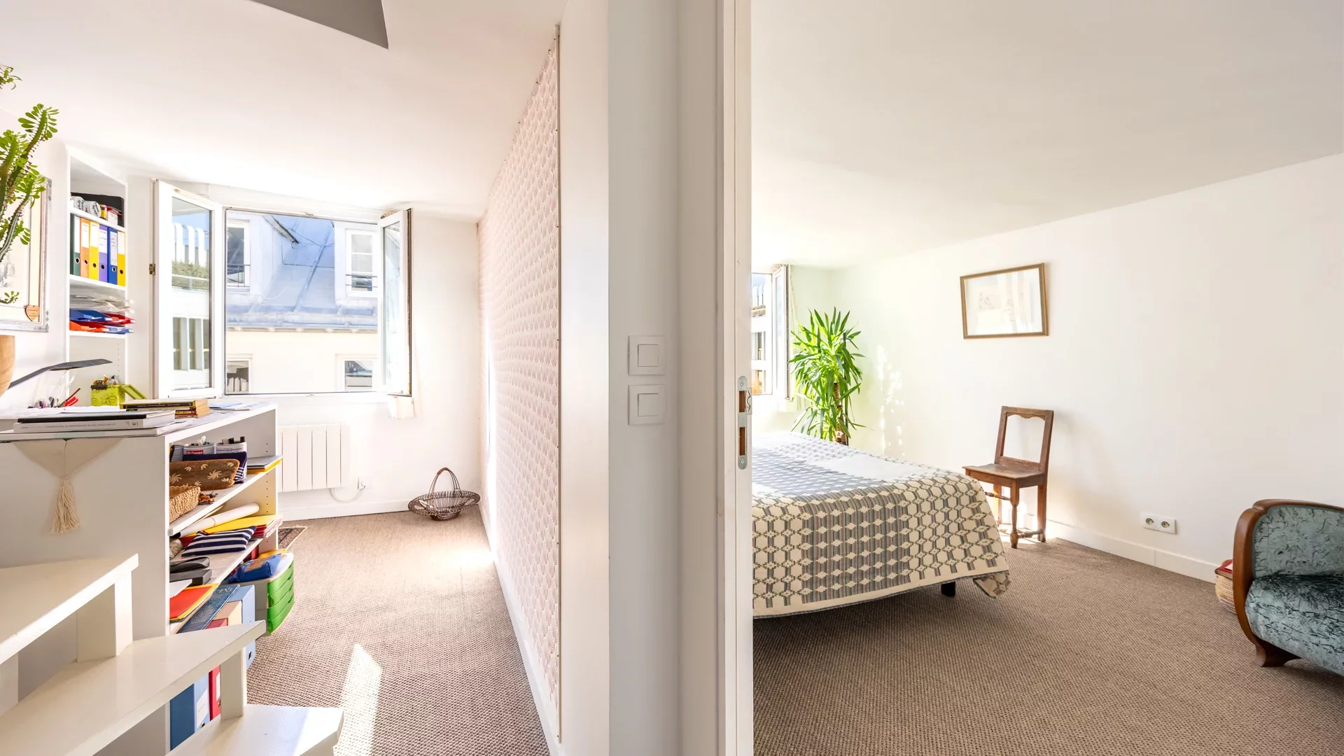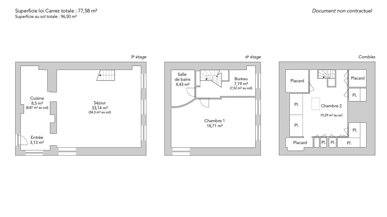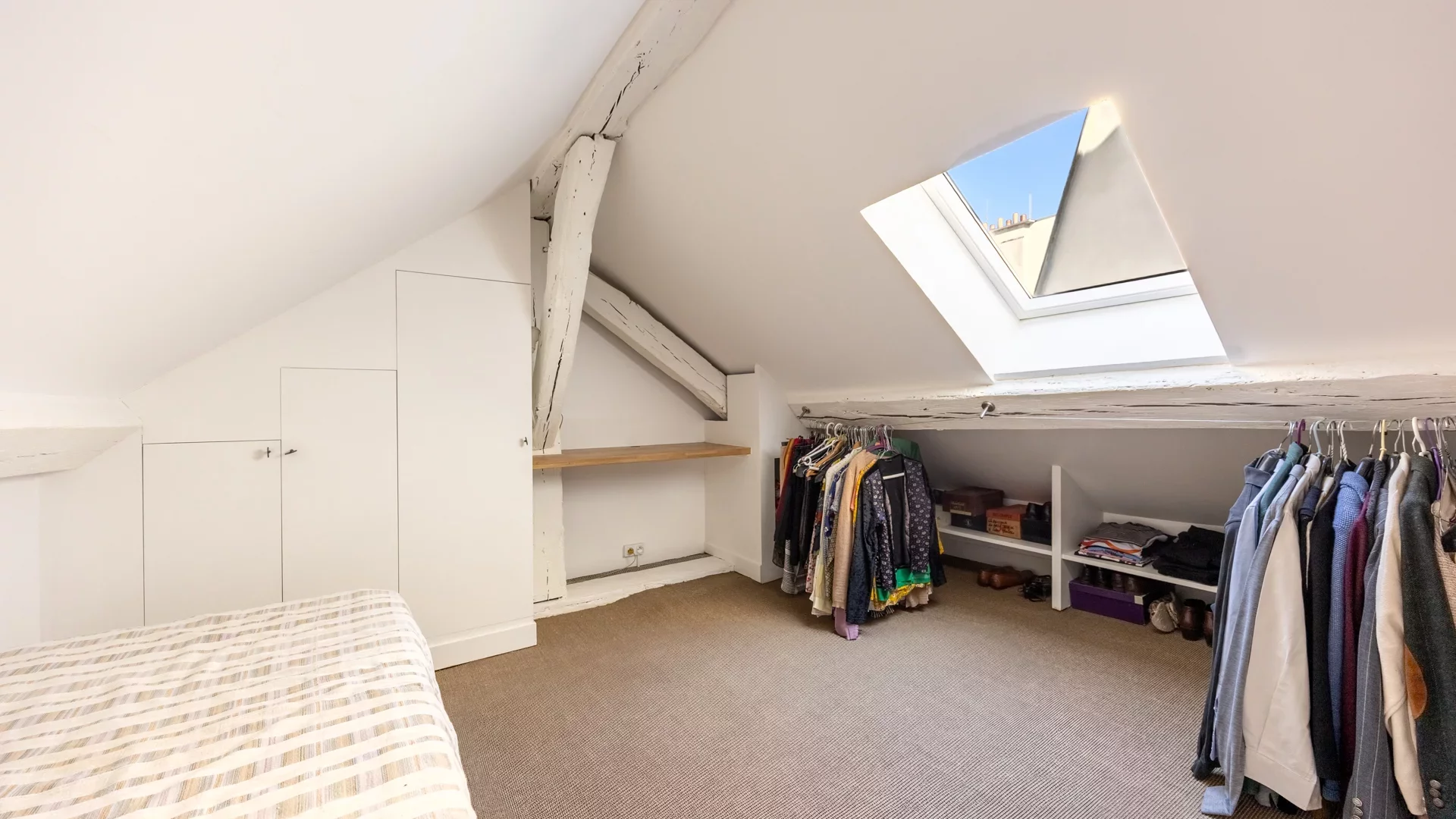 Located on the top three staircases of an attractive building, this atypical triplex with 96.01m² of floor space (76.76m² loi Carrez) comprises, on the first level: an entrance hall, fitted kitchen and vast 33.14 m² living room. On the second floor, a large bedroom (which could be converted into two bedrooms), a shower room with toilet and a landing converted into an office space. An additional bedroom is located on the top floor. Optimized layout, warm atmosphere. Sought-after location in the heart of Paris, close to all amenities.