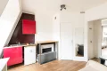 It offers lovely views over the rooftops of Paris and comprises an entrance hall with cupboards, a living room, a bedroom, a dining room with kitchen and a shower room with toilet.