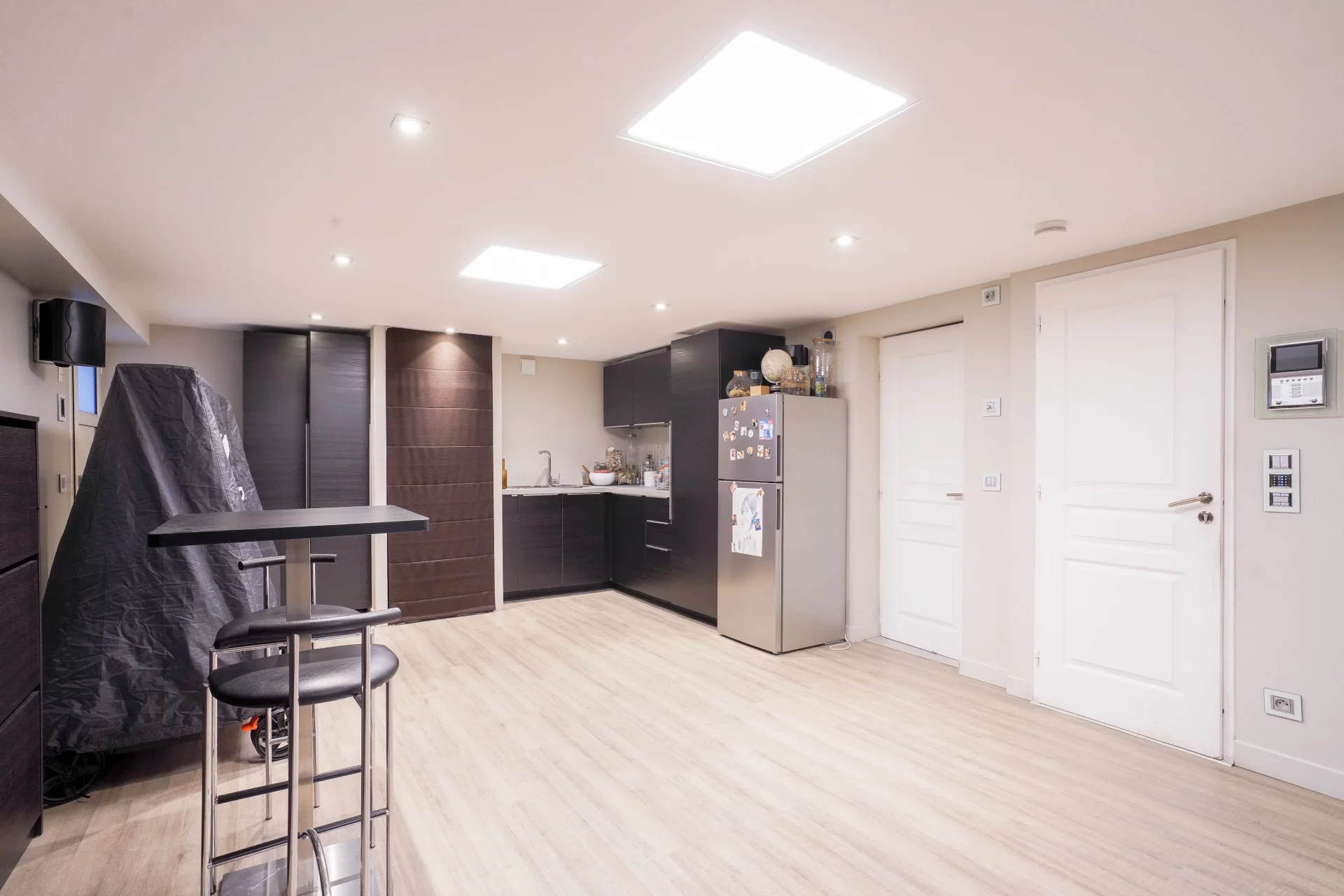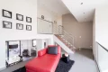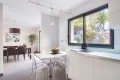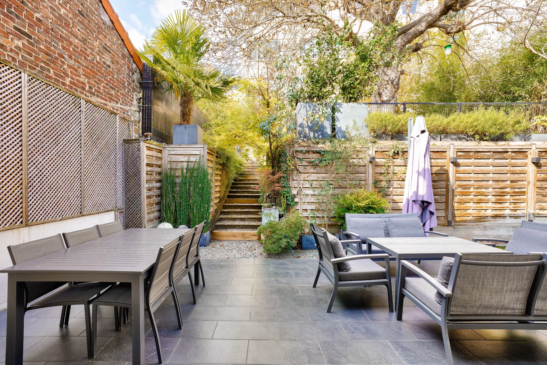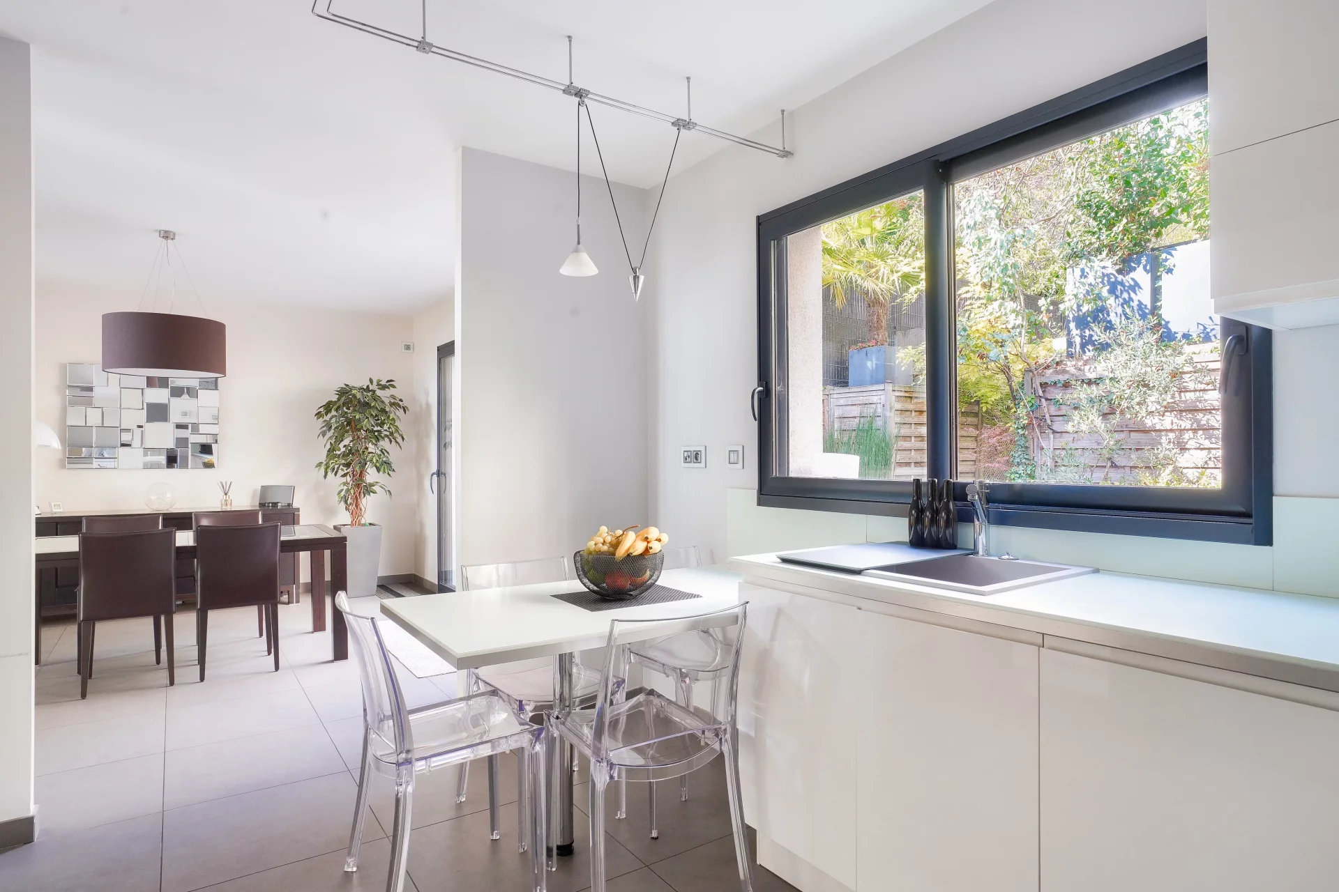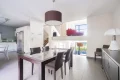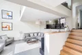 The heart of the house revolves around a vast cathedral living room with almost 5-meter high ceilings, bathed in light thanks to its high bay windows. A few steps lead up to the dining area and the semi-open, convivial and functional kitchen, which opens directly onto an intimate terrace surrounded by greenery. Together, they form a living space of over 70 sqm, ideal for entertaining.
