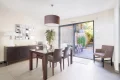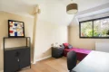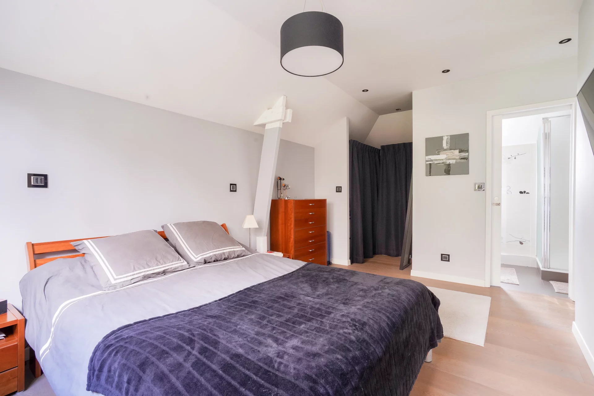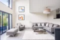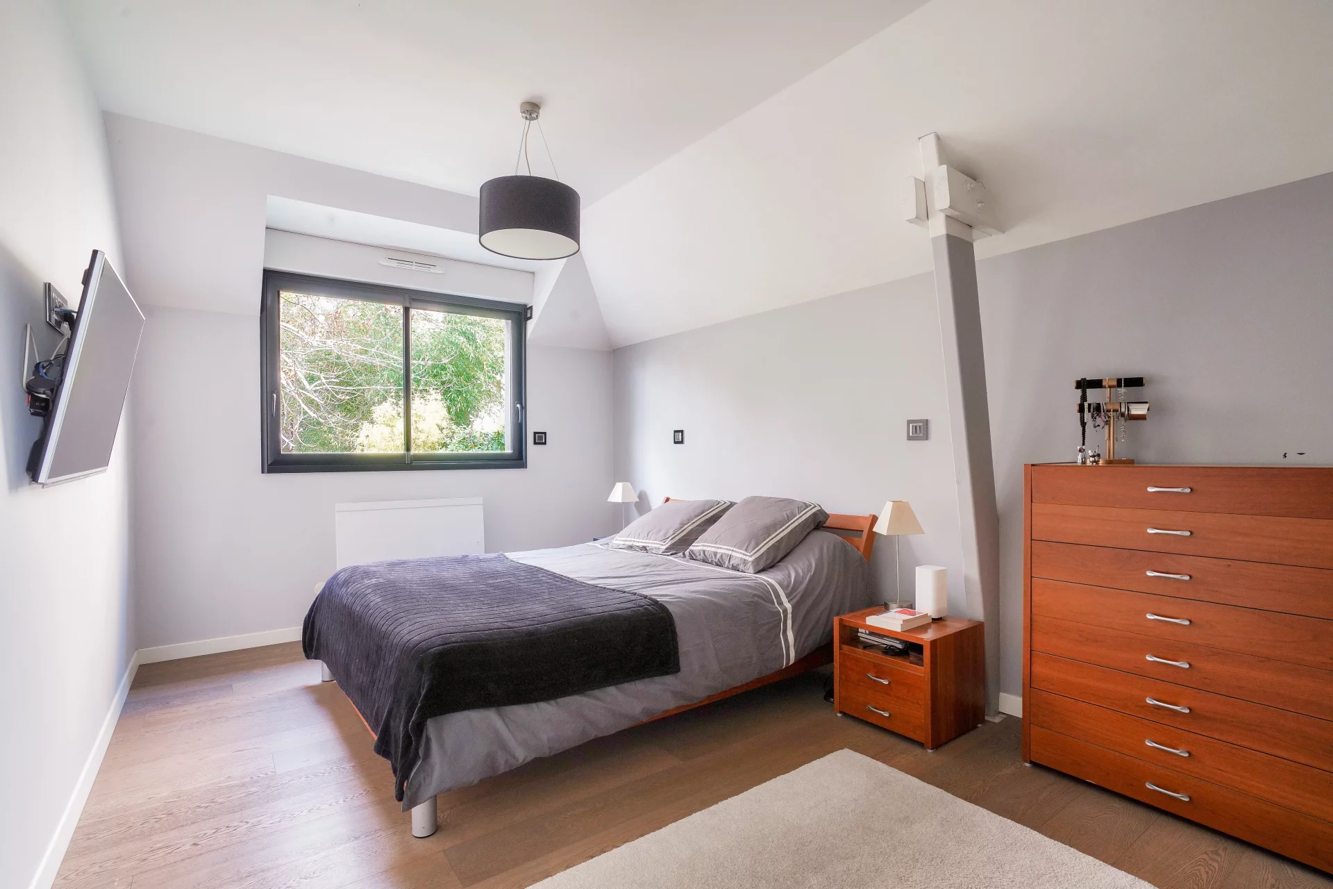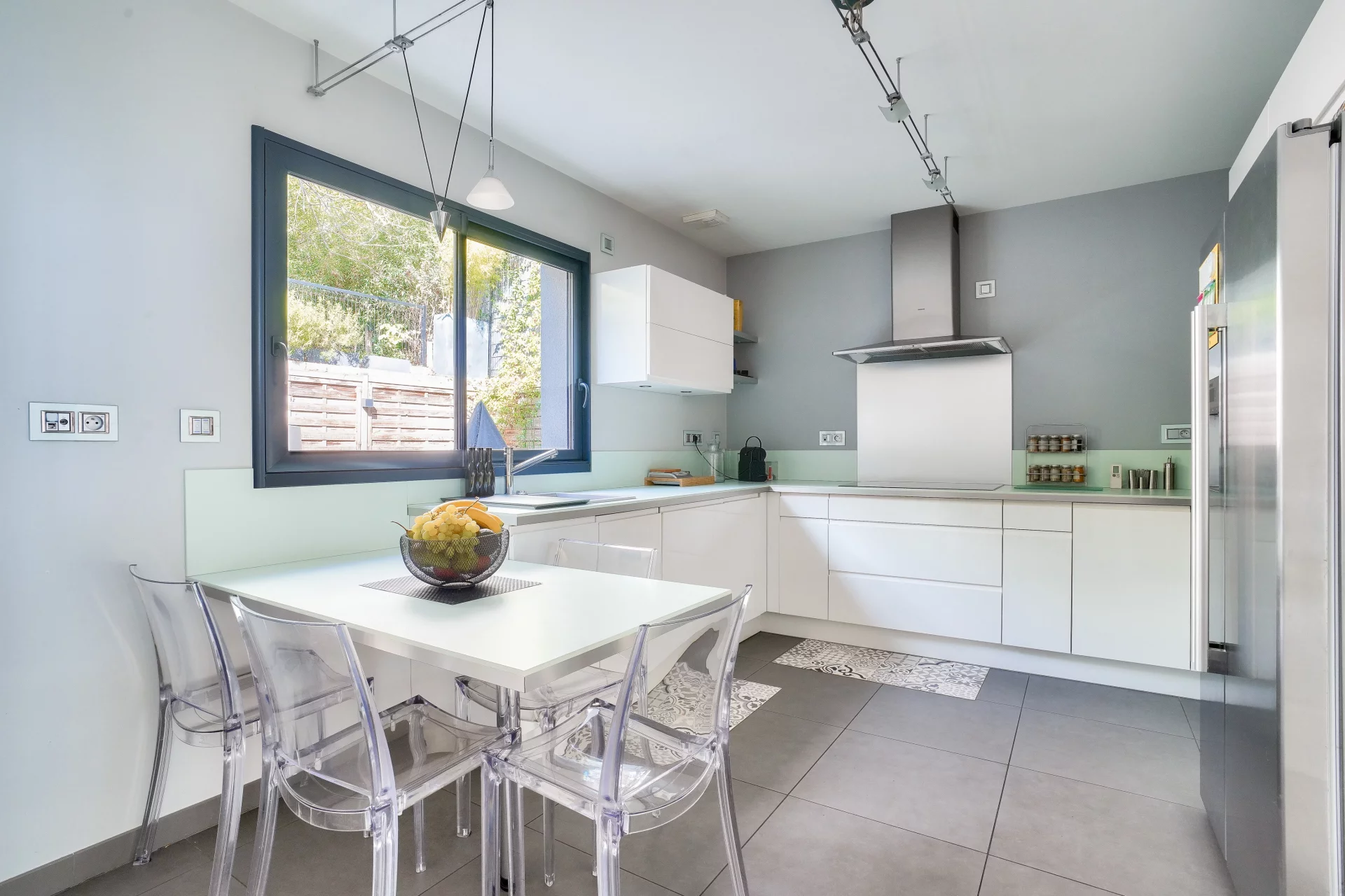 The heart of the house revolves around a vast cathedral living room with almost 5-meter high ceilings, bathed in light thanks to its high bay windows. A few steps lead up to the dining area and the semi-open, convivial and functional kitchen, which opens directly onto an intimate terrace surrounded by greenery. Together, they form a living space of over 70 sqm, ideal for entertaining.