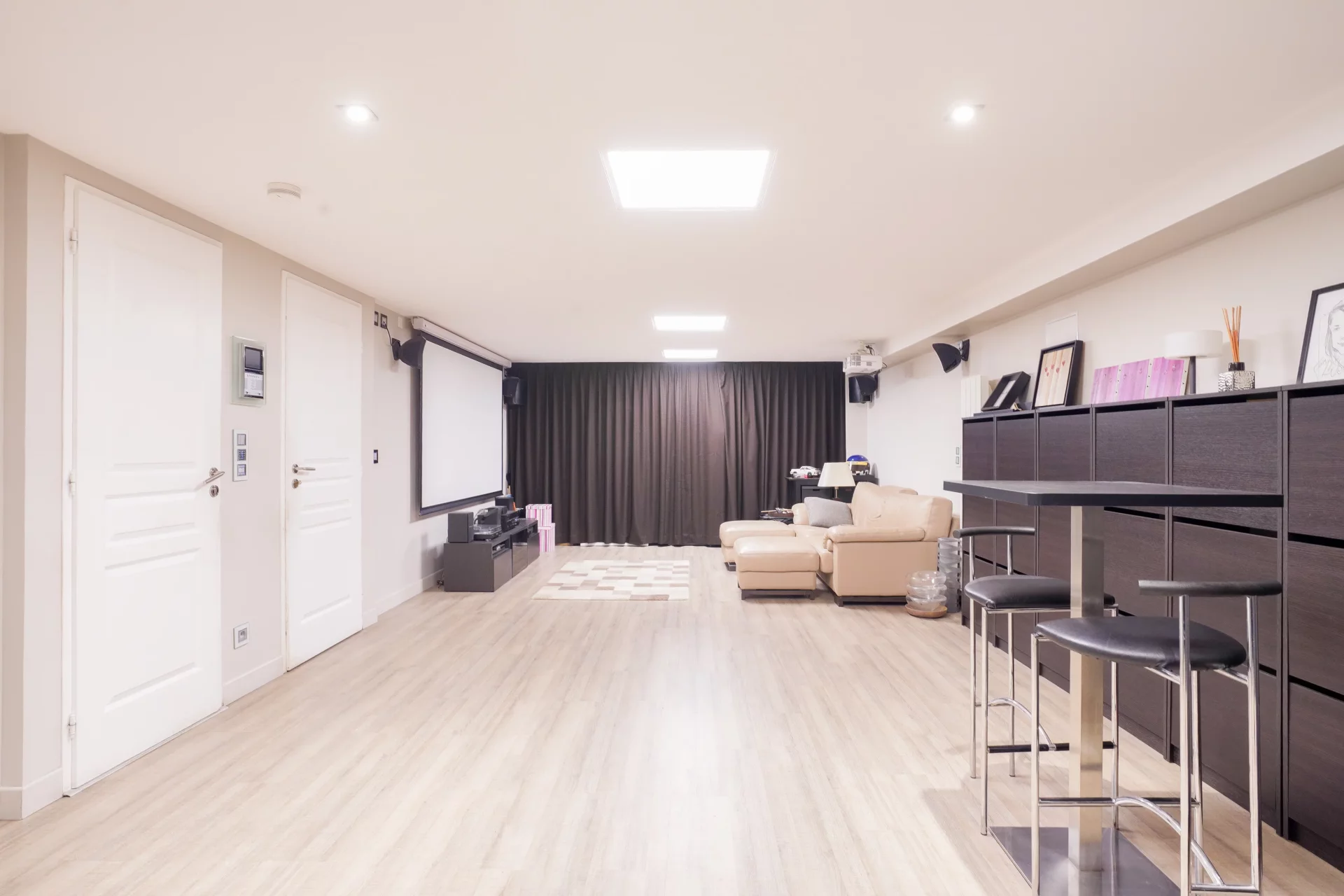 The house also boasts a 45 sqm cinema room with kitchenette, plenty of storage space and an enclosed garage equipped with an electric charging station. Modern comforts include underfloor heating, advanced home automation, video surveillance, automatic watering and a water recovery tank.