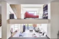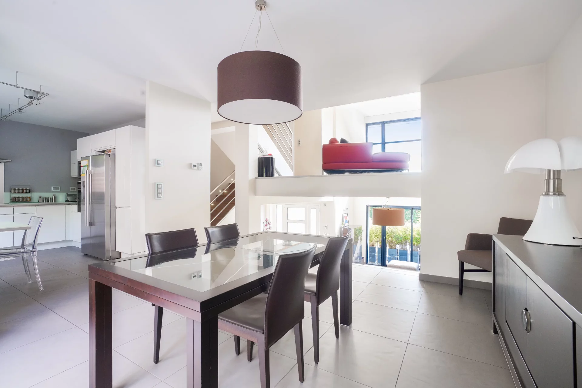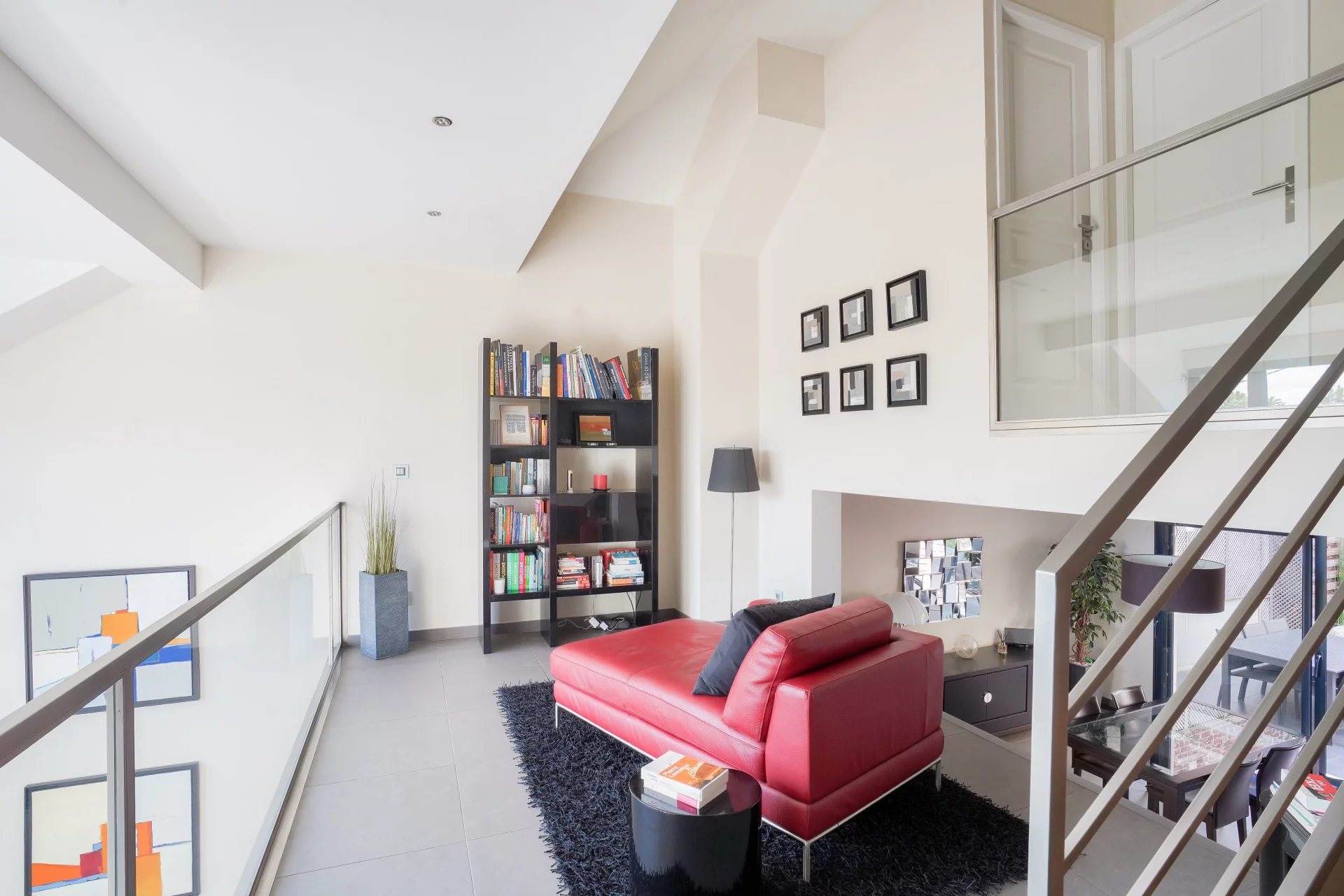 On the intermediate floor, a mezzanine suspended over the living room offers a charming reading or office space.