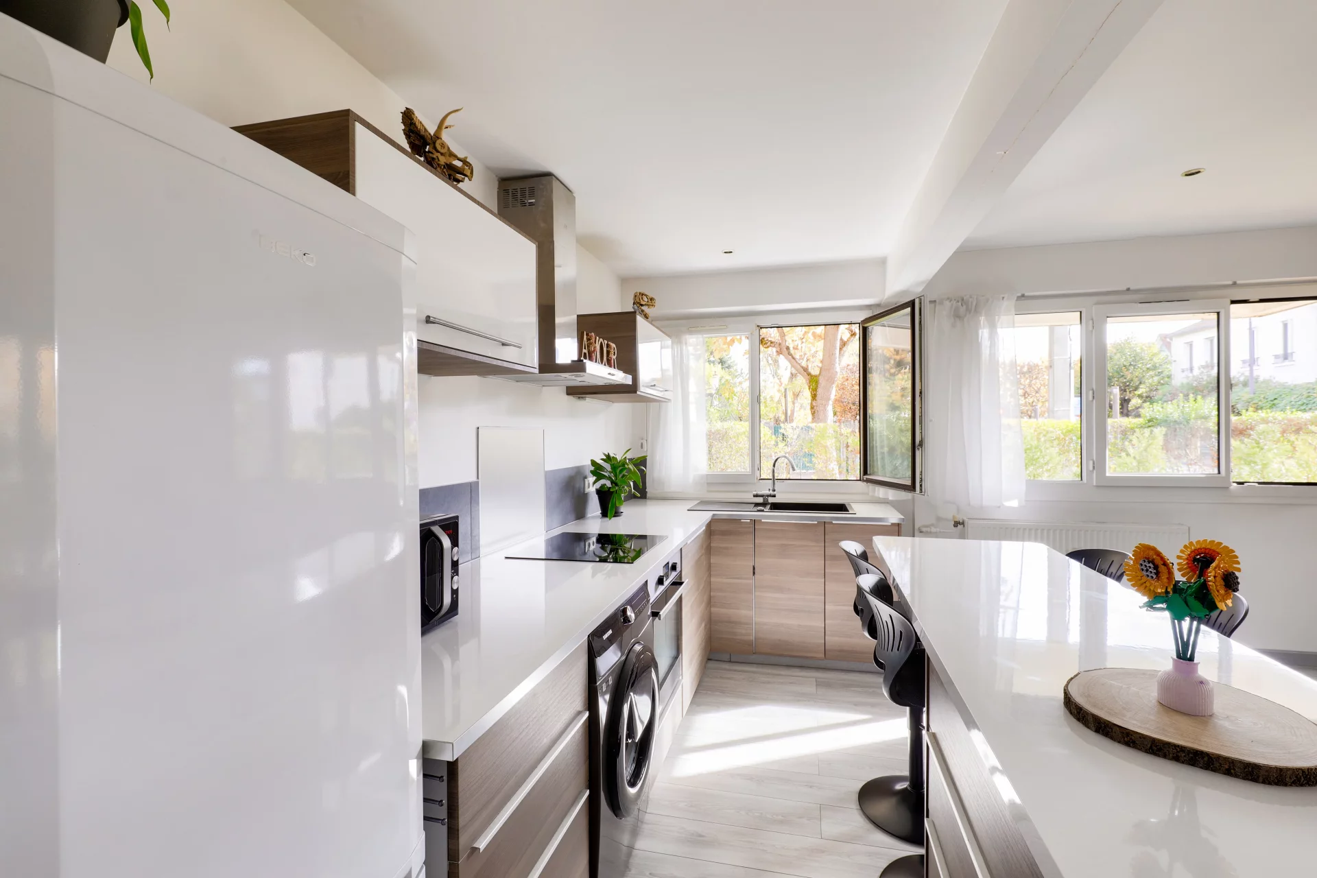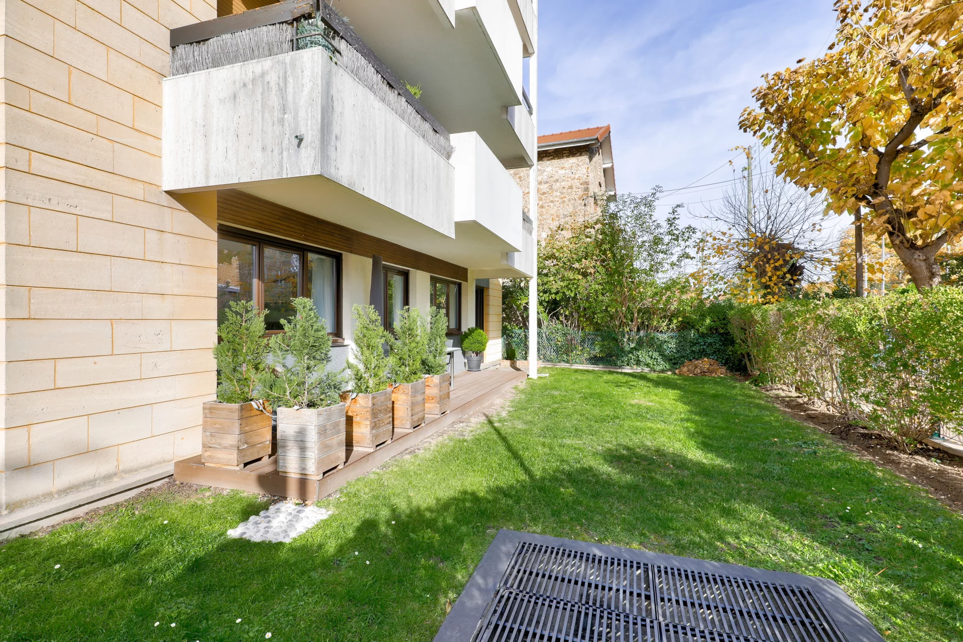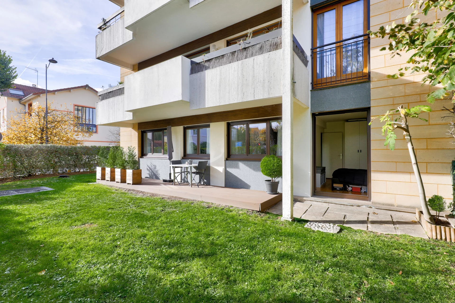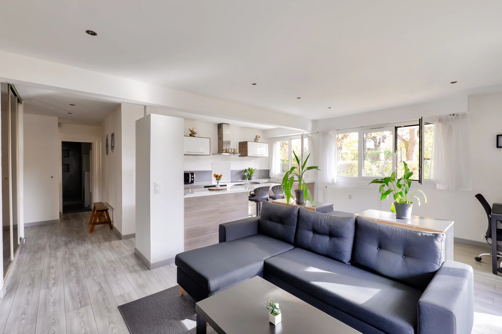 It comprises a welcoming entrance hall with storage space, a generous living room extended by a modern open-plan kitchen. The property benefits from ideal exposure and provides ground-level access to a pleasant terrace and garden.