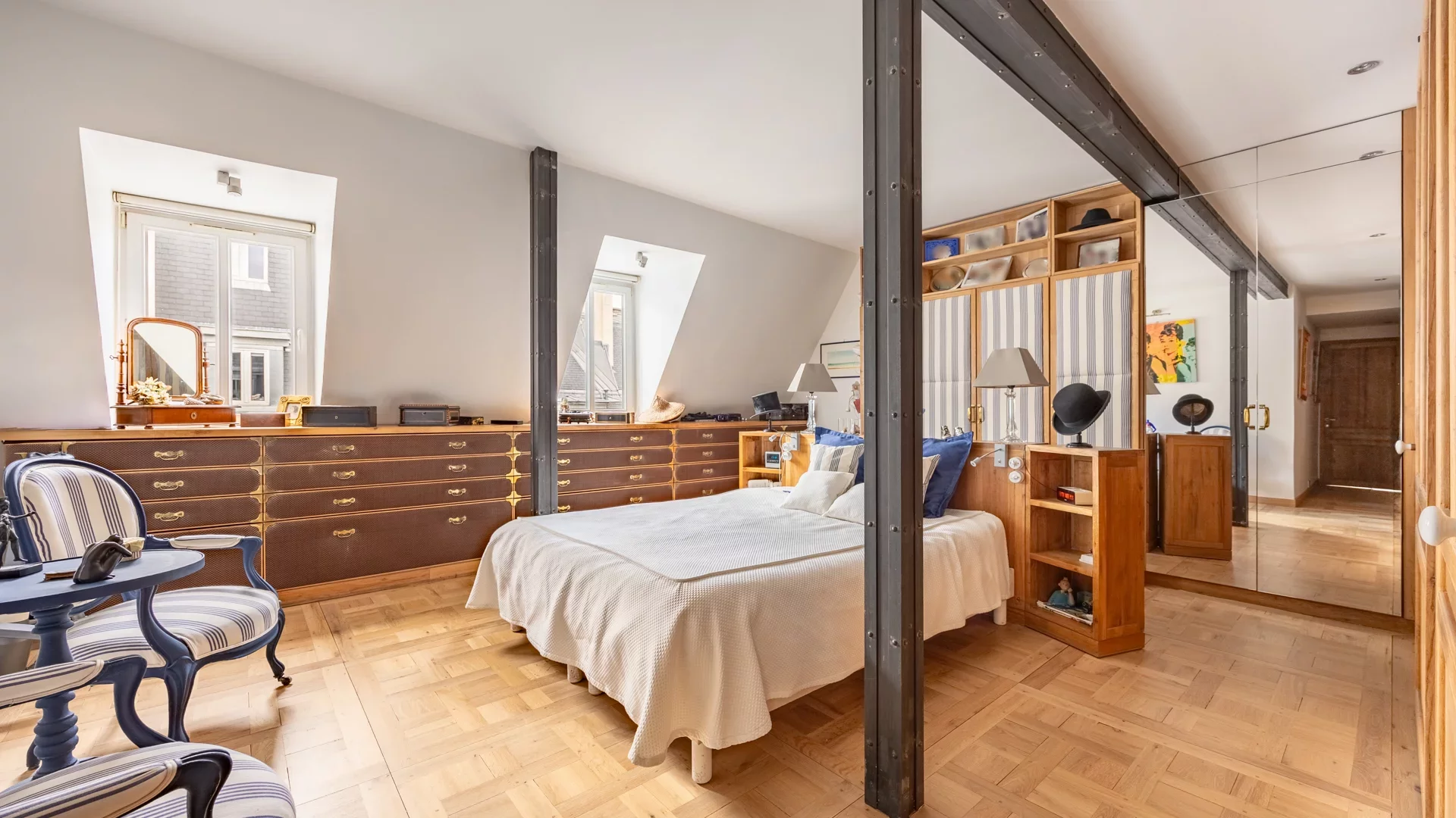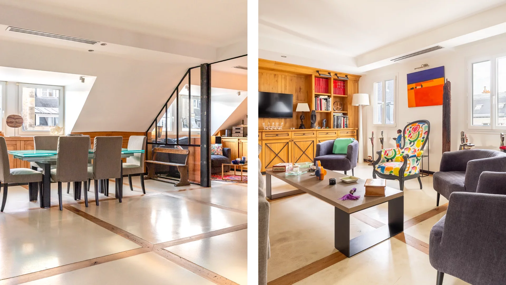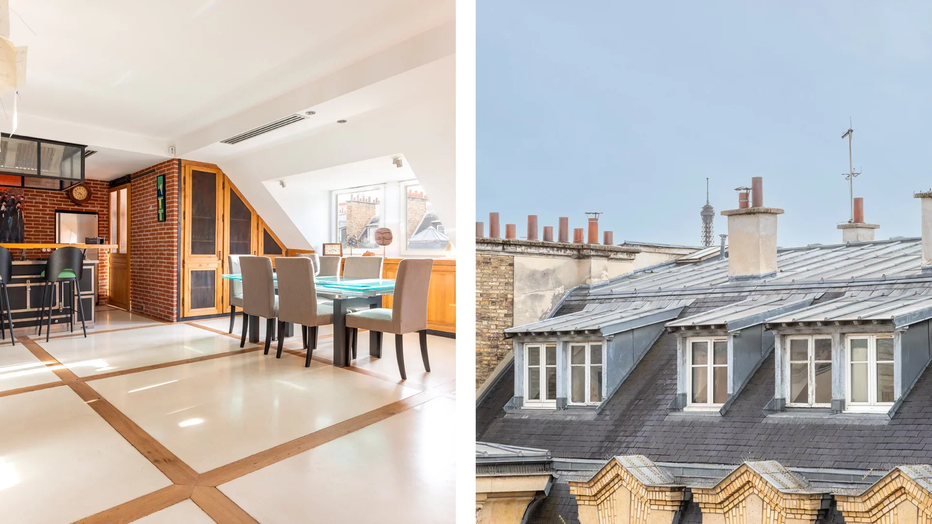 With a surface area of 161.91sqm, it comprises a vast 79sqm double living room with open kitchen, a real convivial living area bathed in light, offering an unobstructed view over the rooftops of Paris.