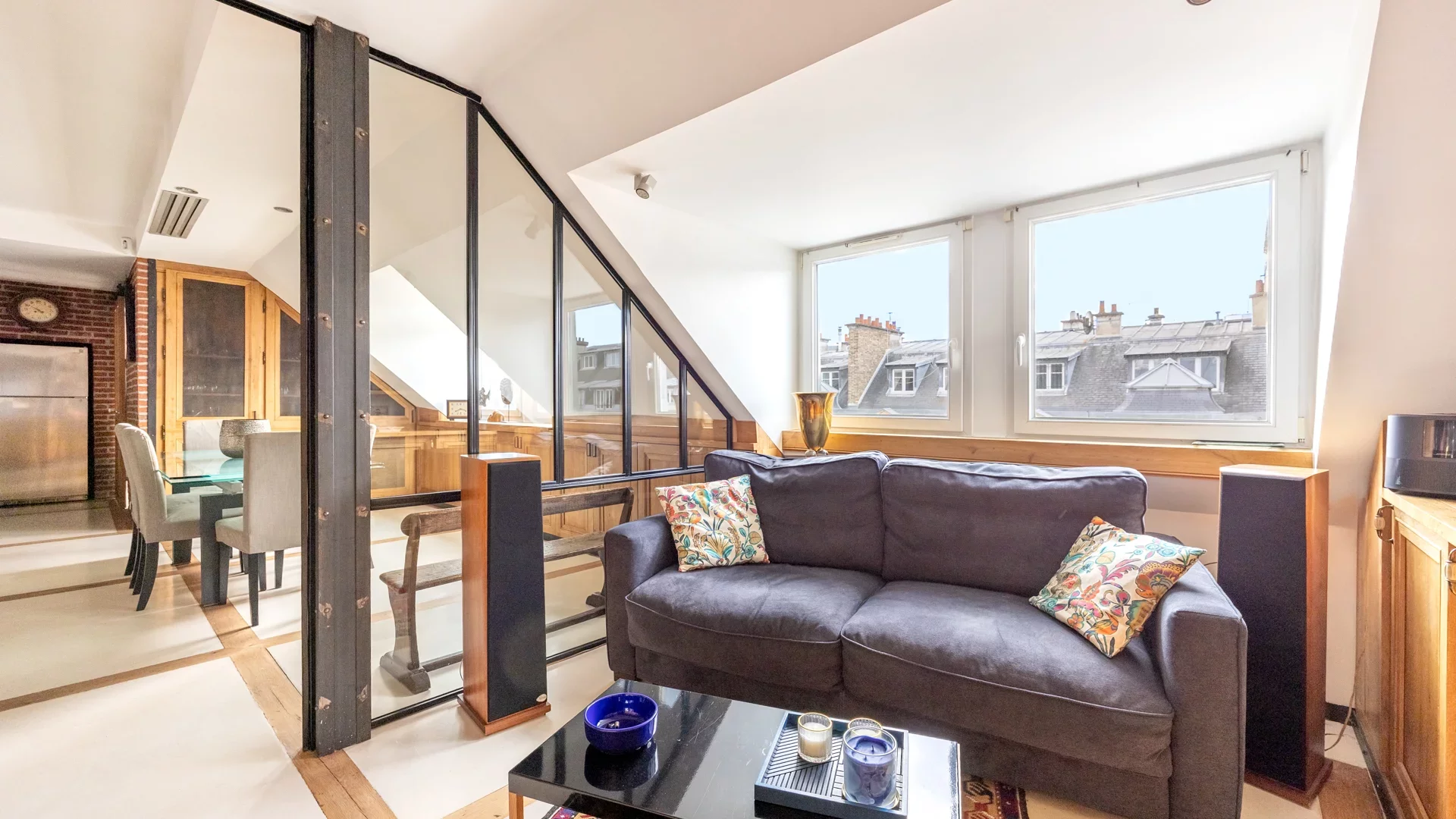 Located on the 7ᵉ floor of a high-class Haussmann building, this atypical apartment seduces with its charm, brightness and beautiful volumes.