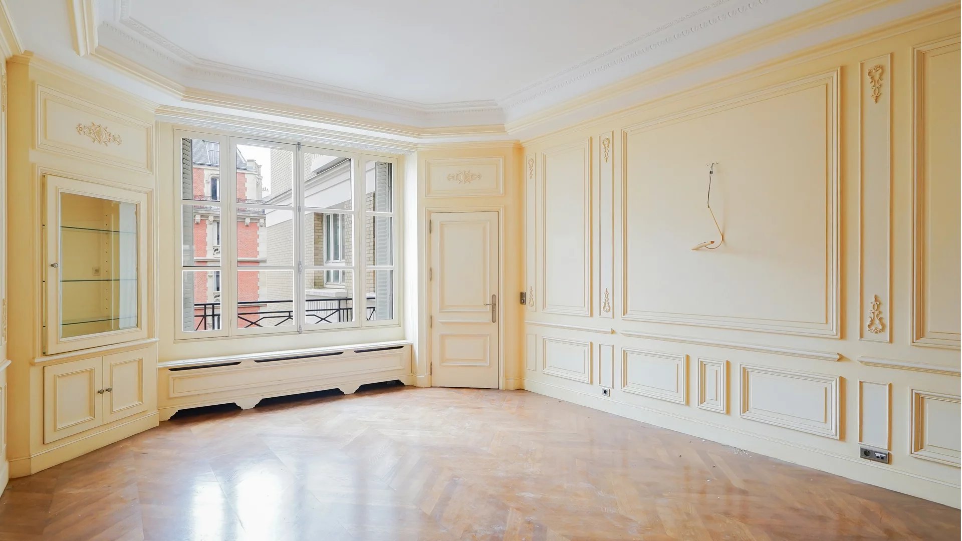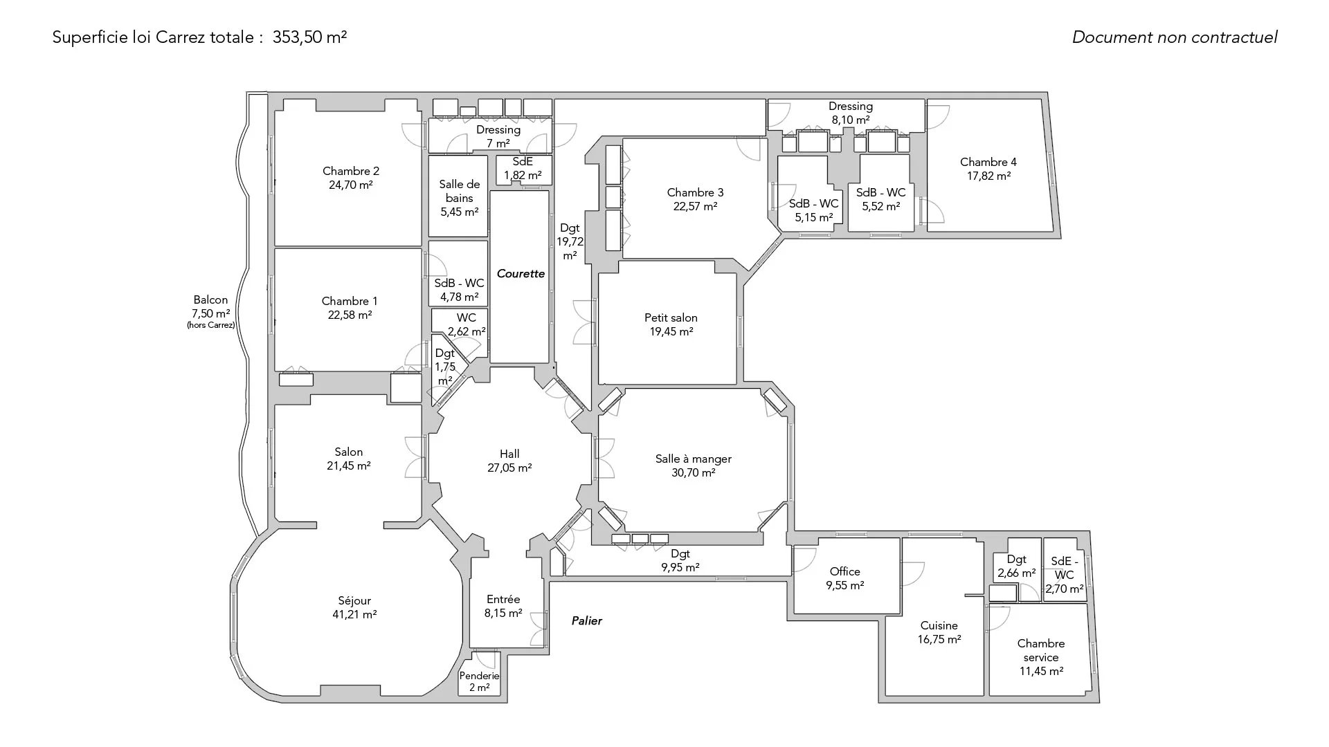 In a sublime building dating from the 1930s, with remarkable common areas and a janitor, a magnificent 353.50sqm apartment. It opens onto both rue du Conseiller Collignon and boulevard Émile Augier. Located on the fourth floor with elevator, it comprises an entrance opening onto a vast rotunda serving, on the street side, a double reception room with balcony and a bedroom with en-suite bathroom and separate toilet, then, on the boulevard side, a dining room. A hallway leads to a pantry, the kitchen and a studio with shower room and washroom. A second hallway with cupboards leads to the three other bedrooms, one on the street and the other two on the boulevard, each with a full en-suite bathroom.
