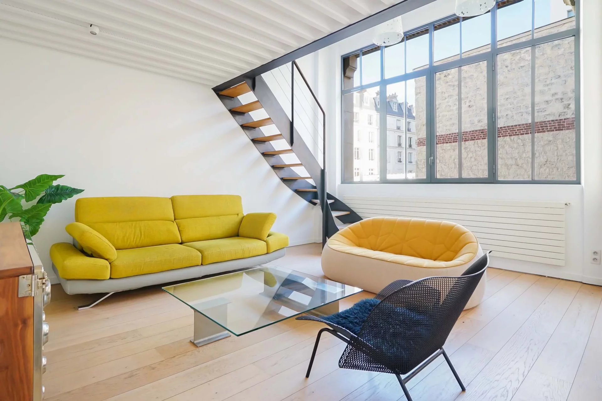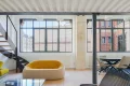 The apartment comprises an entrance hall, a superb living room bathed in light thanks to its large studio windows and 3.75m high ceilings, a fully-equipped open kitchen, a dressing area and a separate toilet.