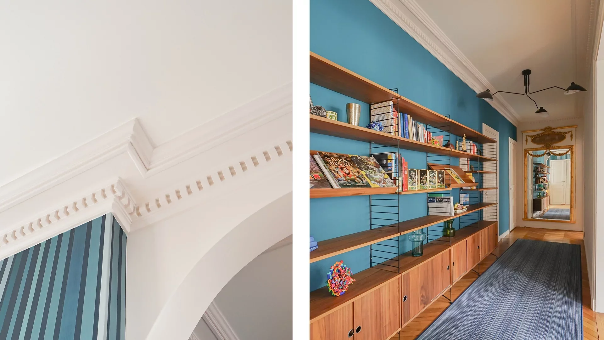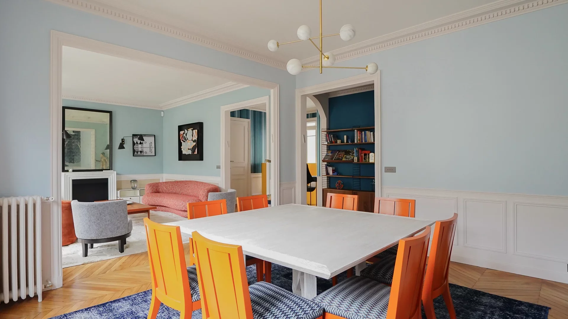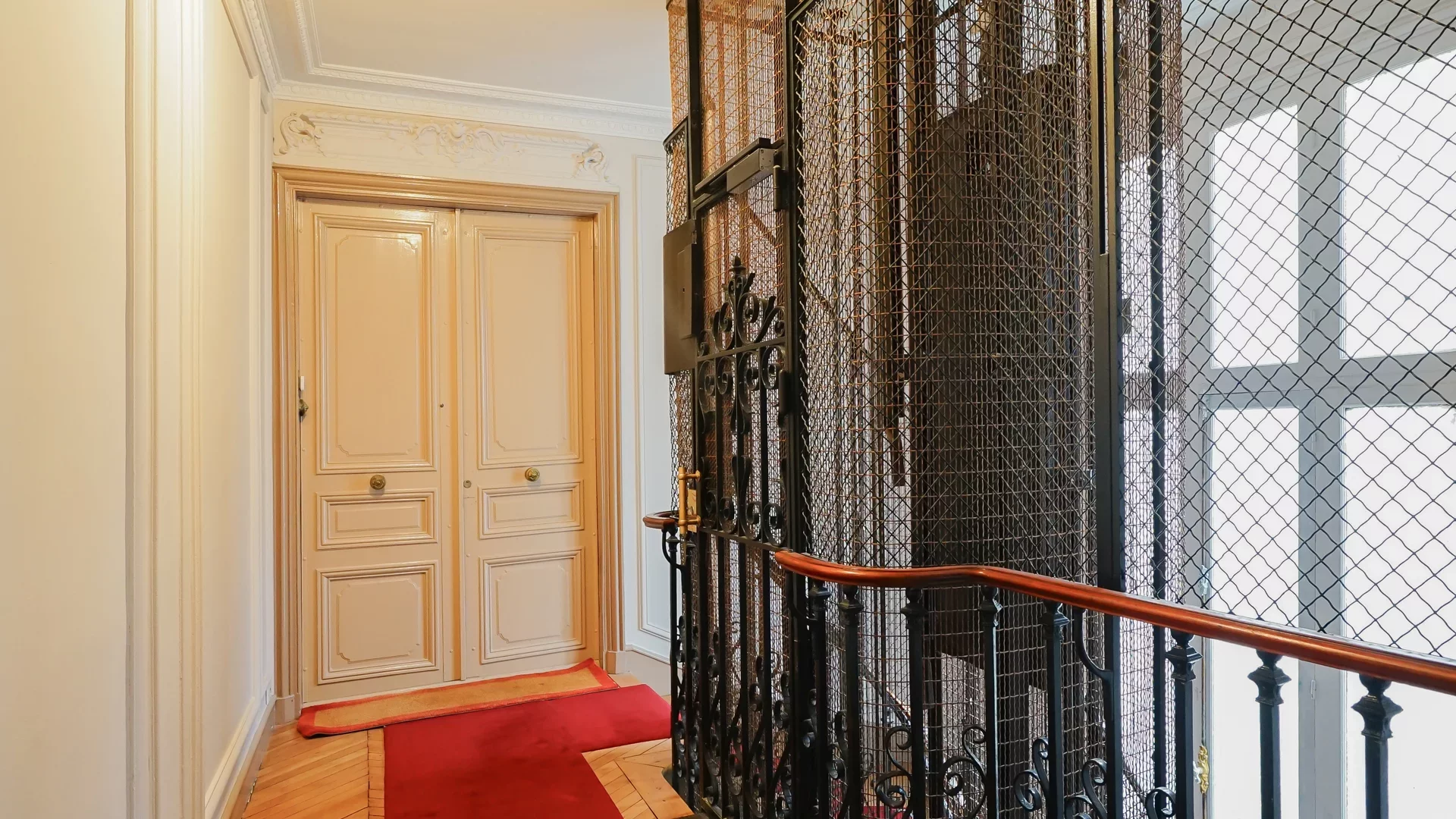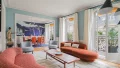 Very high ceilings. Old world charm preserved: parquet flooring, moldings and ethanol fireplace. Beautiful volumes.