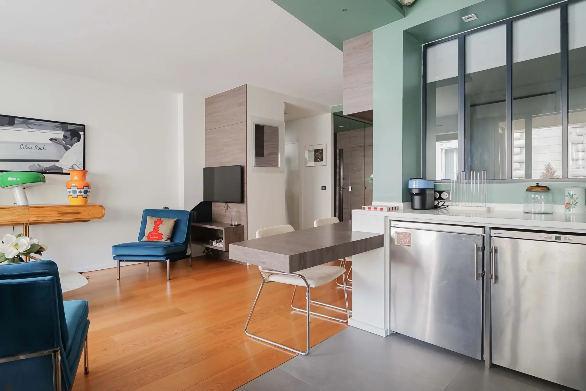 Located on the third floor by elevator of a very well-maintained recent building with janitor, it offers a functional ultra-compact layout and comprises an entrance hall, a living room opening onto the terrace, a fully-equipped open kitchen, a master bedroom, a second sleeping area or office with a glass roof over the living room, a shower room, separate toilet and plenty of built-in storage space.