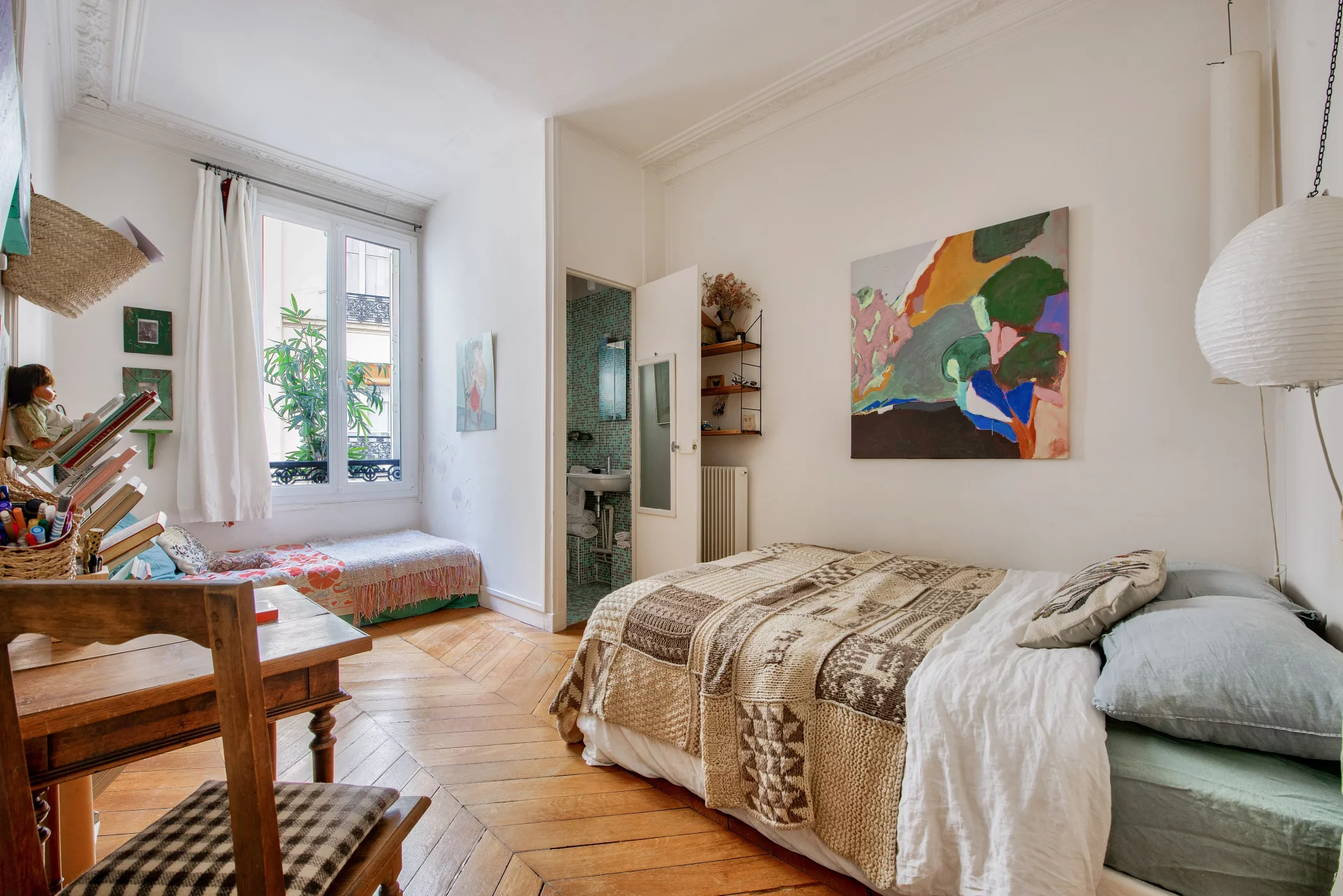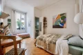 Very spacious. Old world charm (parquet flooring, moldings and fireplace). Plenty of storage space.