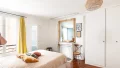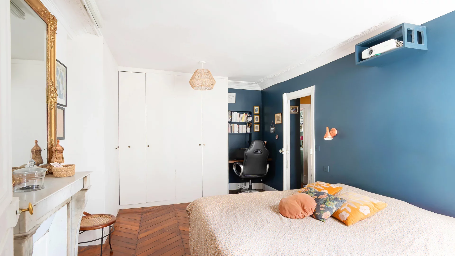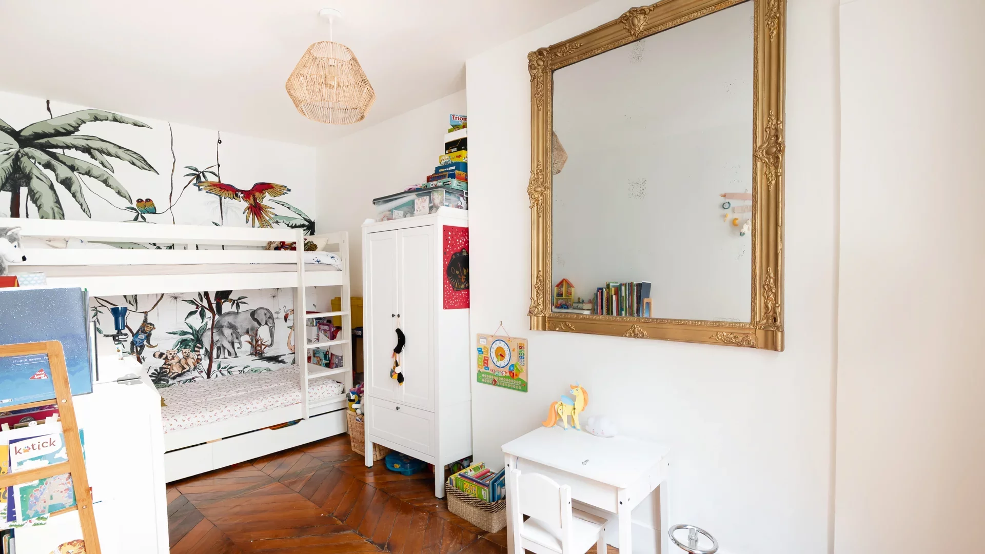 In excellent condition, it comprises a pleasant southeast-facing living room with fireplace, a fully equipped kitchen, a quiet bedroom overlooking the courtyard with plenty of storage space, an office area, an adjoining bathroom and a children's bedroom.