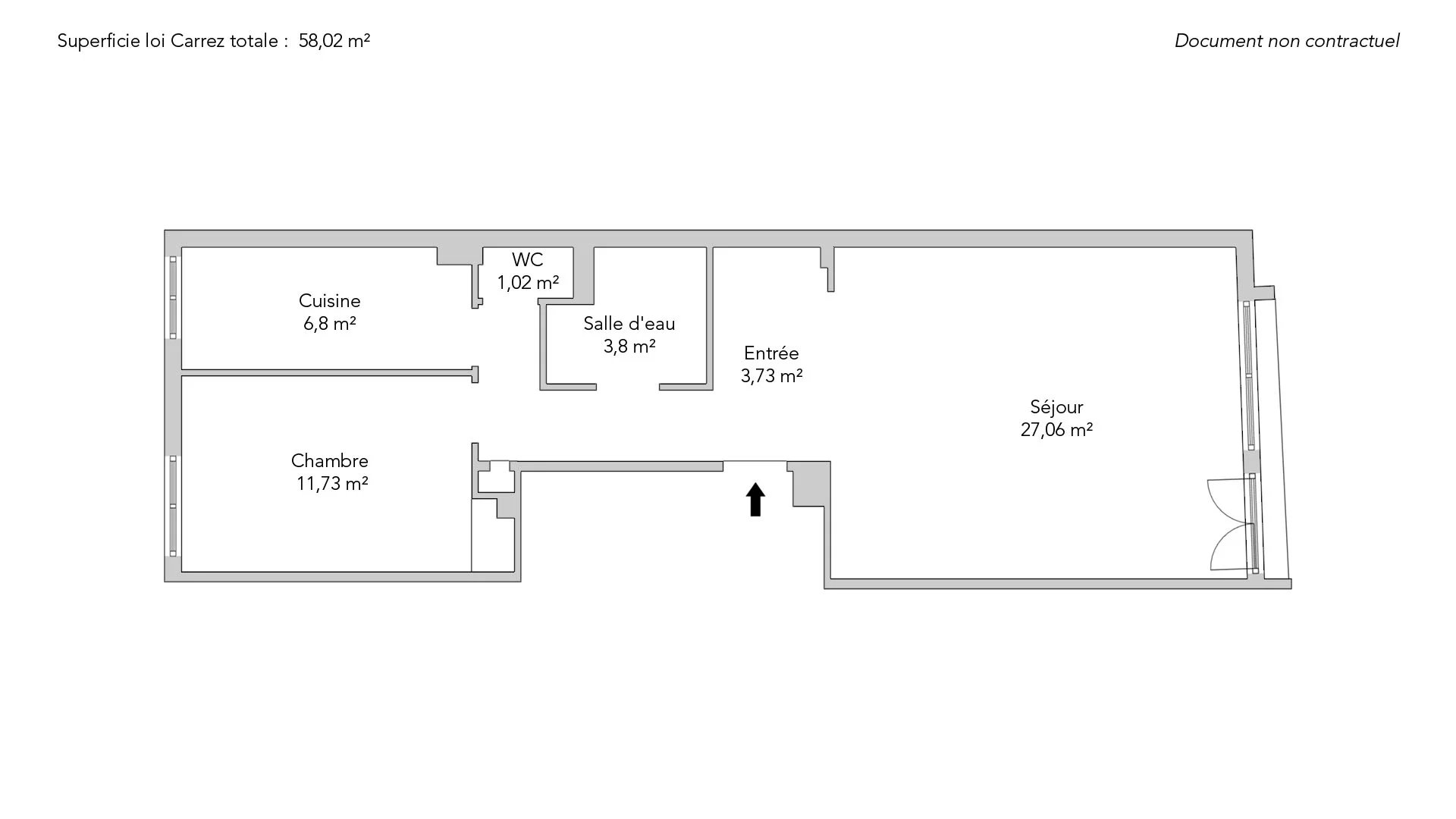 On the fourth floor by elevator of a secure, well-maintained building, 58.02sqm Carrez apartment.