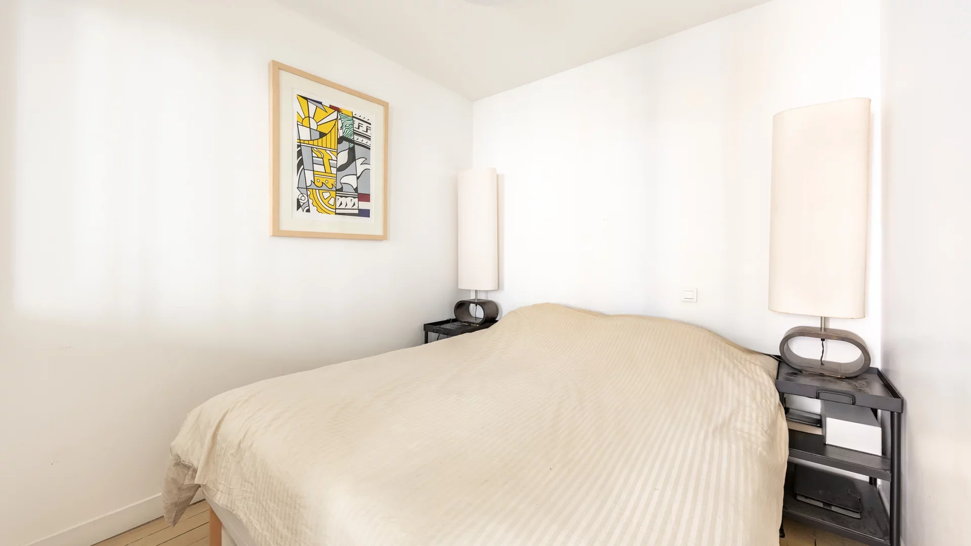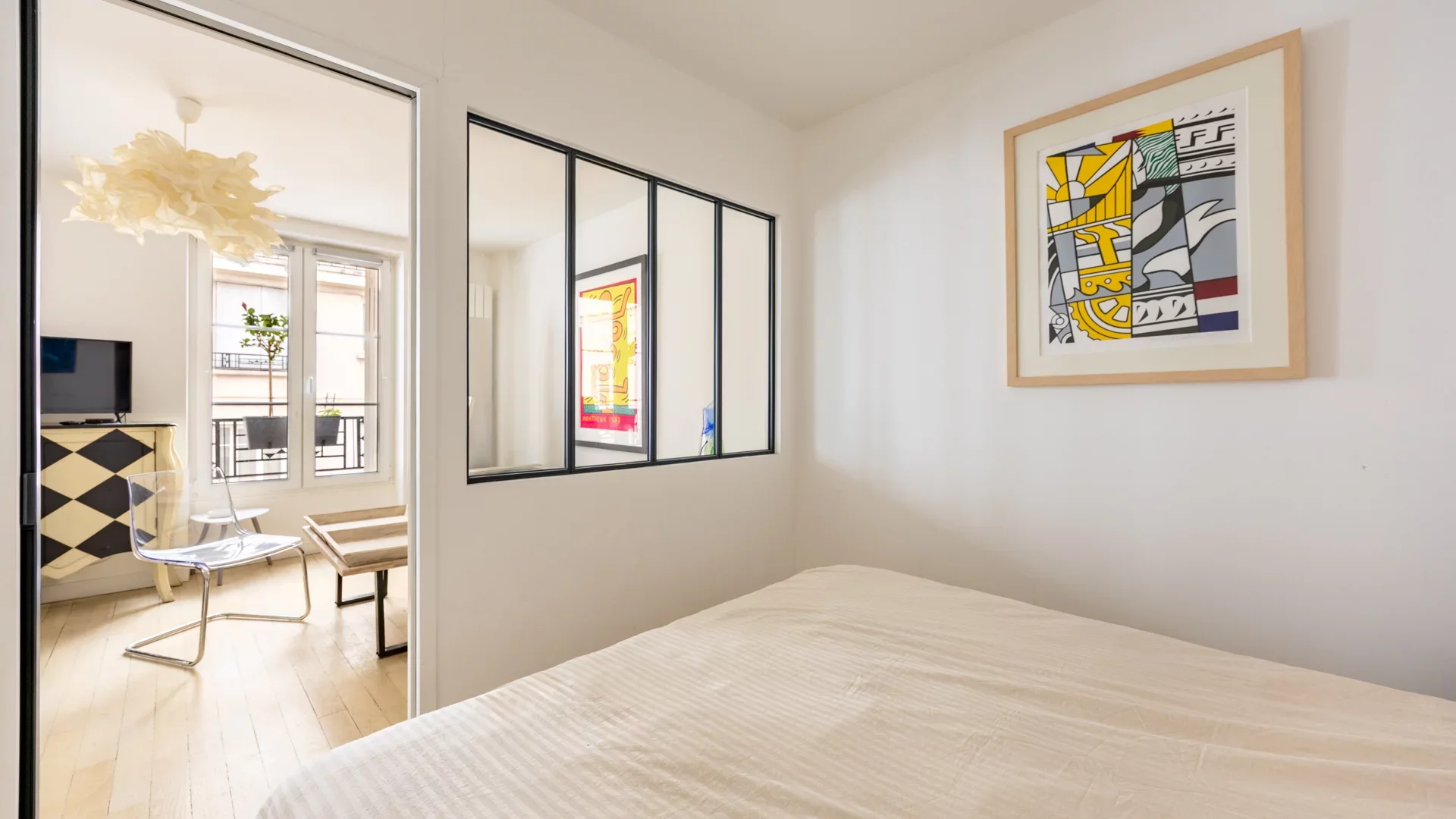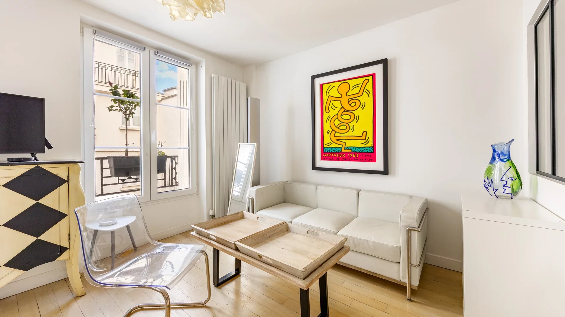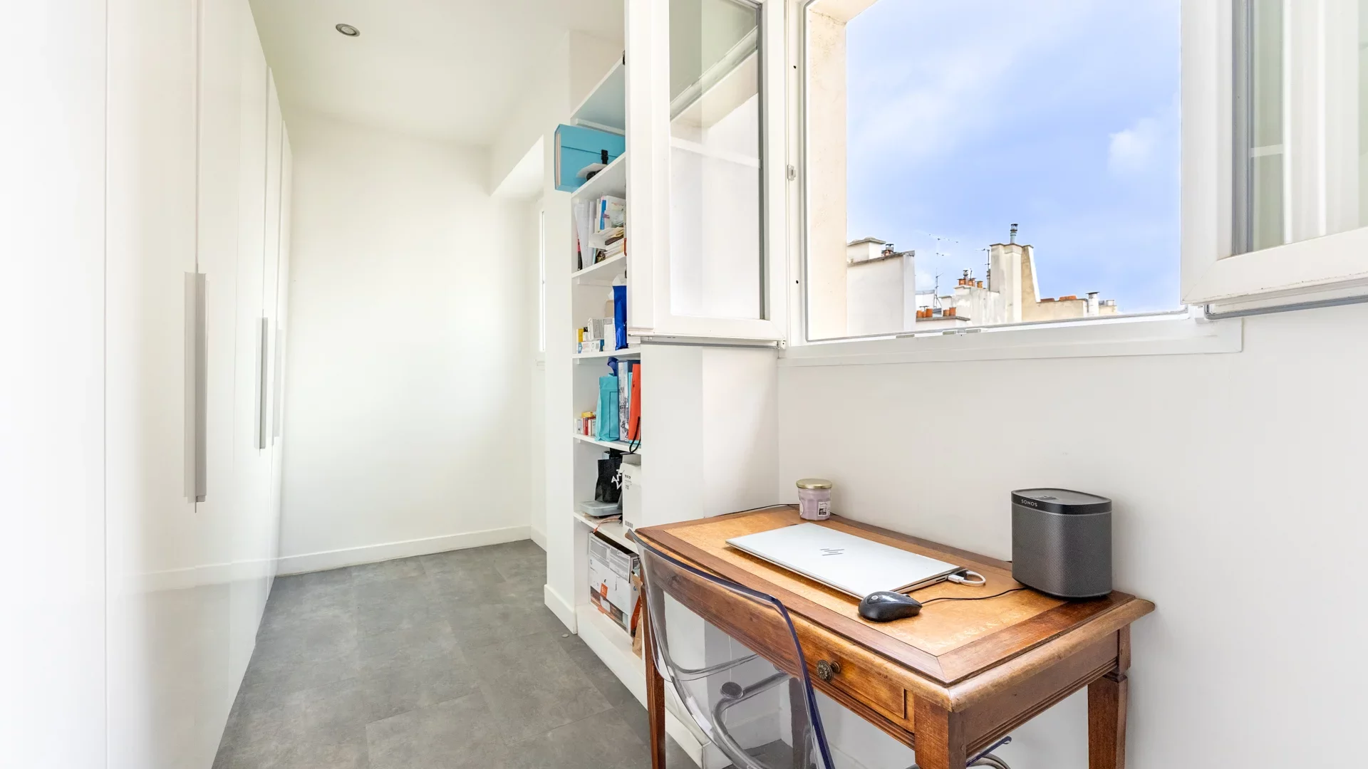 Featuring a compact and perfectly optimized layout, it comprises a living room with two windows opening onto a quiet courtyard, an open-plan fitted and equipped kitchen, a separate bedroom with a beautiful unobstructed view over the rooftops of Paris, a second bedroom on the second floor and a shower room with toilet.