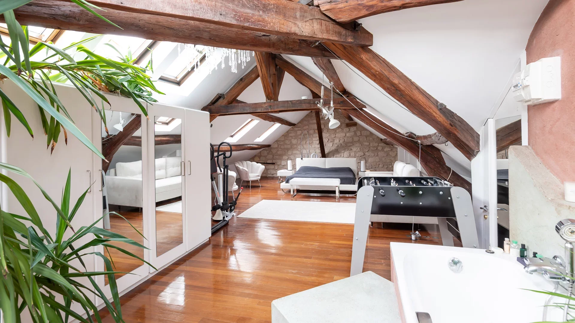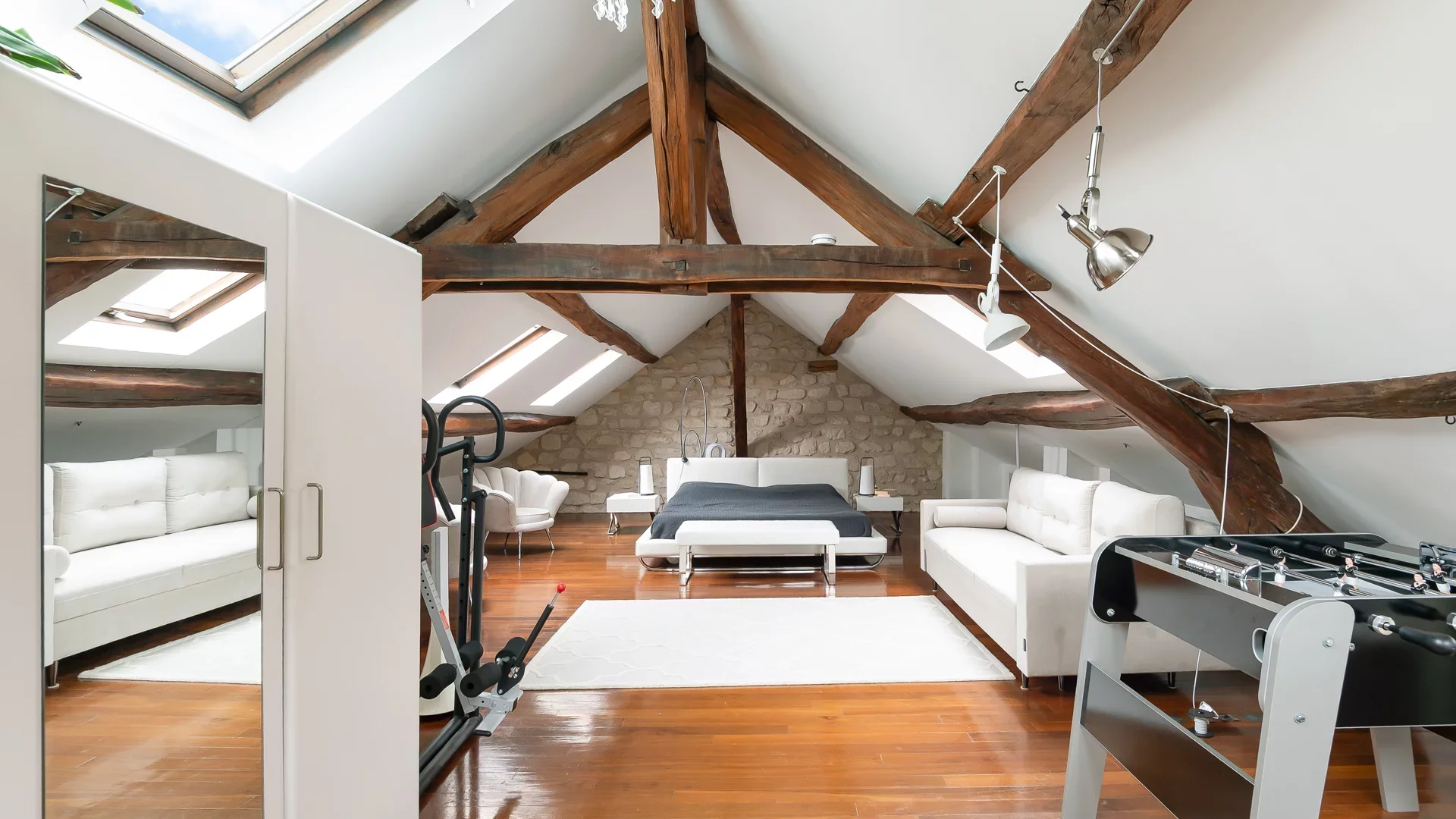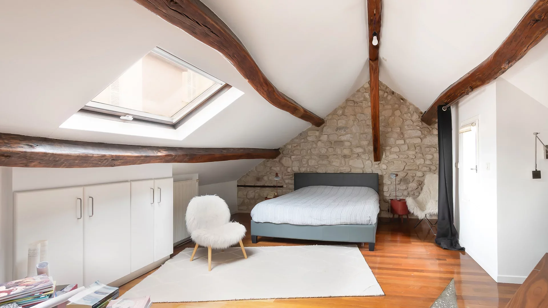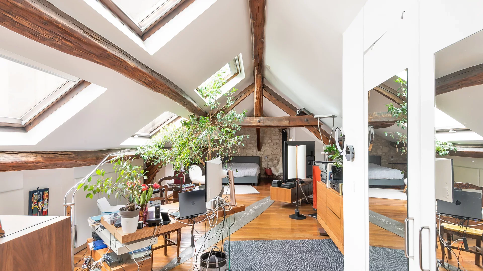 This apartment benefits from abundant natural light thanks to numerous skylights throughout and offers complete privacy.