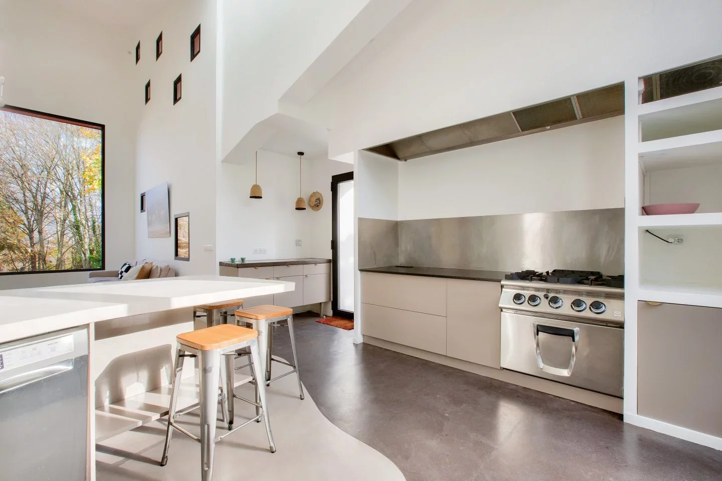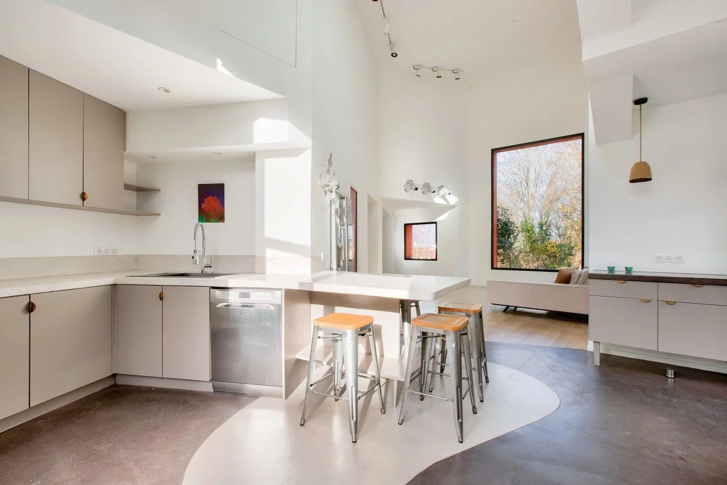 From the moment you enter, light floods into the open-plan reception room, which opens onto the garden through generous picture windows. The view of the vegetation creates a permanent dialogue between inside and outside, the hallmark of homes where daily life is lived in a gentle way. The adjoining fitted kitchen is a natural extension of this convivial living space.