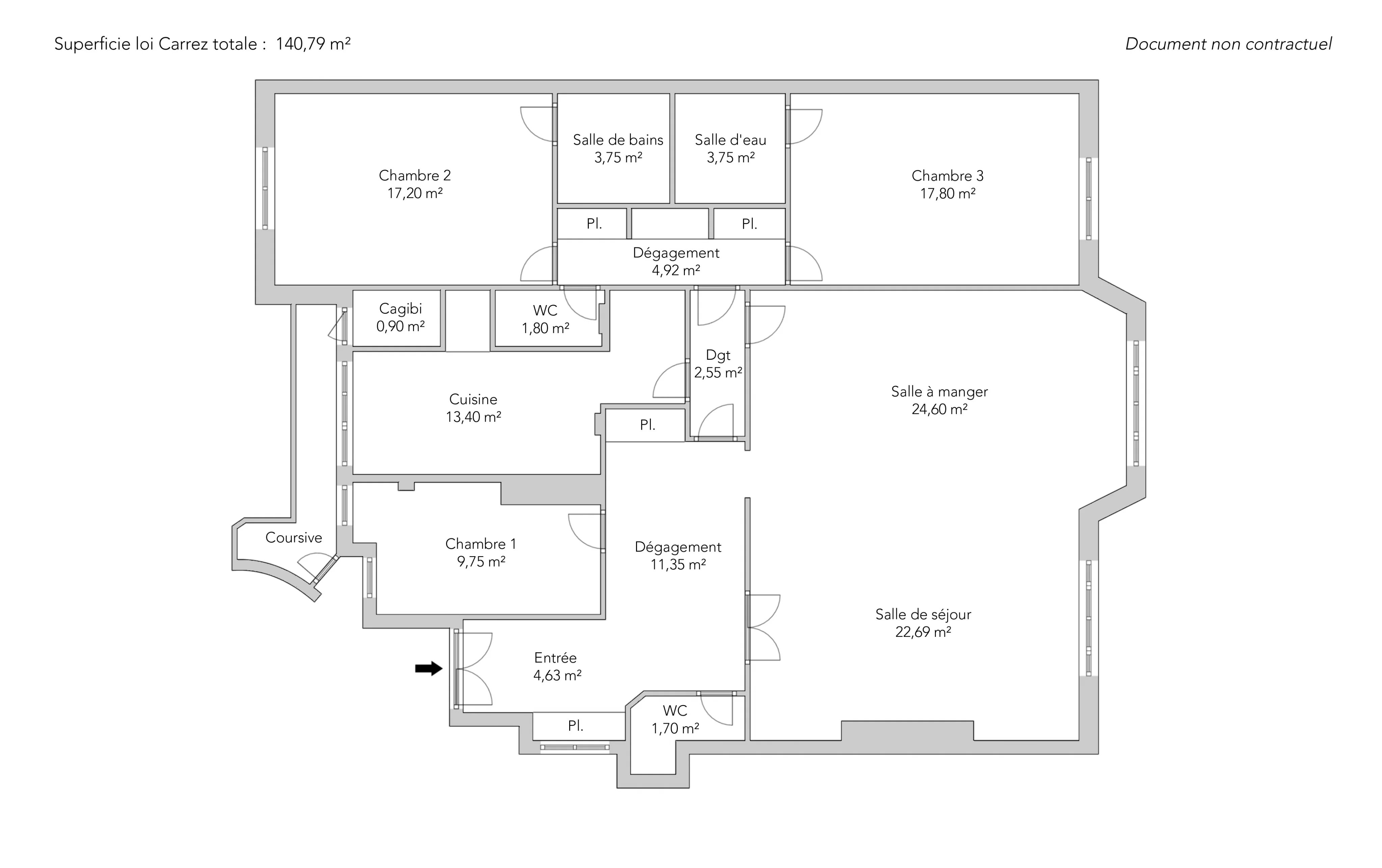 Within a very nice upscale condominium, on the third floor by elevator, charming family and reception apartment of 140.79sqm Carrez law.