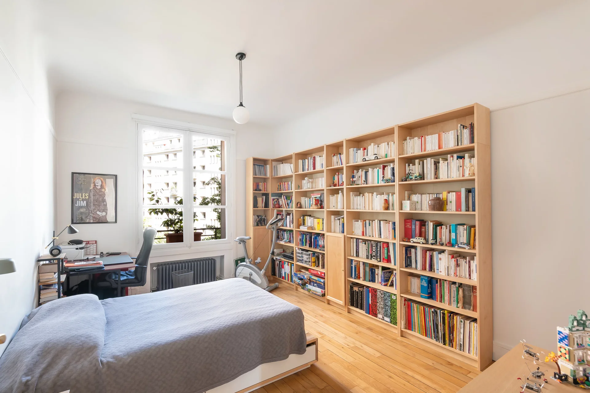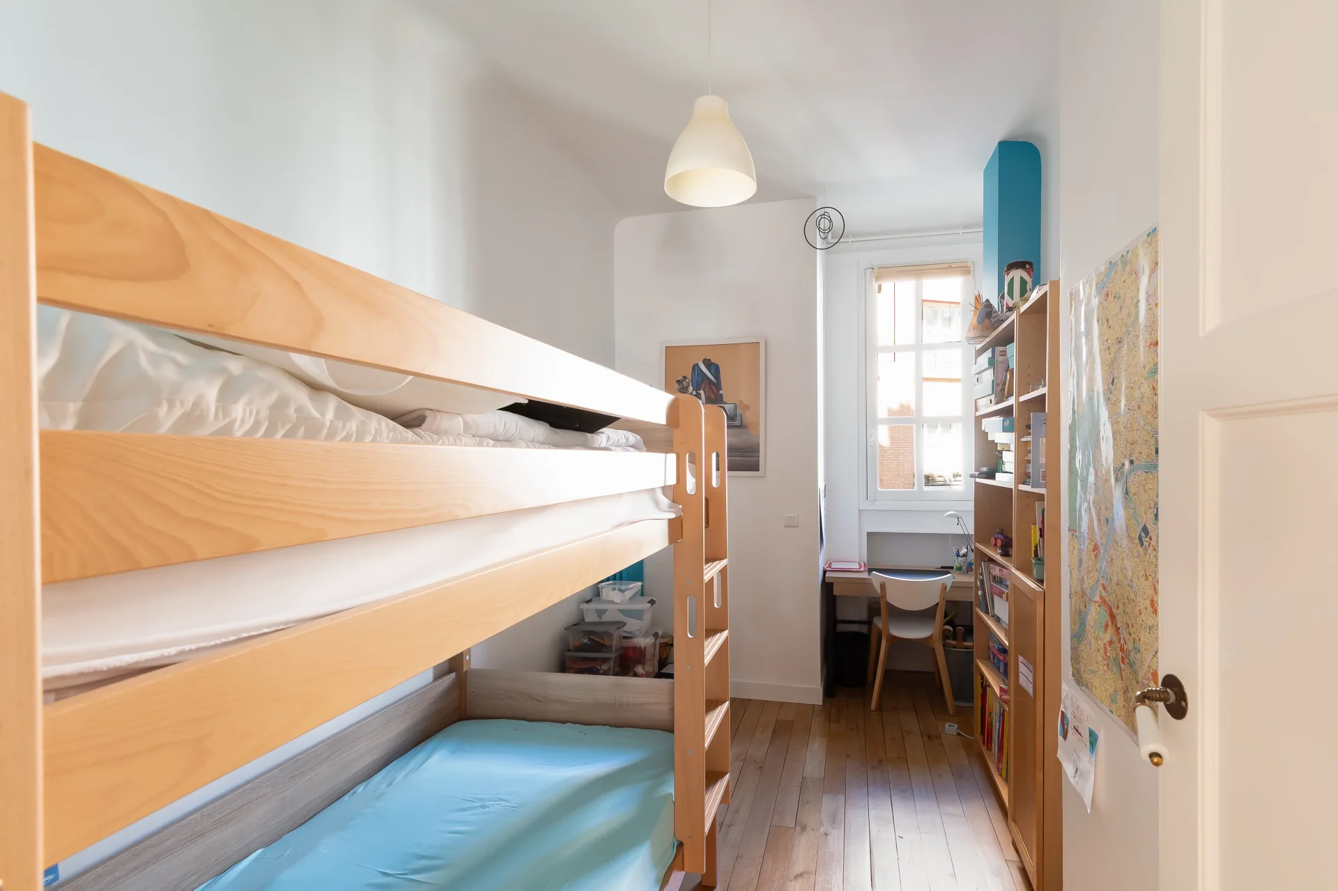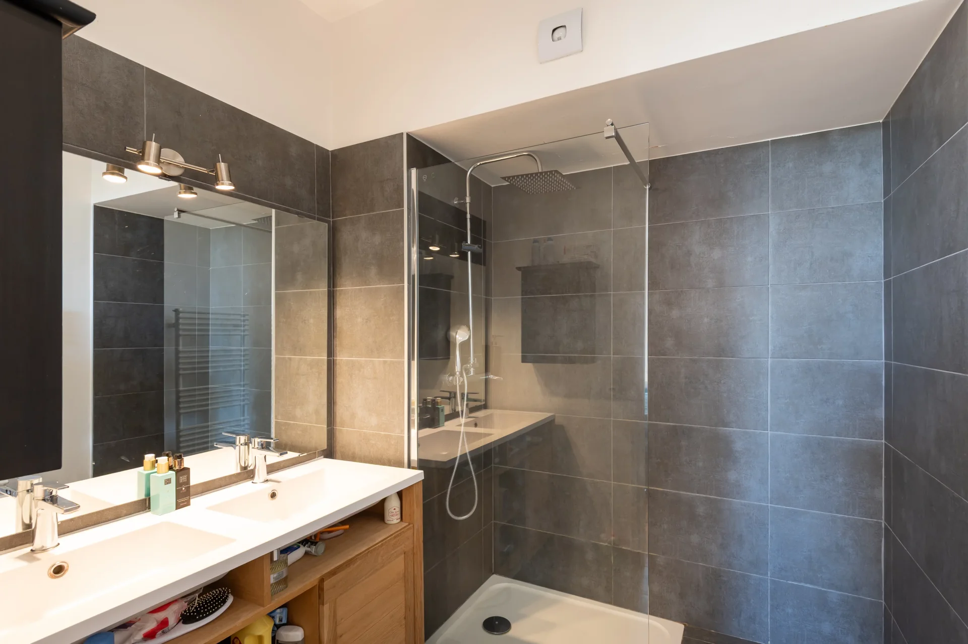 The sleeping area includes a master suite with a shower room, two other bedrooms overlooking a leafy courtyard, a bathroom, two toilets as well as numerous storage spaces and custom dressings.