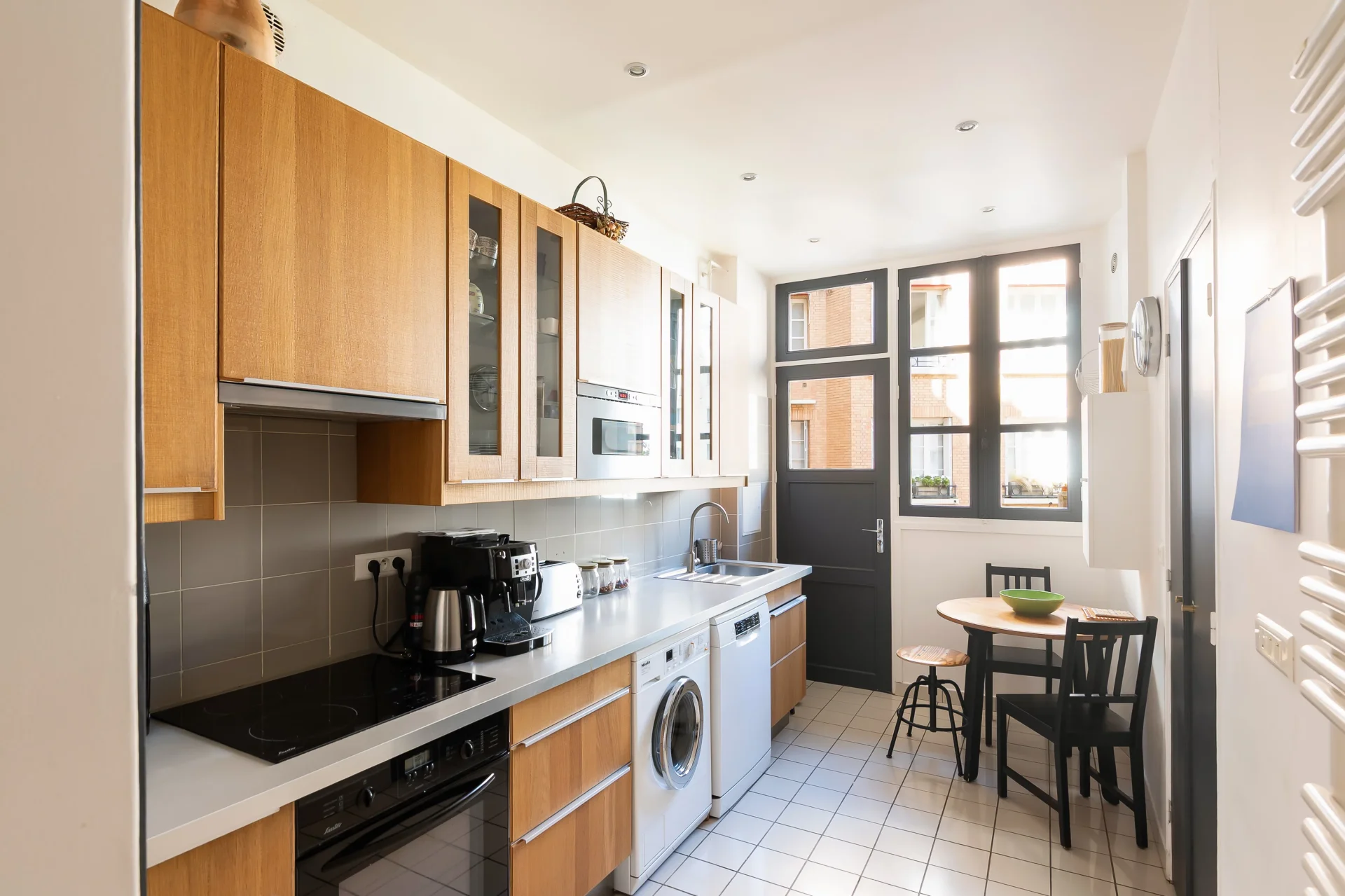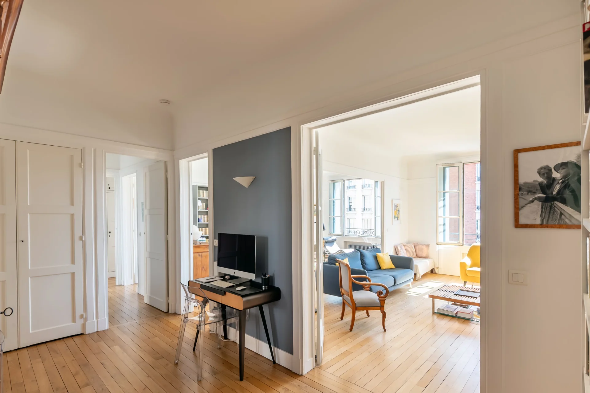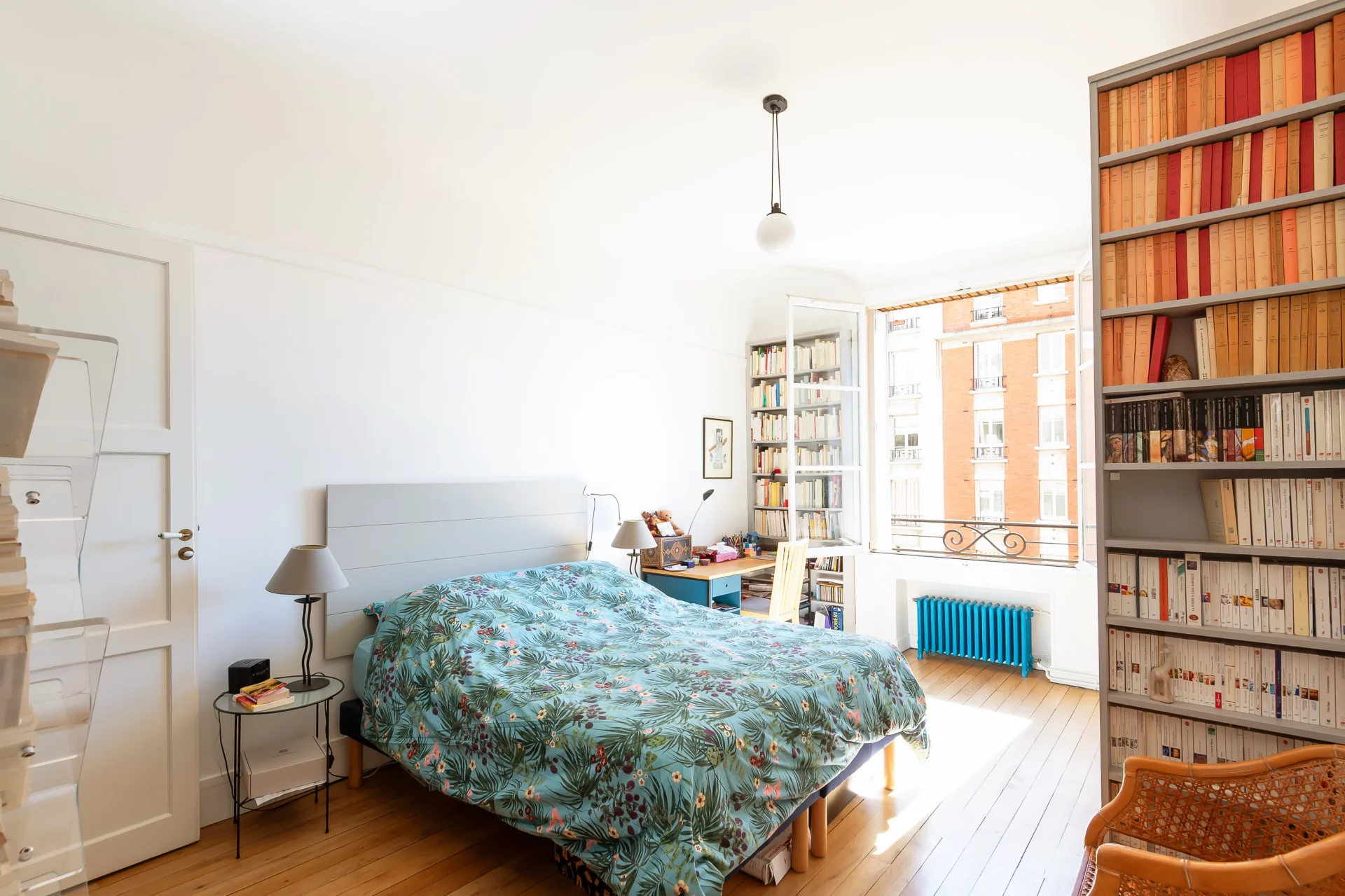 The sleeping area includes a master suite with a shower room, two other bedrooms overlooking a leafy courtyard, a bathroom, two toilets as well as numerous storage spaces and custom dressings.