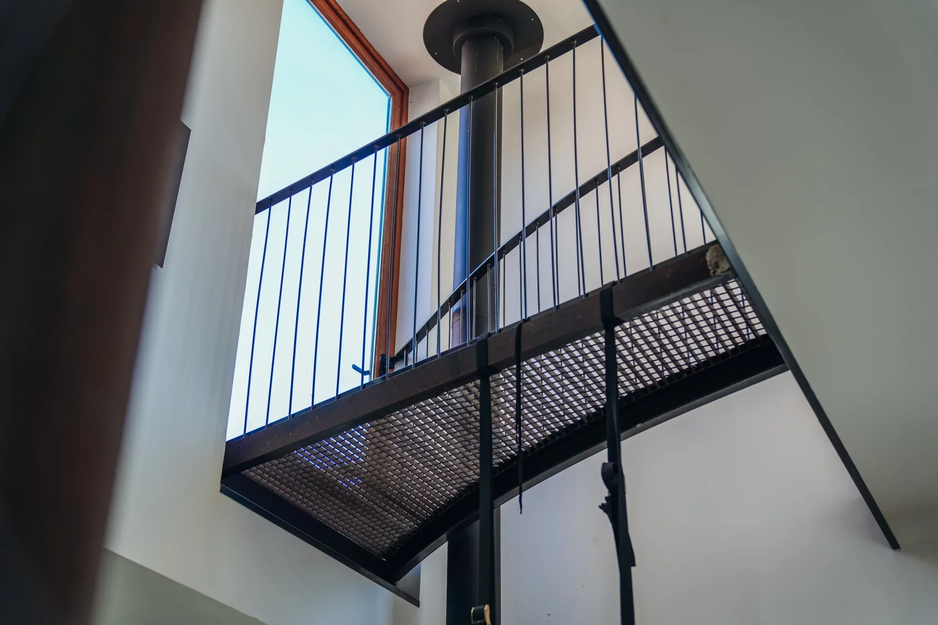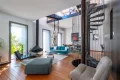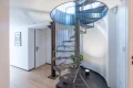 Inside, the volumes revolve around a steel cylinder stairway, the true backbone of the project, connecting the three levels with a single movement. The house combines spectacular spaces (cathedral living room, metal walkway, corner skylights, solarium) and protective atmospheres (duplex bedrooms on the garden level, patio, exotic garden shielded from view).
