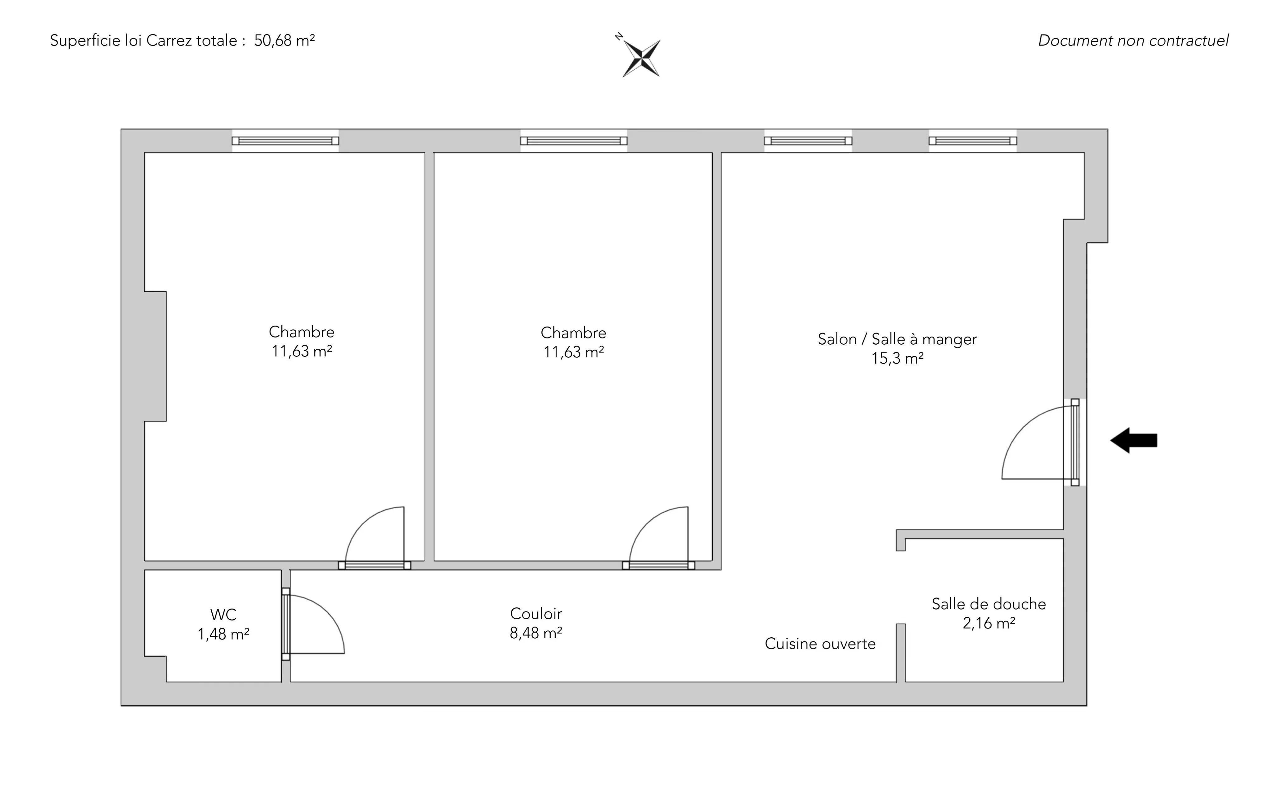 On the second floor of a building via the staircase, discover this beautiful three-room apartment with a surface area of 50.68sqm loi Carrez, offering calm and discretion.