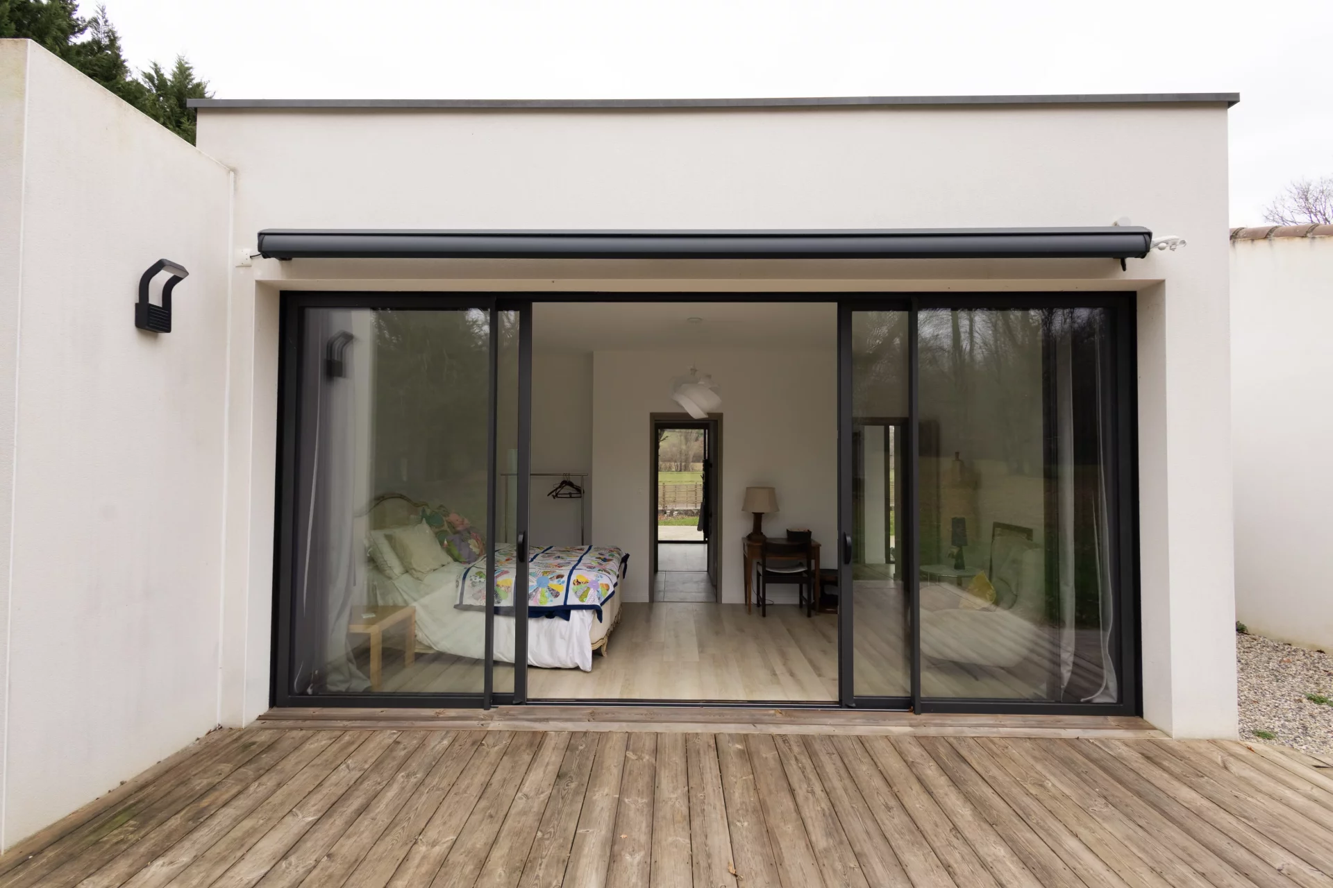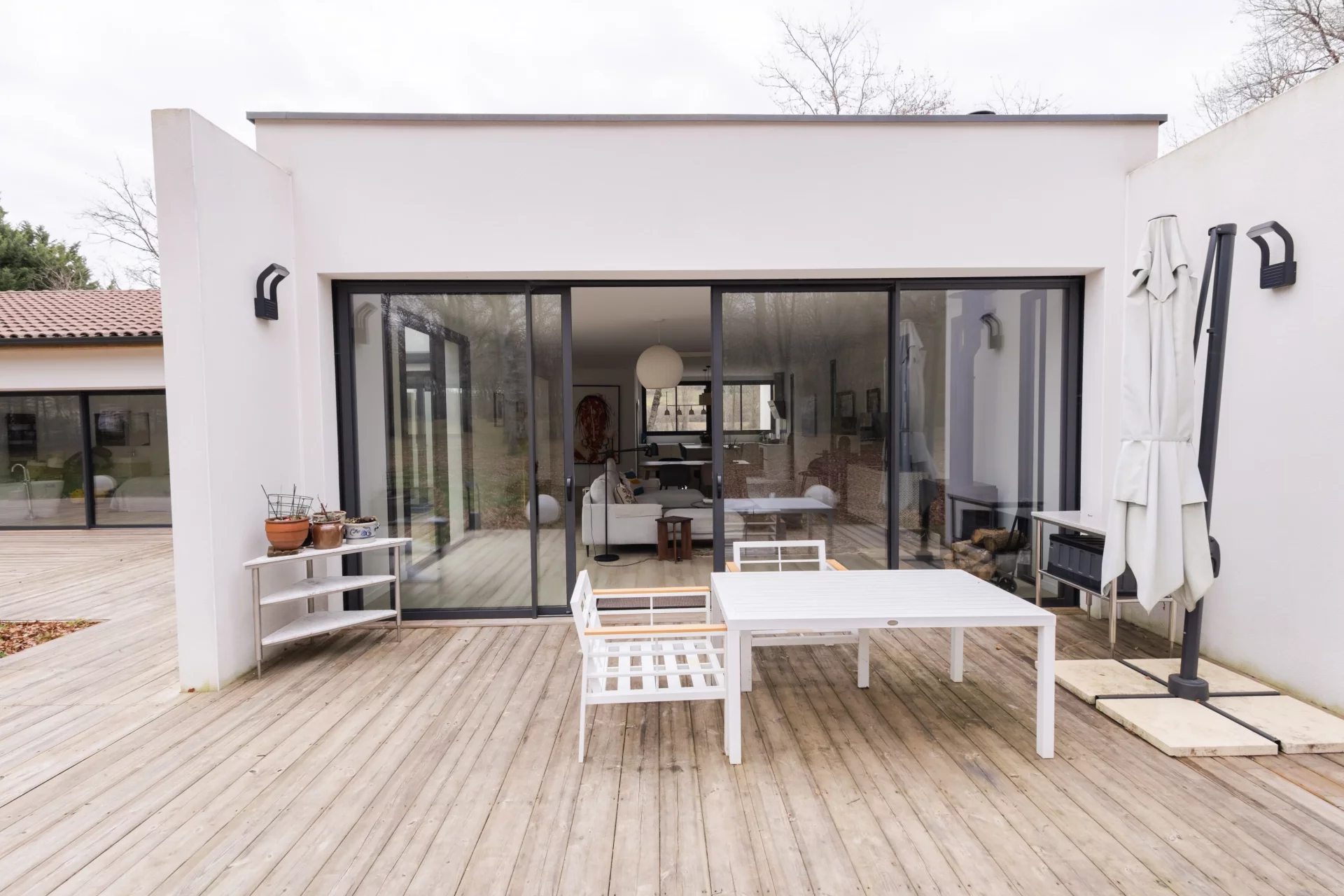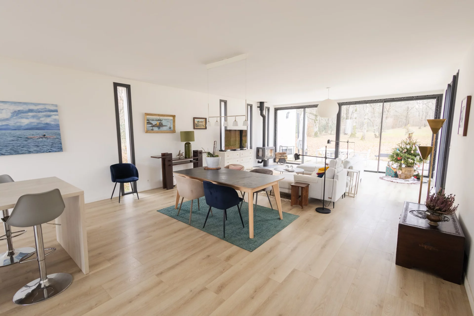 Designed for conviviality and entertaining, the house is built around a remarkable living room of over 70sqm, enhanced by a wood-burning stove, a true heart of life dedicated to moments of sharing. The intimate, perfectly integrated outdoor spaces naturally extend the living room into the vast wooded grounds.