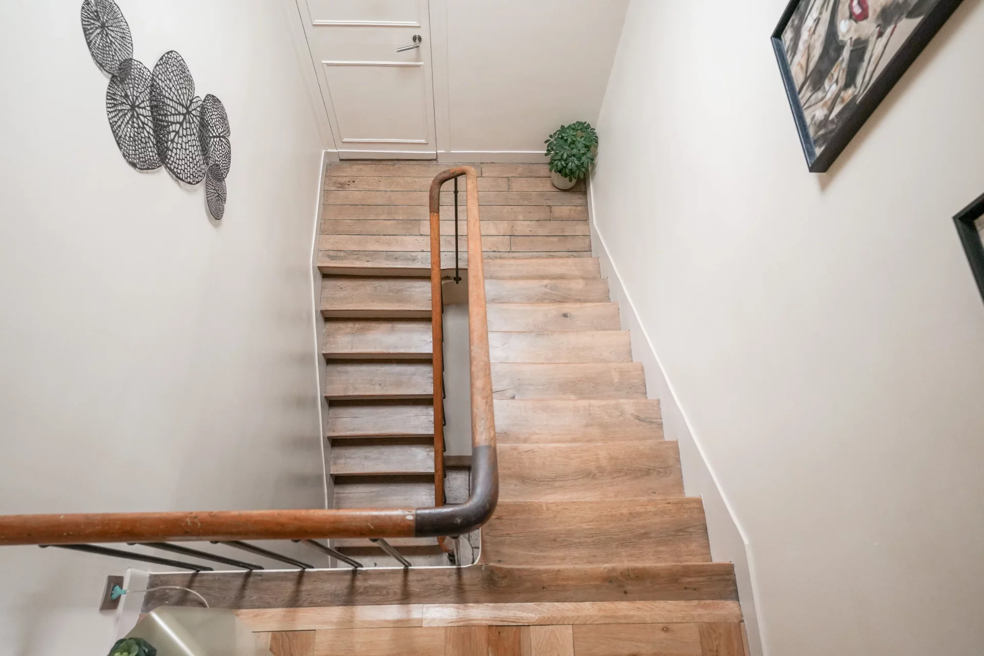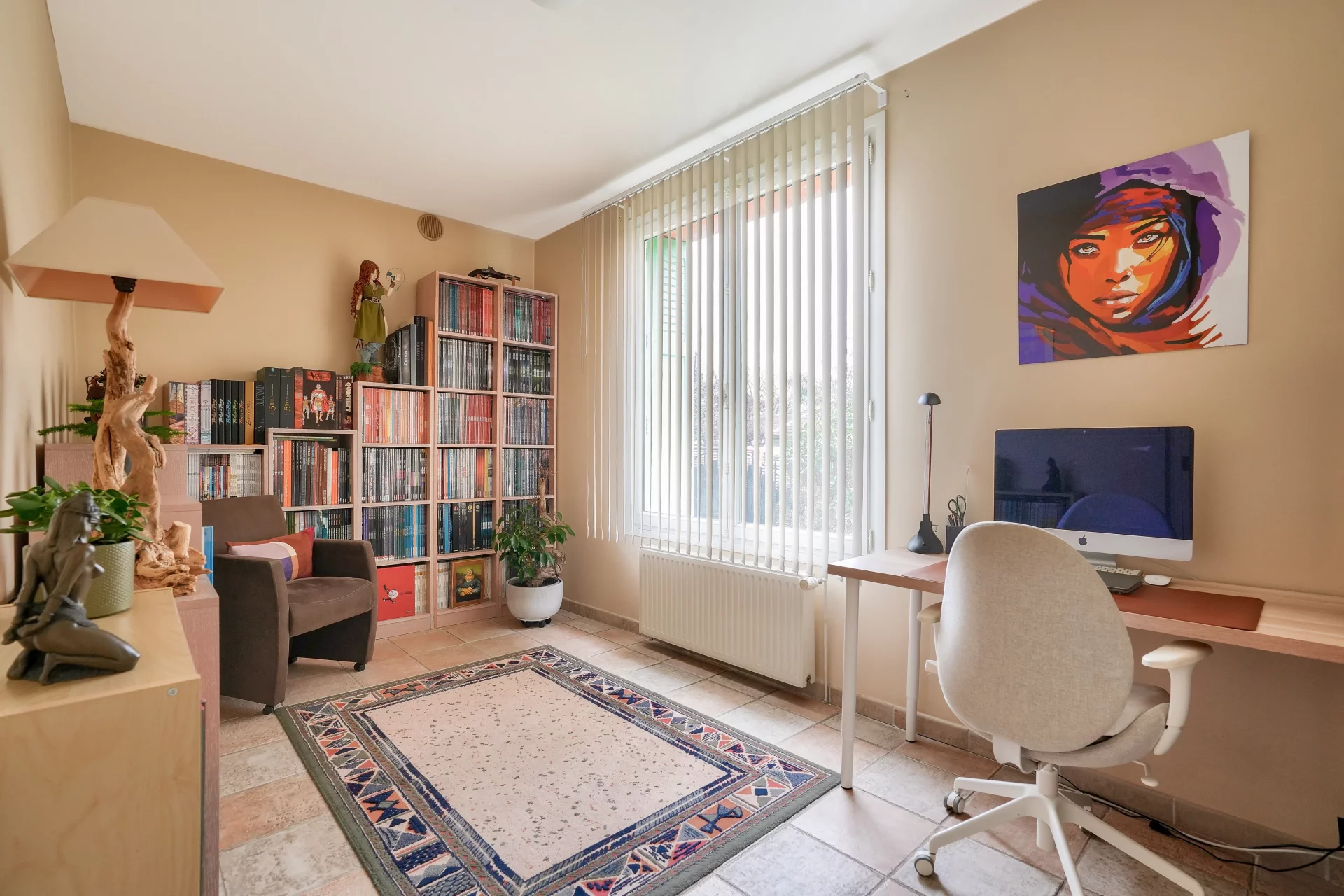 It opens onto a pleasant 35sqm living room, warmly enlivened by a wood-burning stove, and extends into a contemporary 16m² separate dining kitchen with direct access to a pretty terrace followed by an intimate garden, perfect for enjoying fine weather. The first floor also includes an office that can easily be converted into a