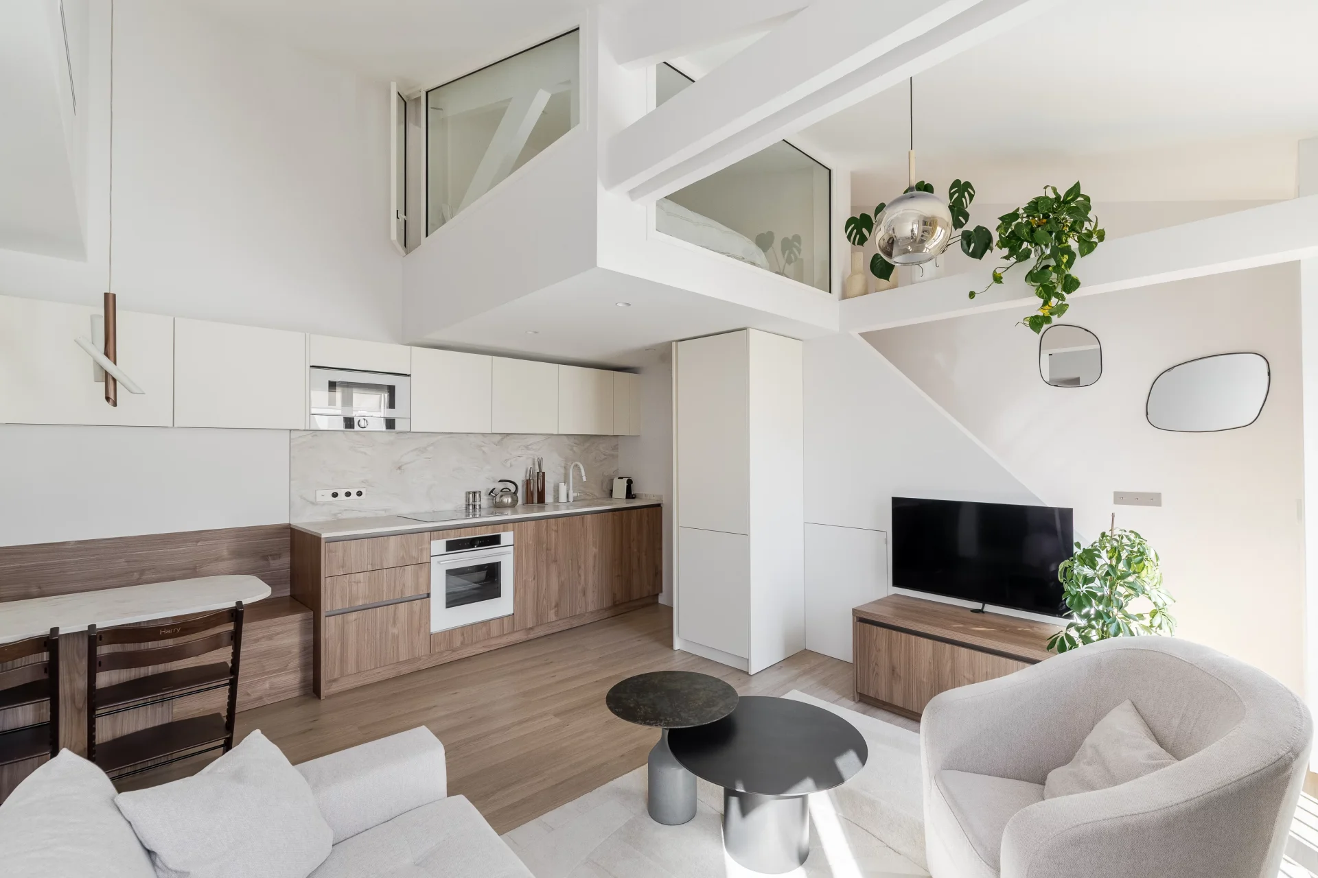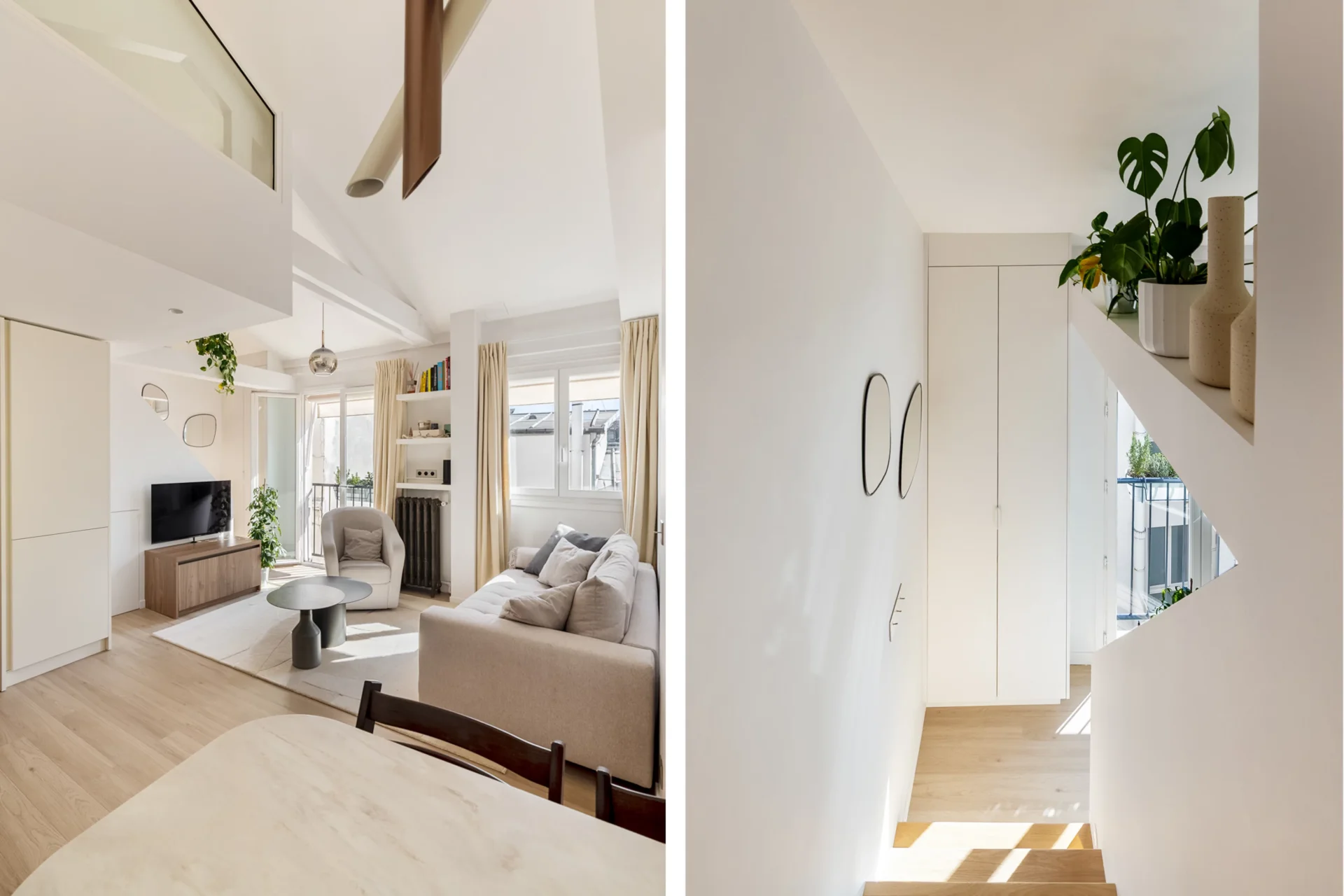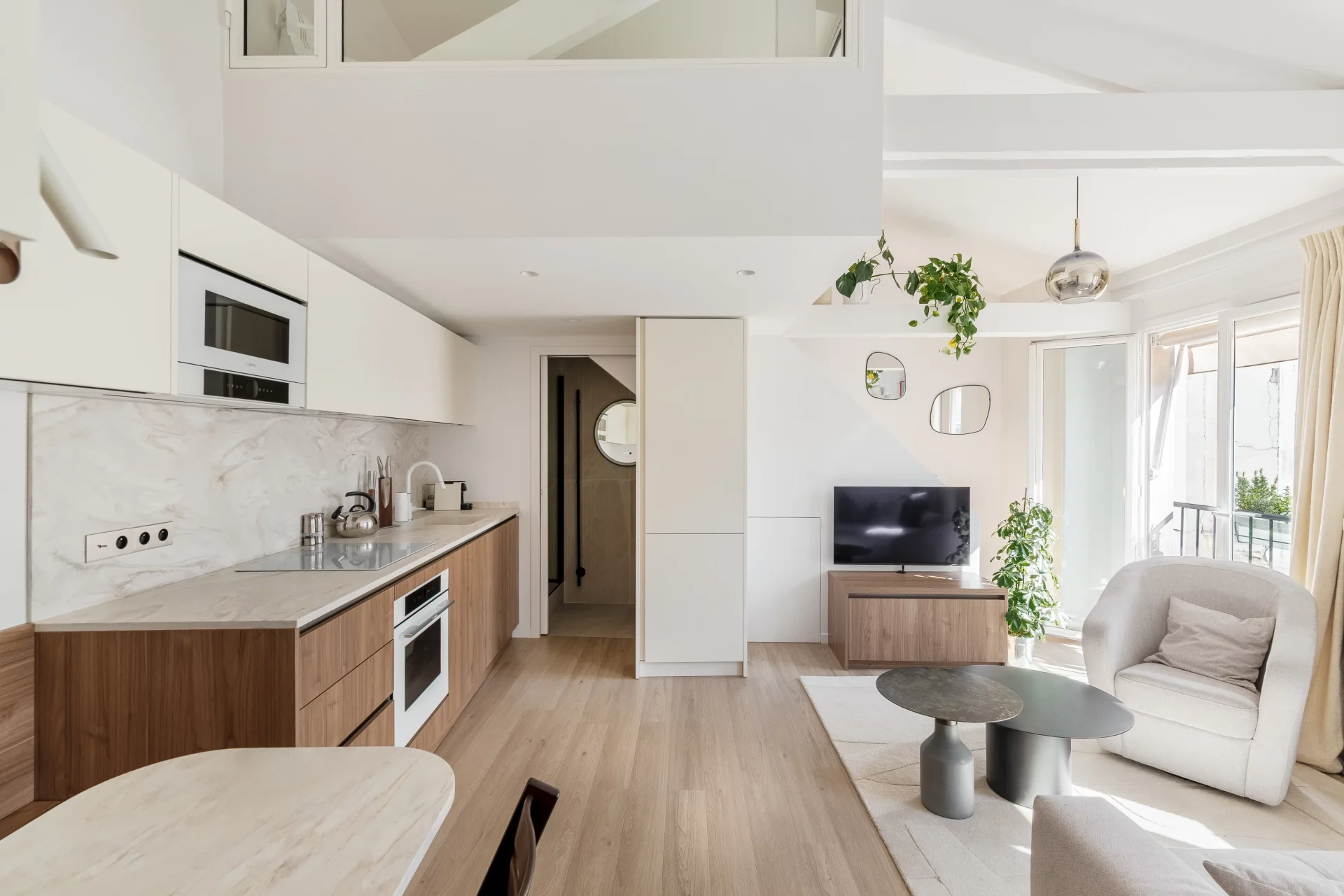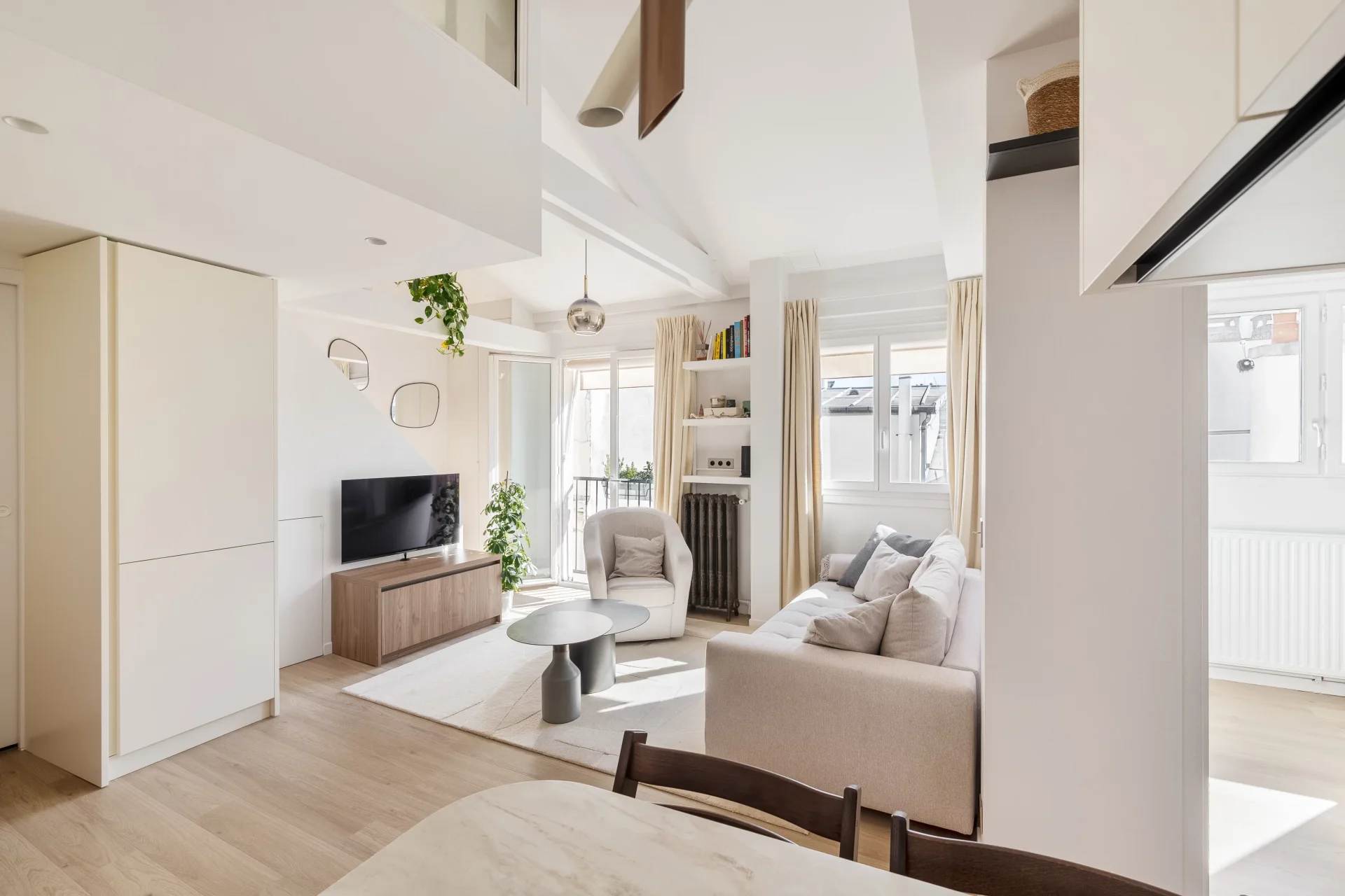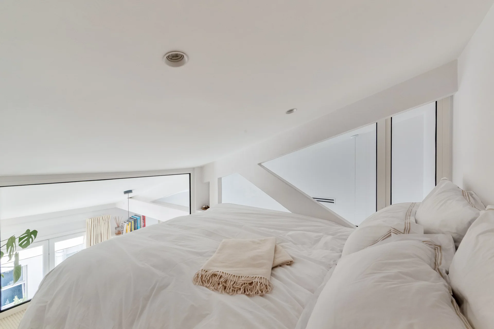 Like a home on the rooftops, in absolute tranquillity, it comprises an entrance on the fifth floor with a large walk-in wardrobe, then on the upper floor: a beautiful living area with an open-plan kitchen, facing south and offering lovely views over the rooftops, a bedroom with an en-suite shower room, and a separate toilet. On the mezzanine level, a sleeping area.