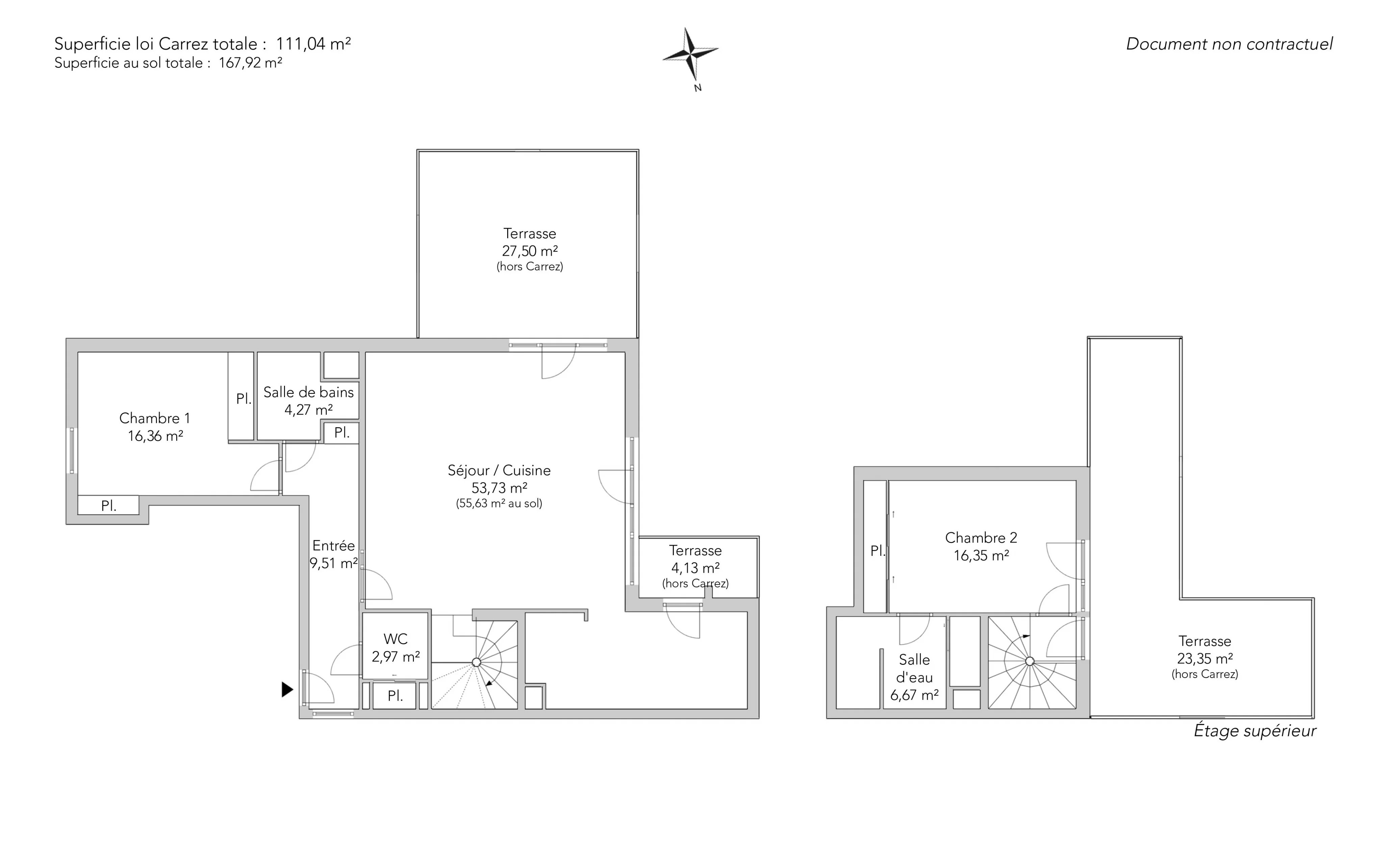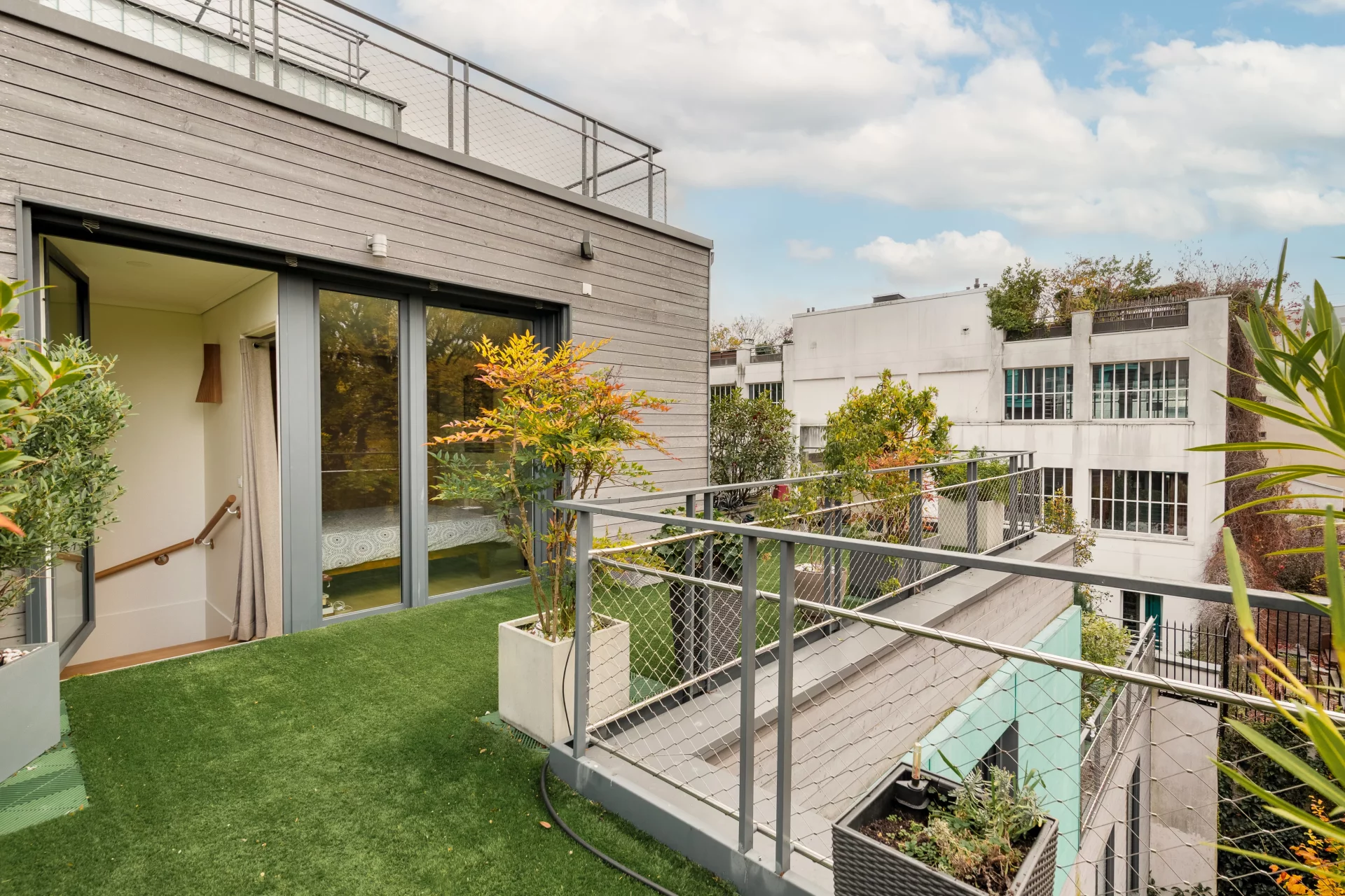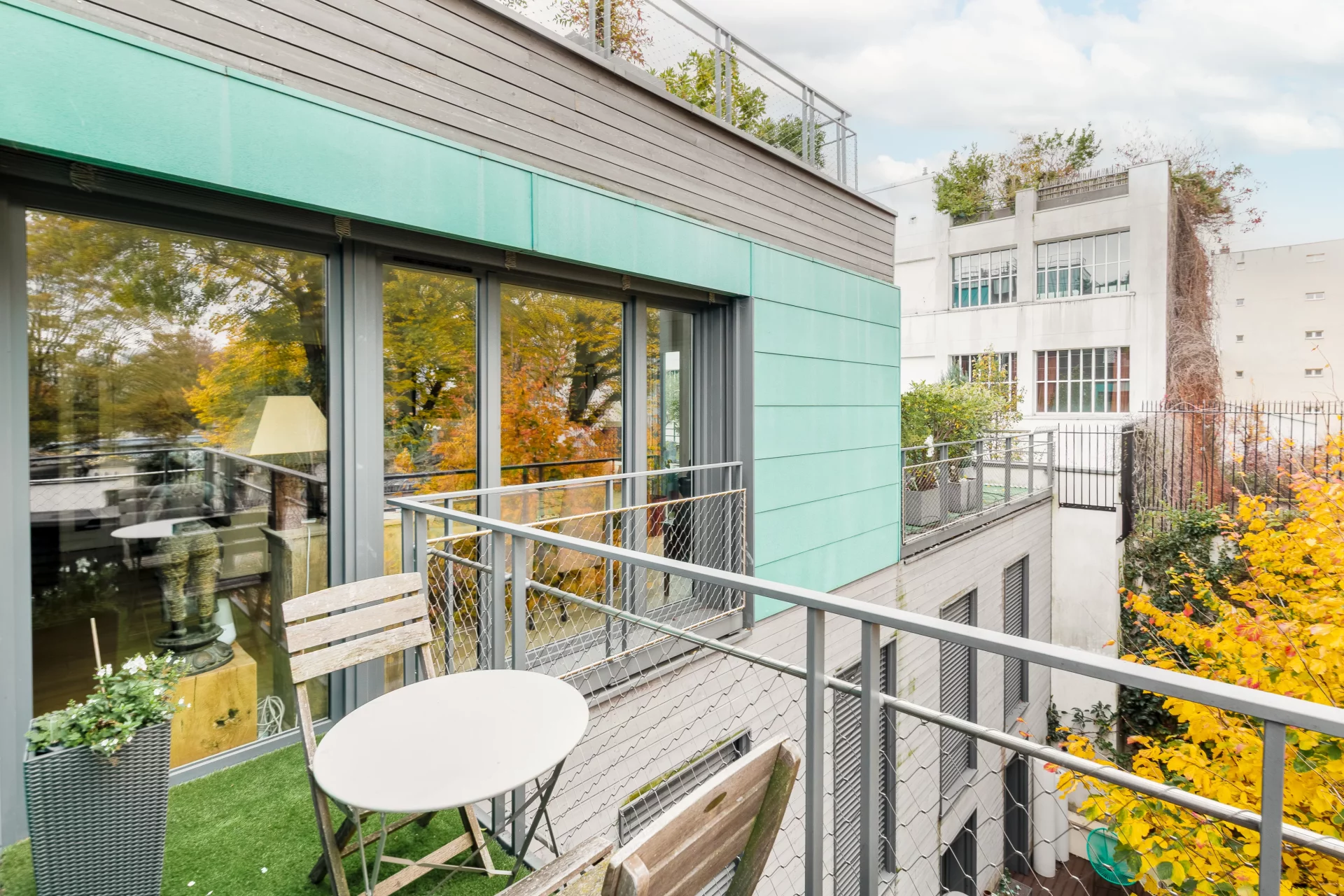 Located in a quiet, private cul-de-sac, on the top two floors of a 2017 building, this superb 111.04 sq m (Carrez Law) duplex boasts three terraces totaling 54.98 sq m.
