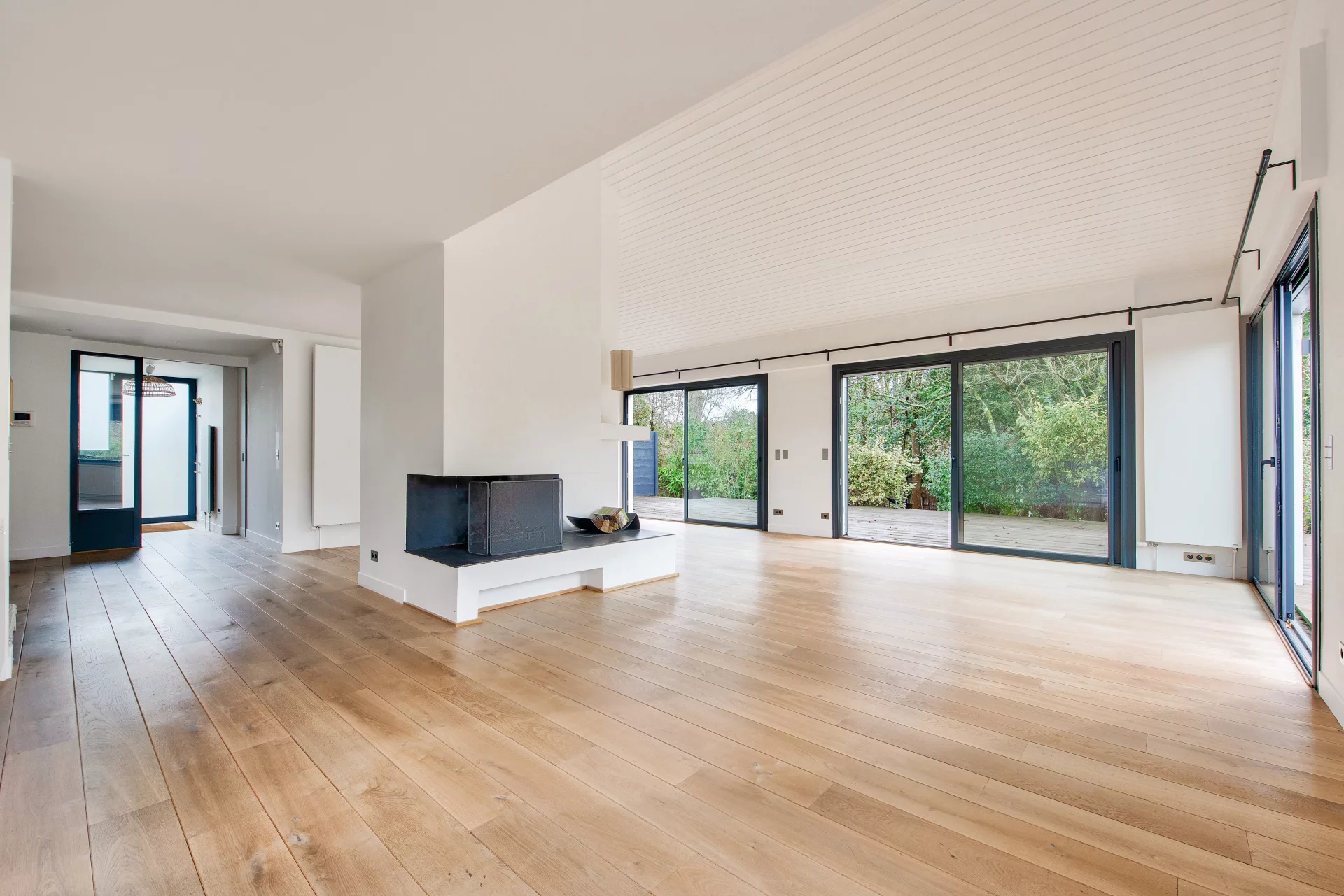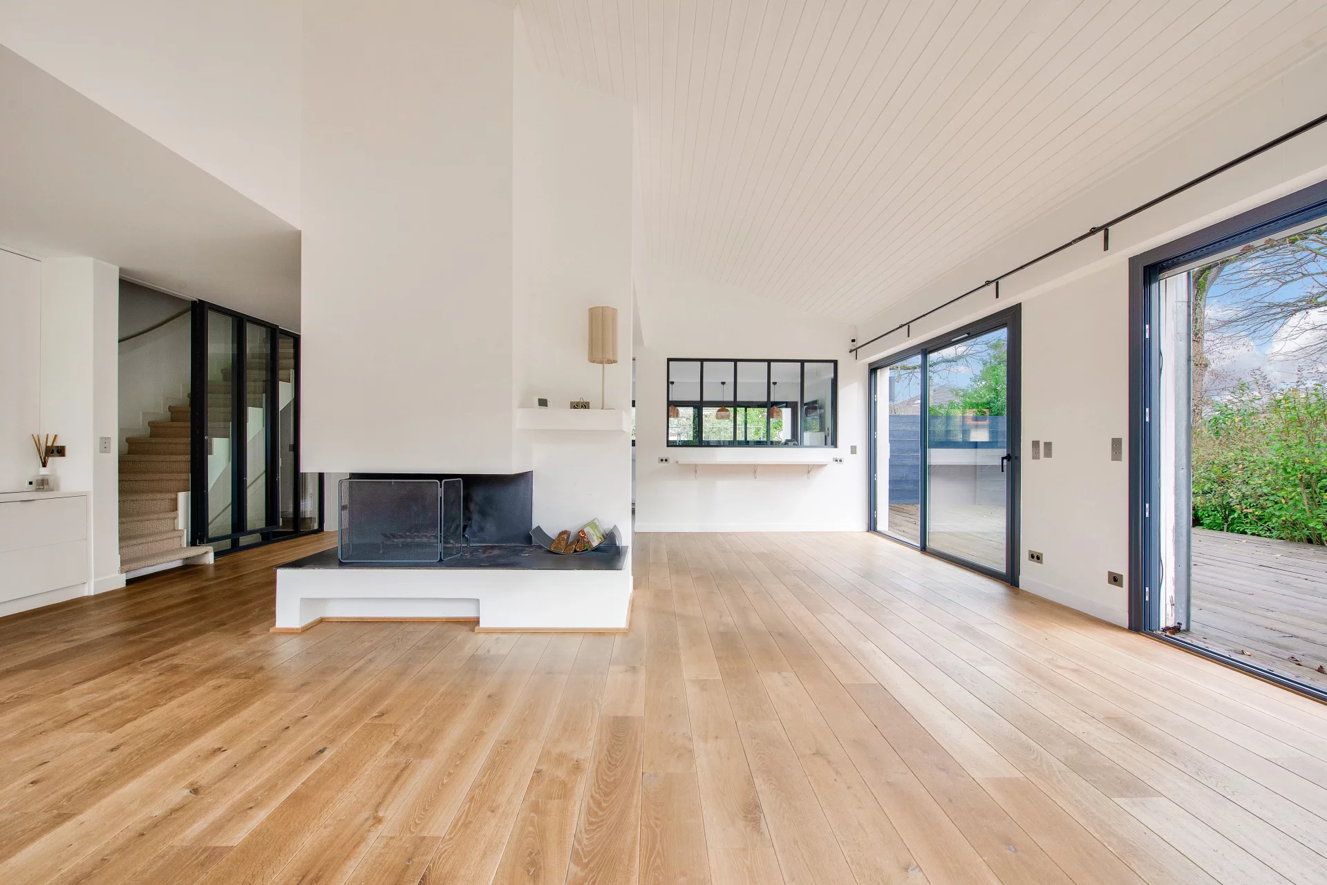 The first floor opens onto an entrance hall leading to a vast 58sqm reception room with fireplace and parquet flooring, including living room and dining room, both of which open onto two terraces of 60sqm and 25sqm, as well as onto the landscaped garden.
