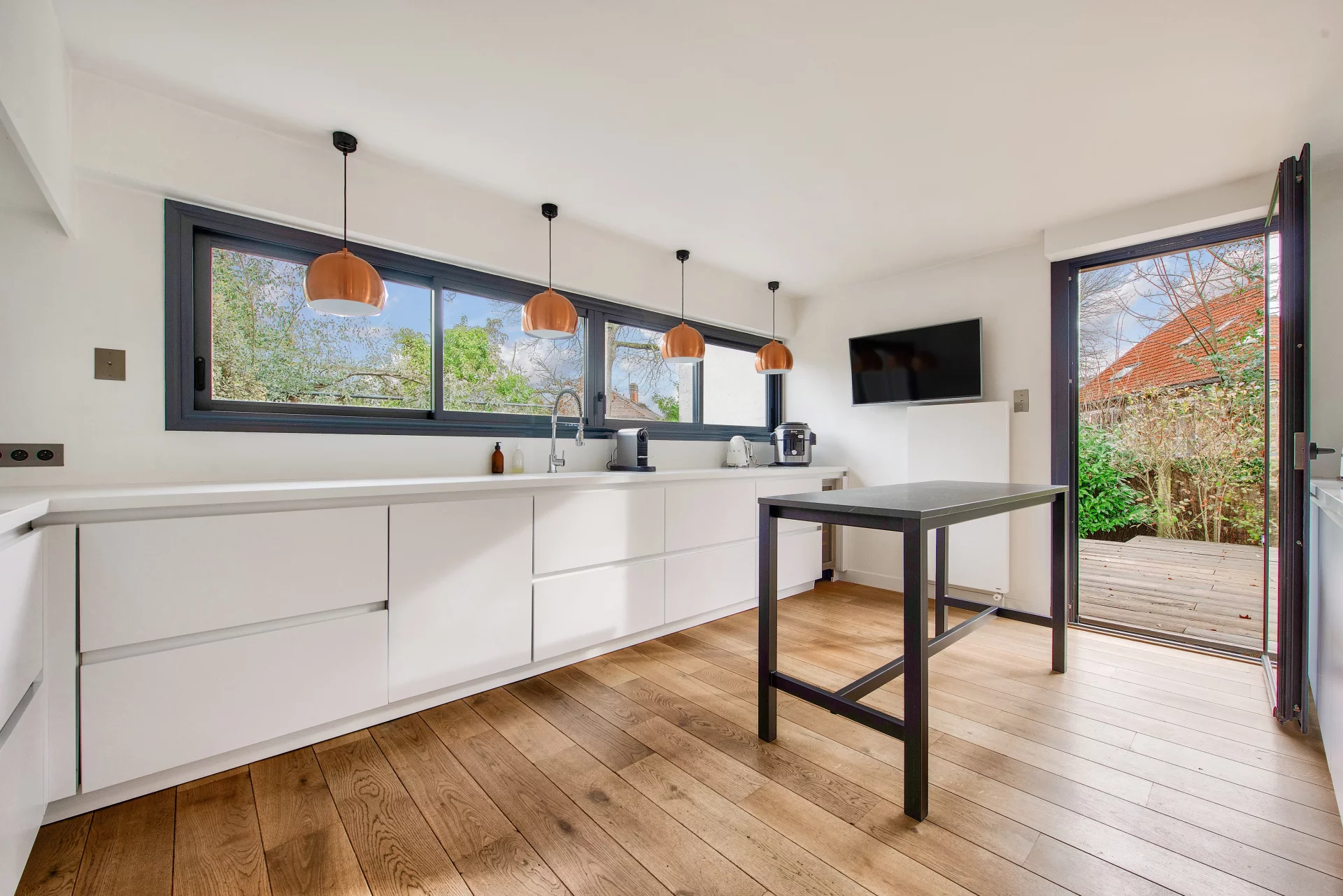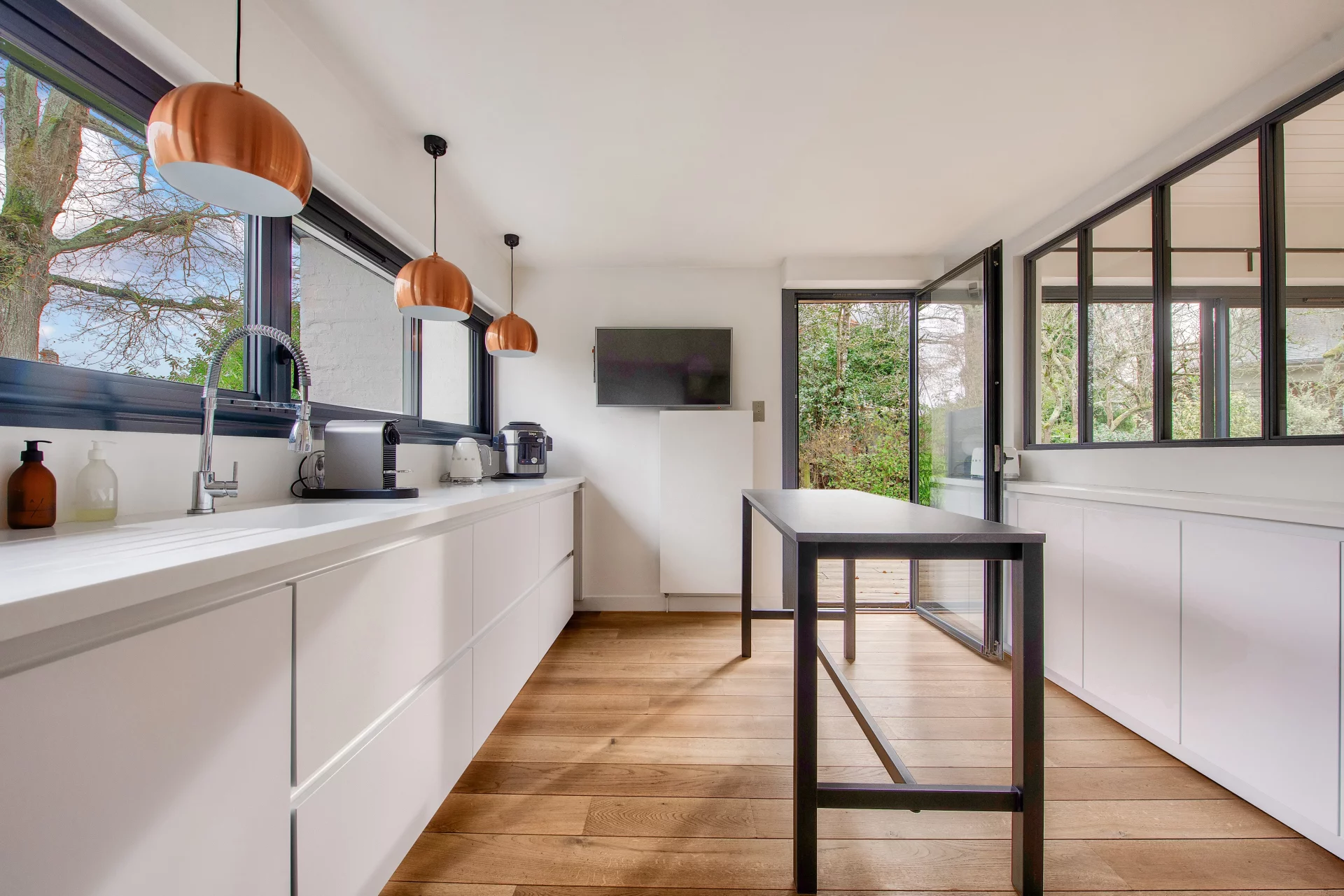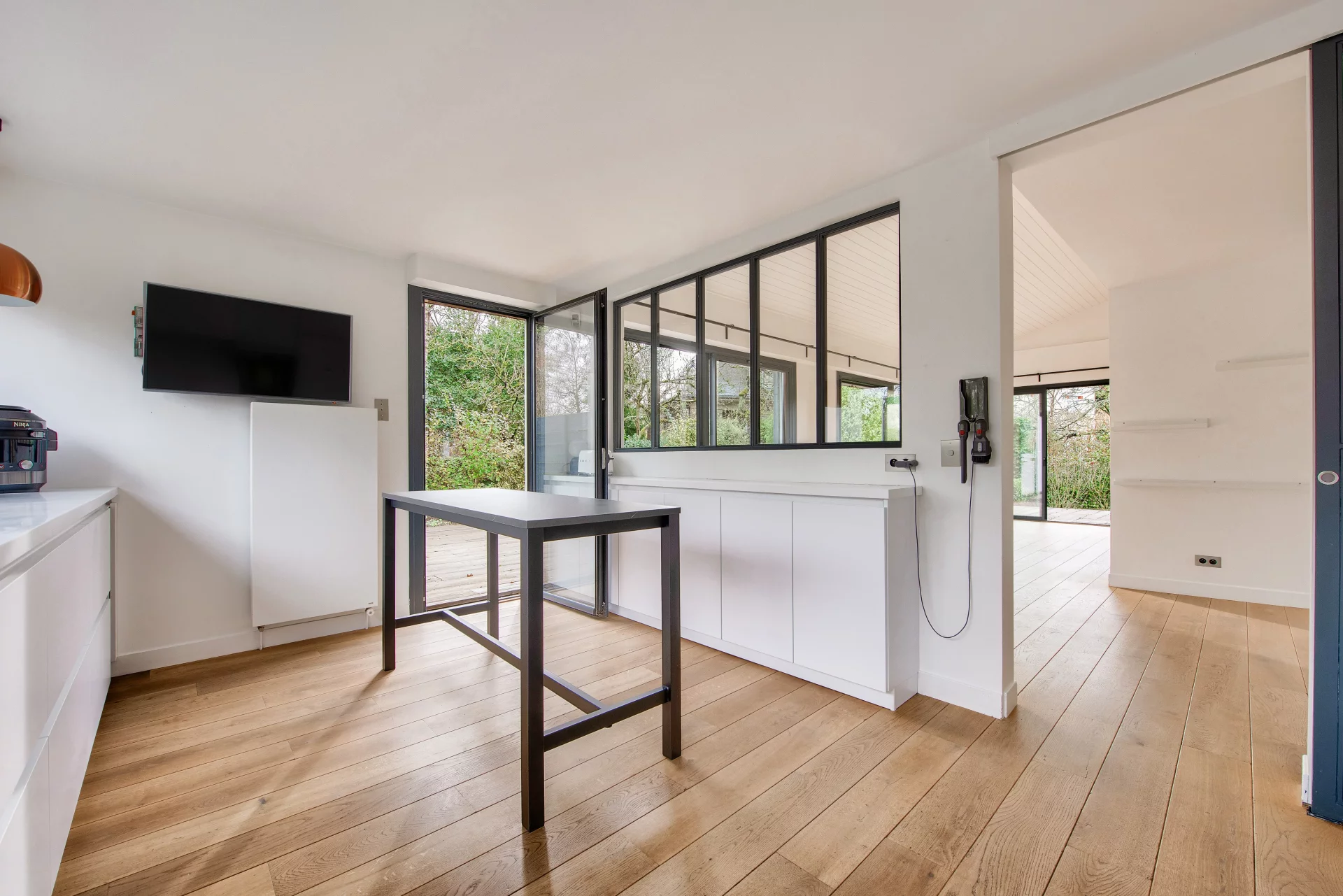 The fully-equipped kitchen offers a convivial, functional space with direct access to the outside.