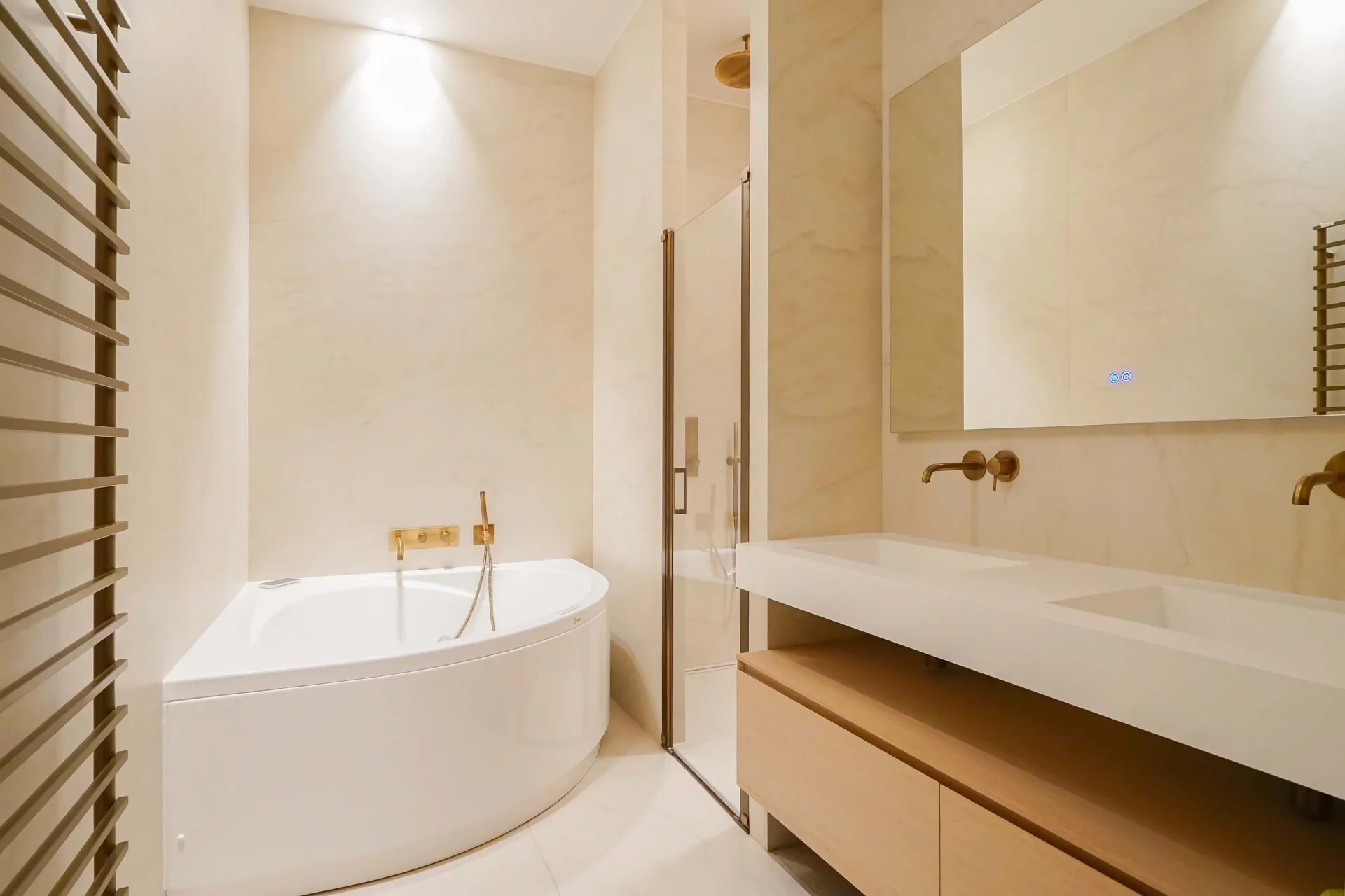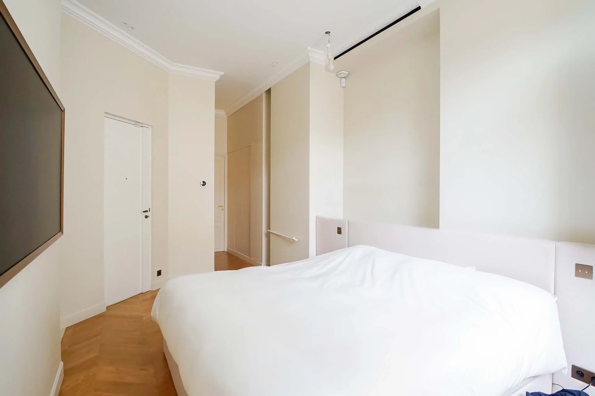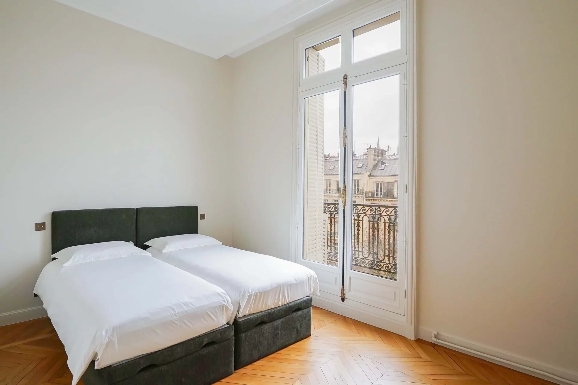 The apartment opens onto a beautiful entrance hall leading to a spacious living room offering a ceiling height of 3.50 metres and with stunning views over Paris, as well as a fully equipped eat-in kitchen. The sleeping area comprises three bedrooms, including a master suite, two bathrooms, three separate toilets, and ample storage space.
