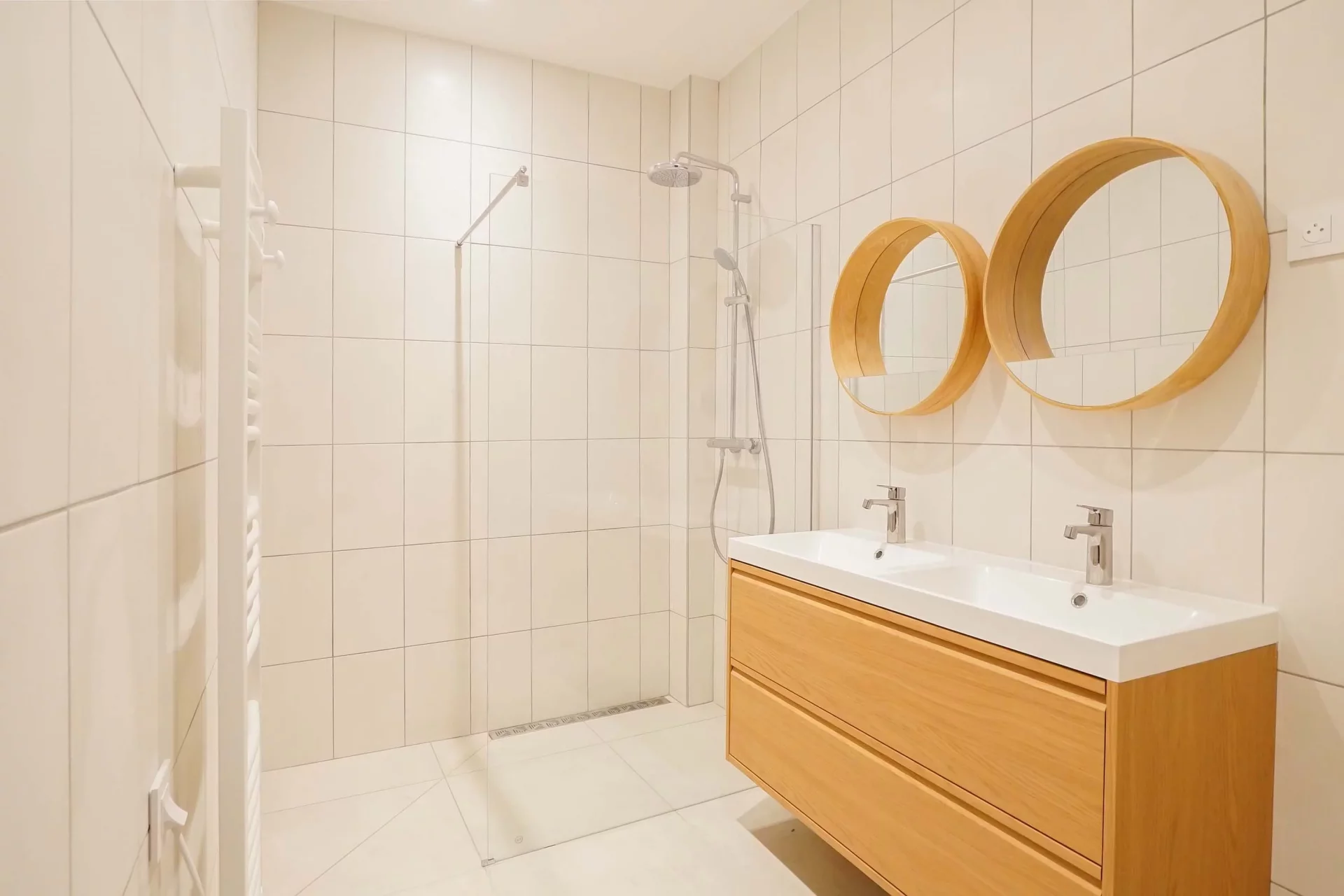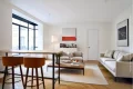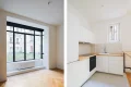 It faces onto a quiet courtyard and comprises a large living room with an elegant bow window, an open-plan fitted kitchen, a separate toilet and a large bedroom with an adjoining walk-in shower room. The compact floor plan offers generous volumes and high ceilings (3.10 m).