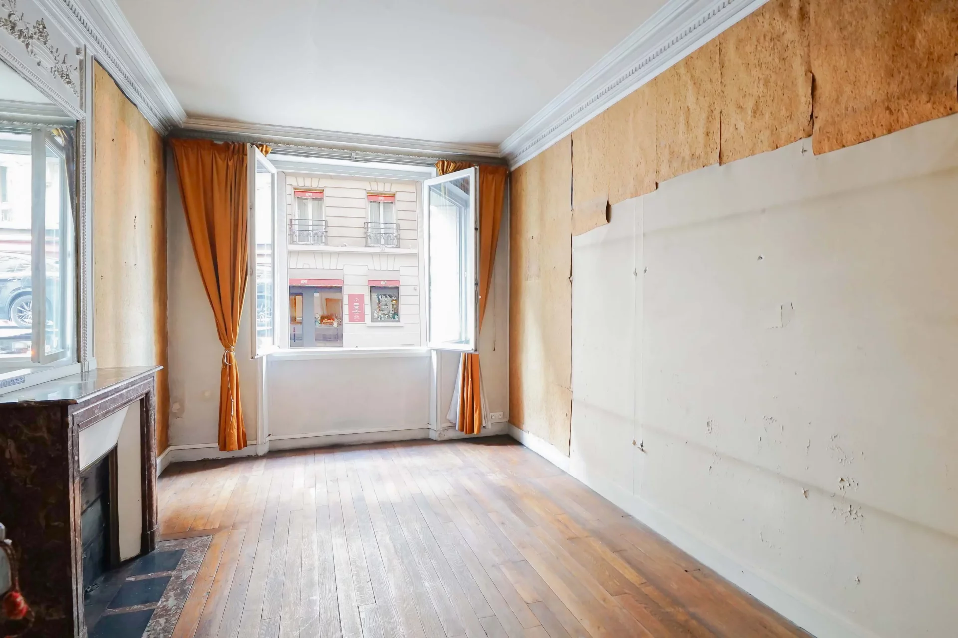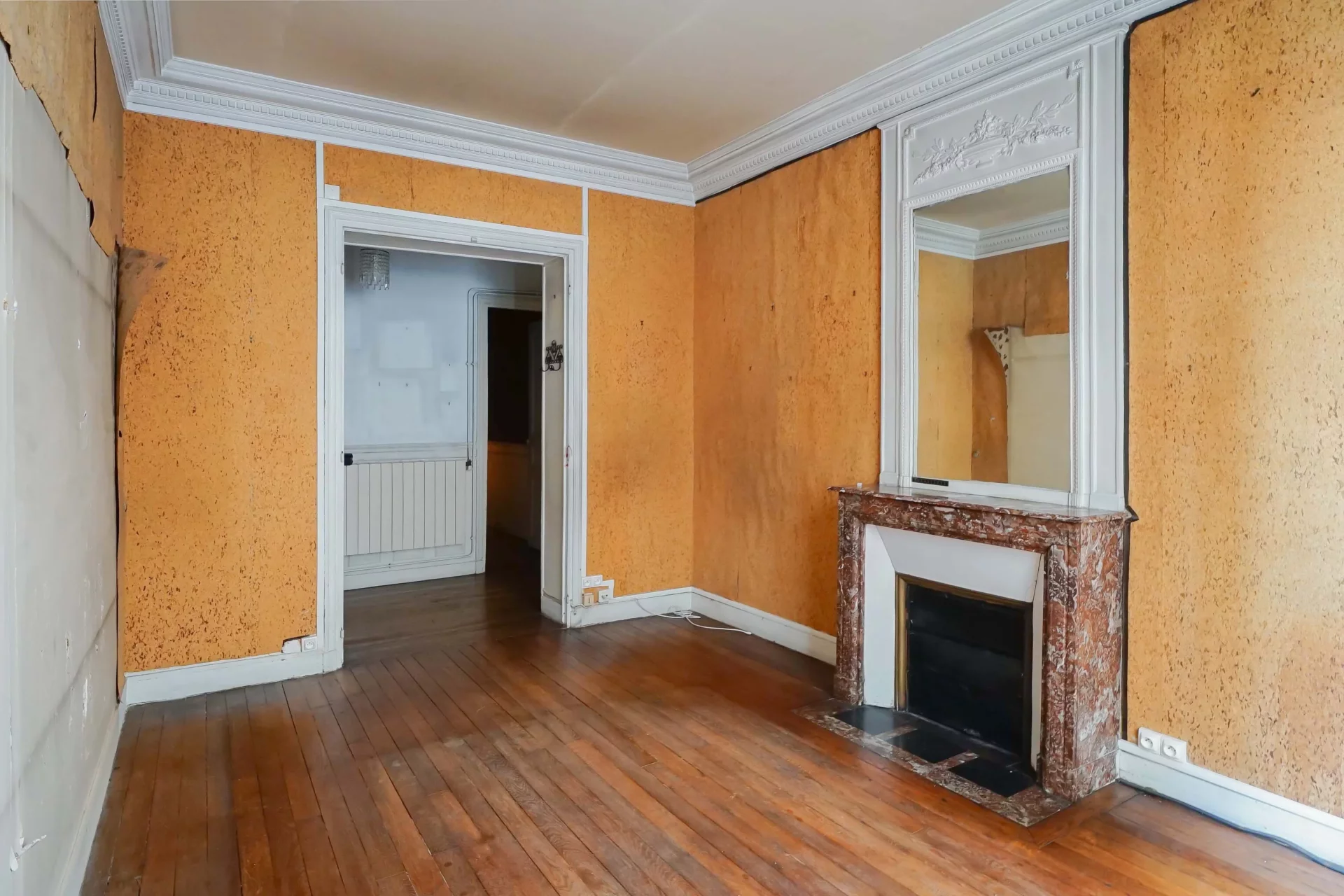 The charm of the original features is undeniable: original parquet flooring, elegant moldings, and a fireplace lend this property a rare character, ideal for a bespoke renovation project.