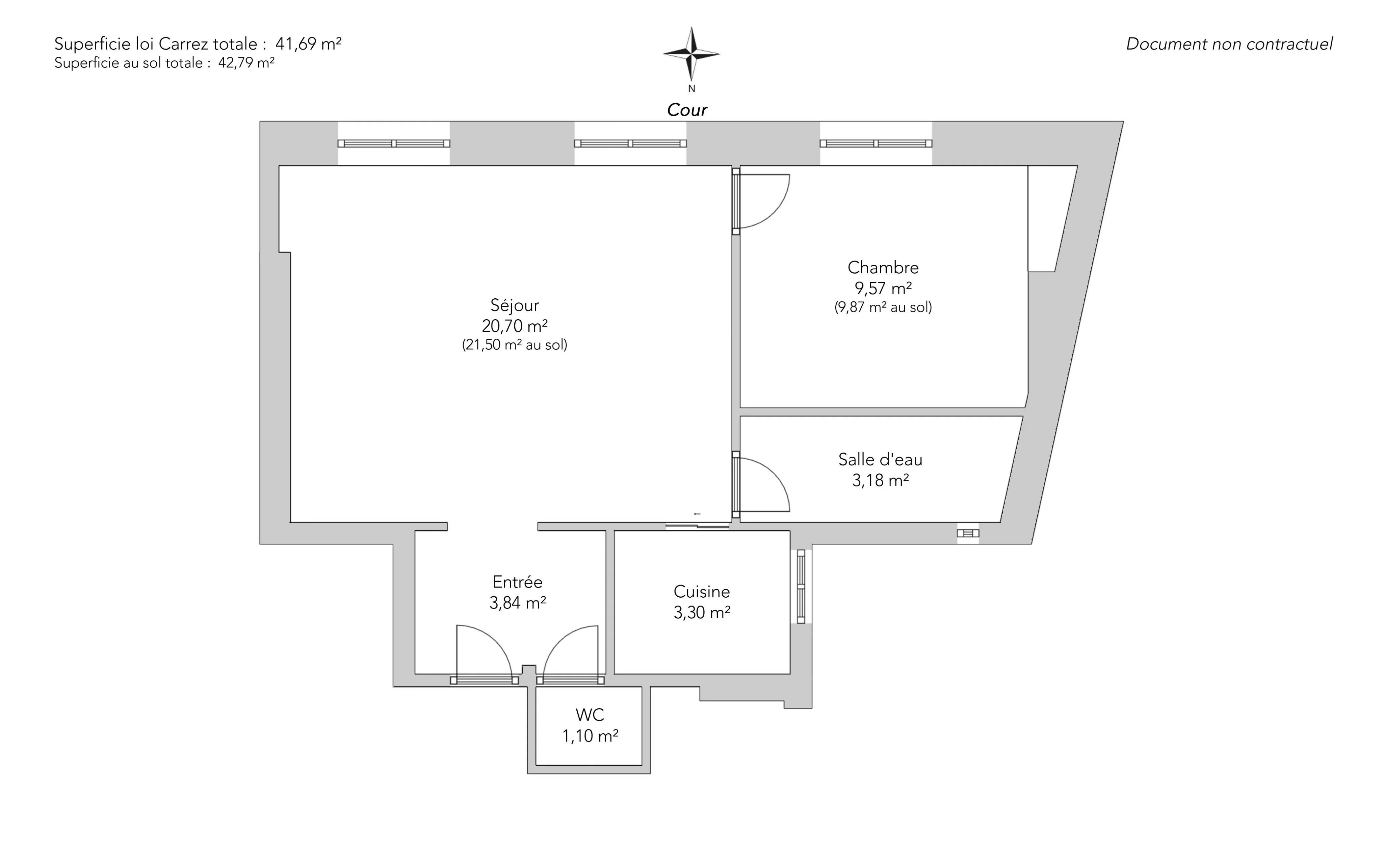Overlooking a large courtyard and offering complete privacy, it comprises an entrance hall leading to a 20 sq m living room with two large south-facing windows and a bedroom with ample built-in storage. The kitchen is fully equipped, the shower room has a window, and there is a separate toilet.
