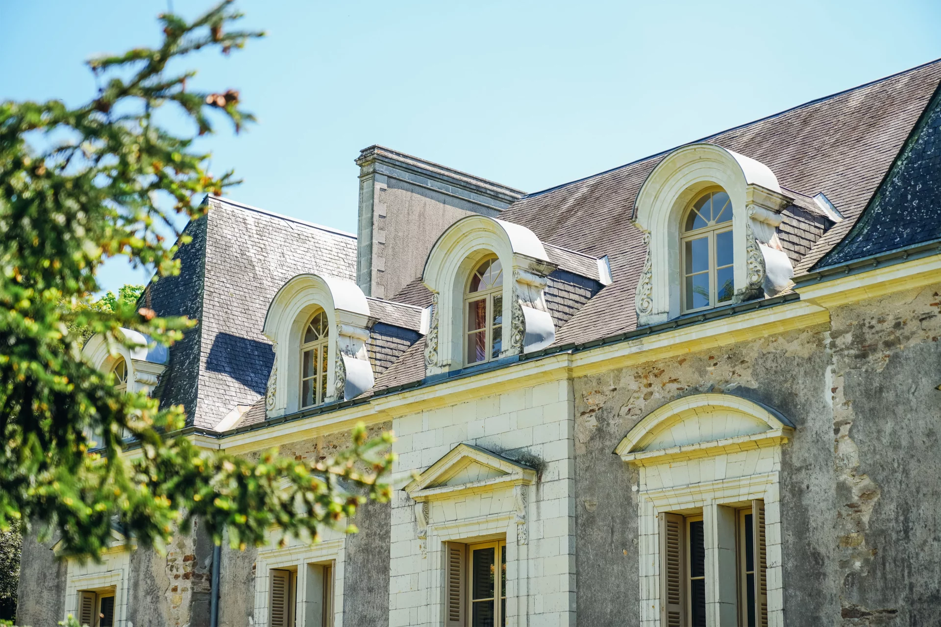 Secluded from view, this neo-classical residence comprises a central body flanked by two symmetrical lateral wings. Each façade is enhanced by monumental entrance steps, whilst the tuffeau stone window surrounds are surmounted by pediments alternating between triangular and arched forms. The numerous ashlar stone dormers adorned with ailerons perfect the architectural elegance of the ensemble.