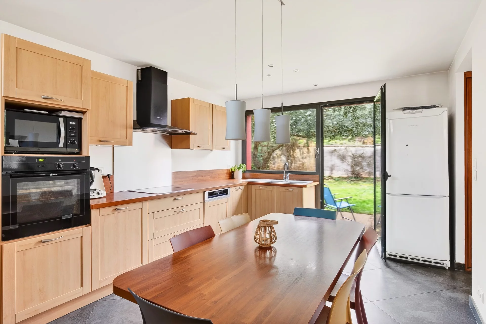 The suite on this main, warm level is organized around a pleasant garden planted with trees and on one level: a beautiful living room enlivened by a pellet stove and extended by a vast independent family kitchen, a master suite designed as a true private space with dressing room, study and shower room with toilet.