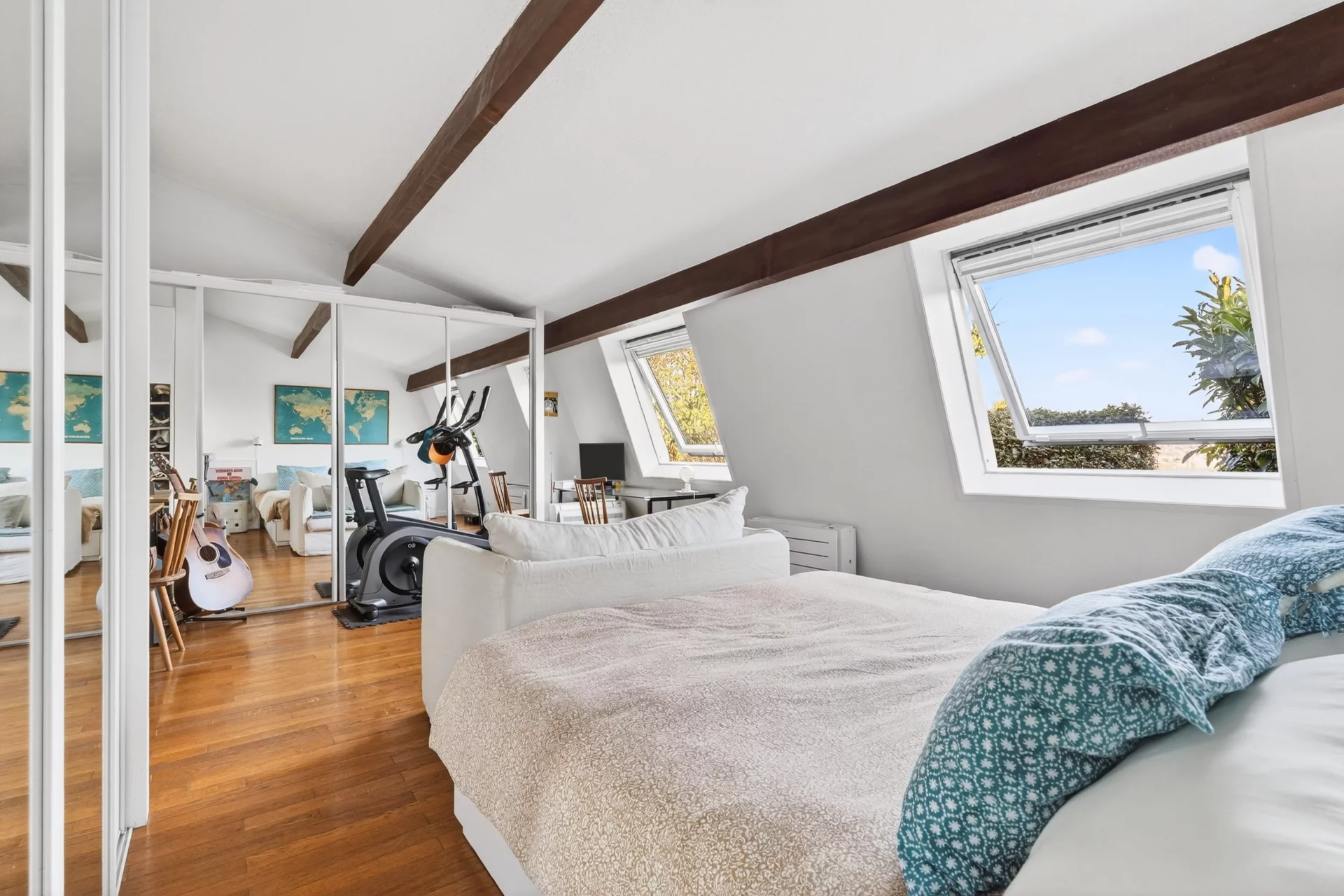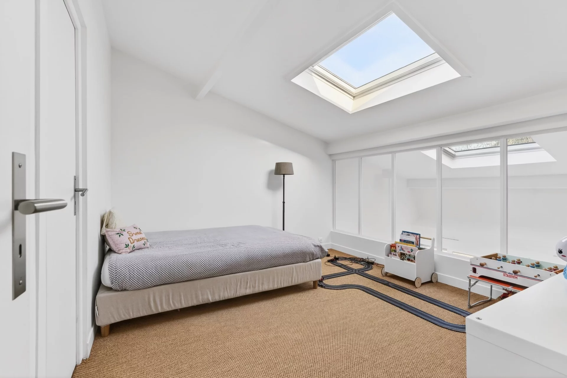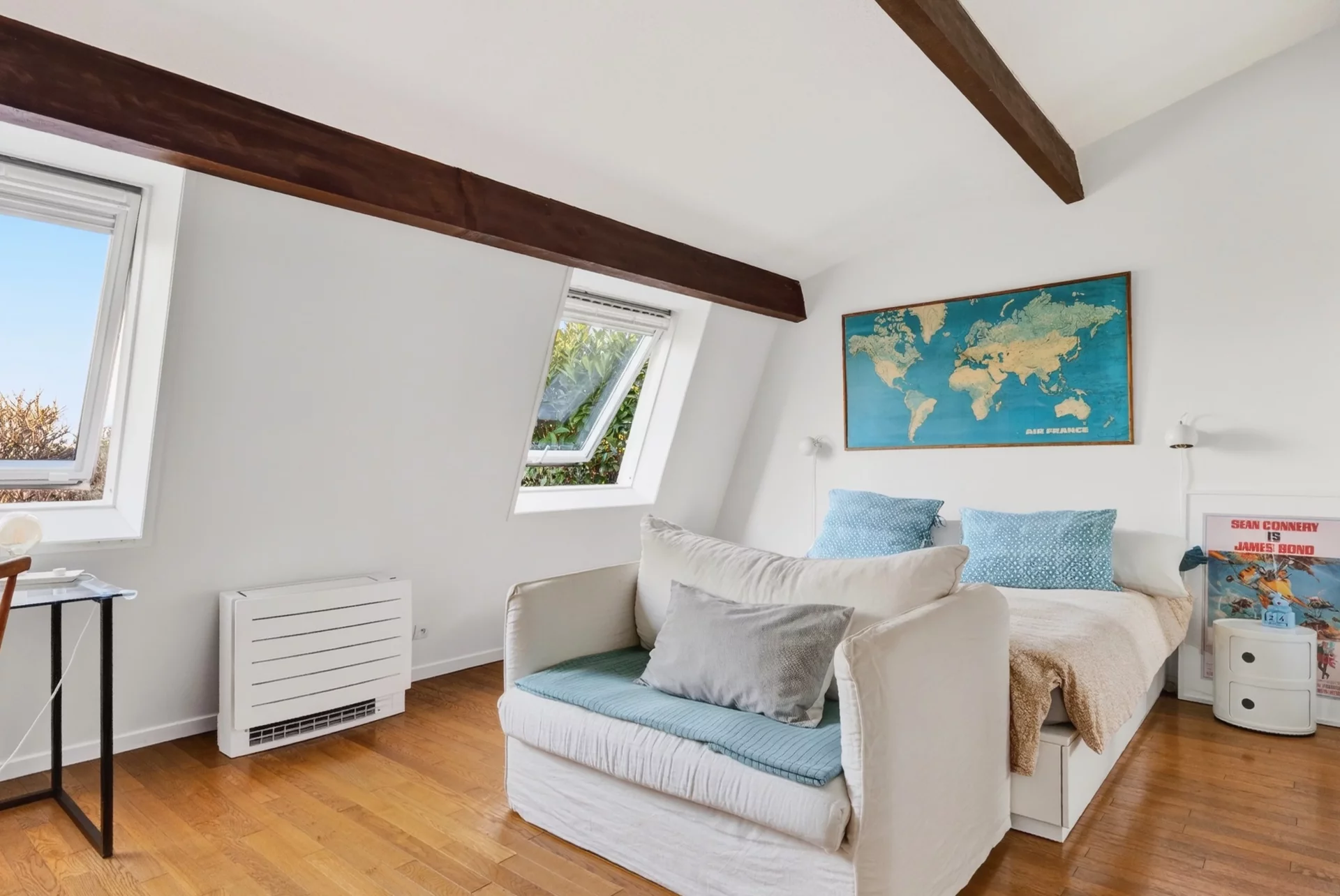 The second floor offers two bedrooms, one of which communicates with a mezzanine office/bedroom, a bathroom and a dressing room.