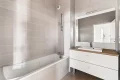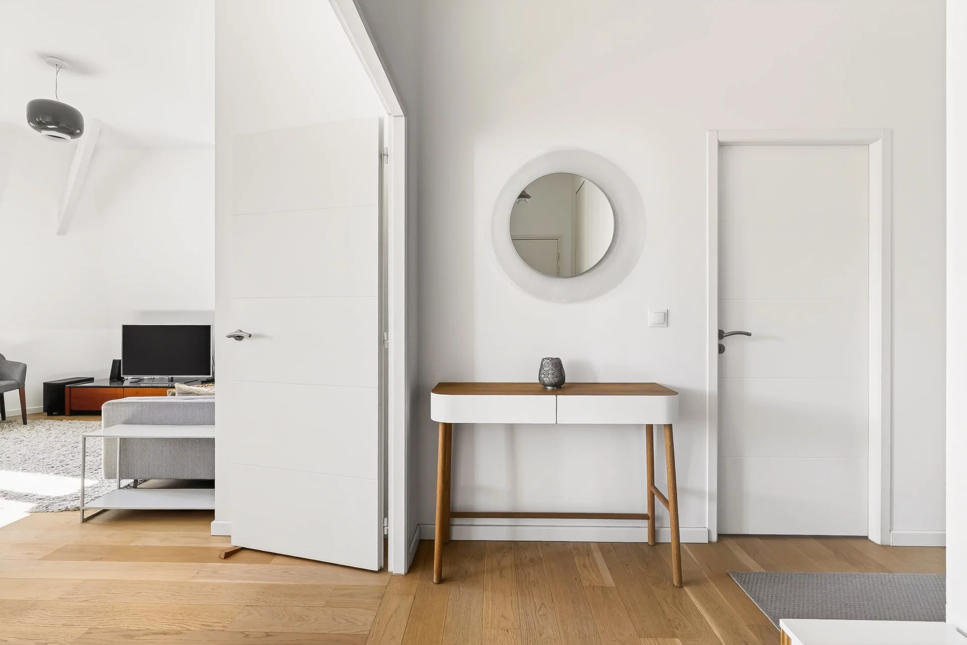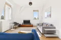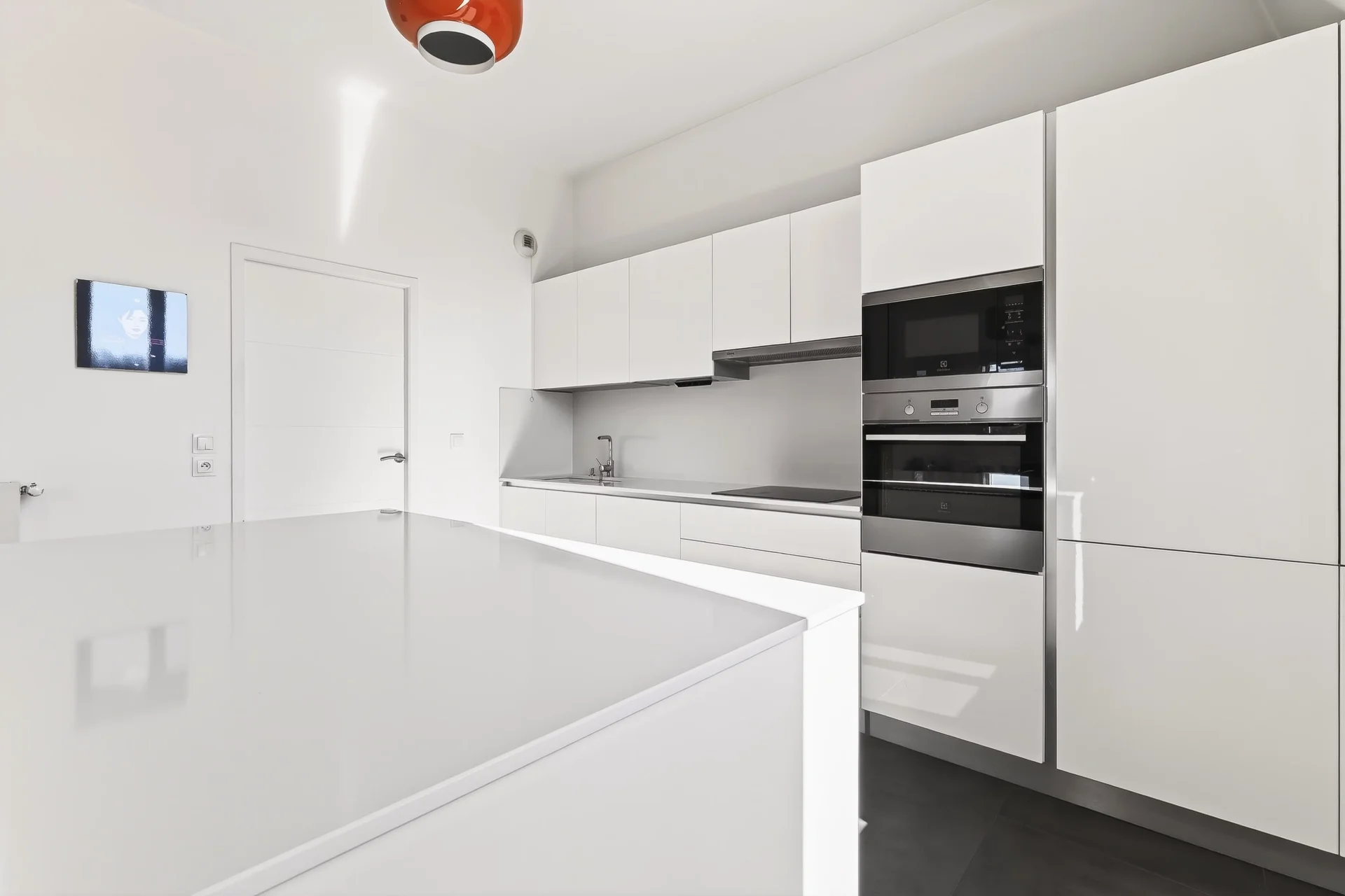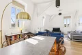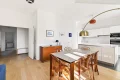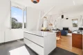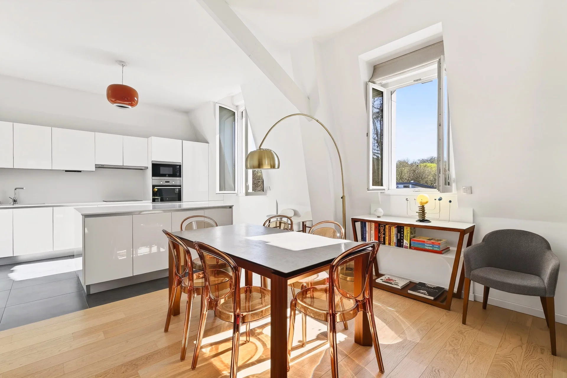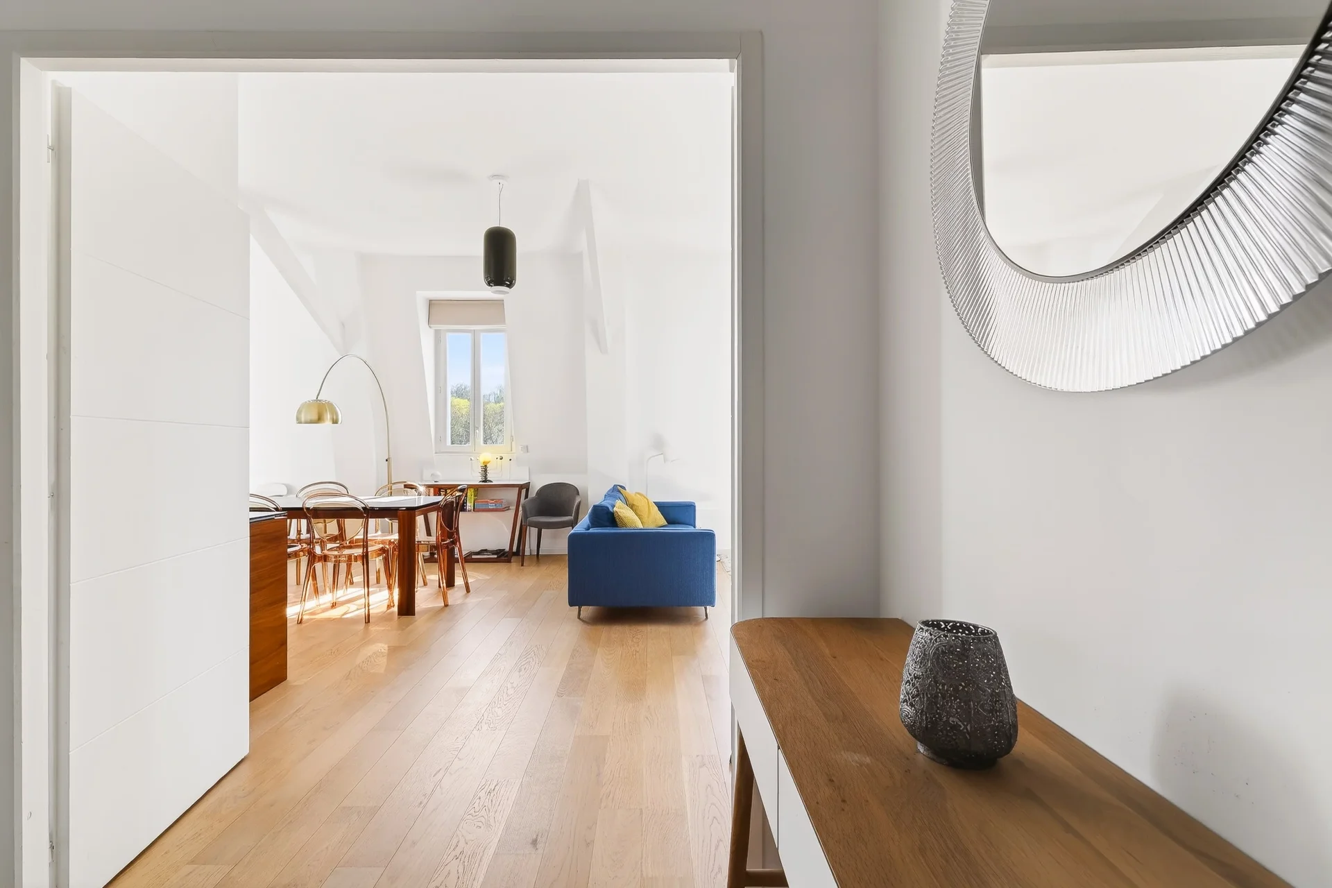 The apartment opens onto an entrance leading to a spacious reception room filled with light, extended by an open kitchen, elegantly furnished. A pantry as well as guest toilets complete this living space.