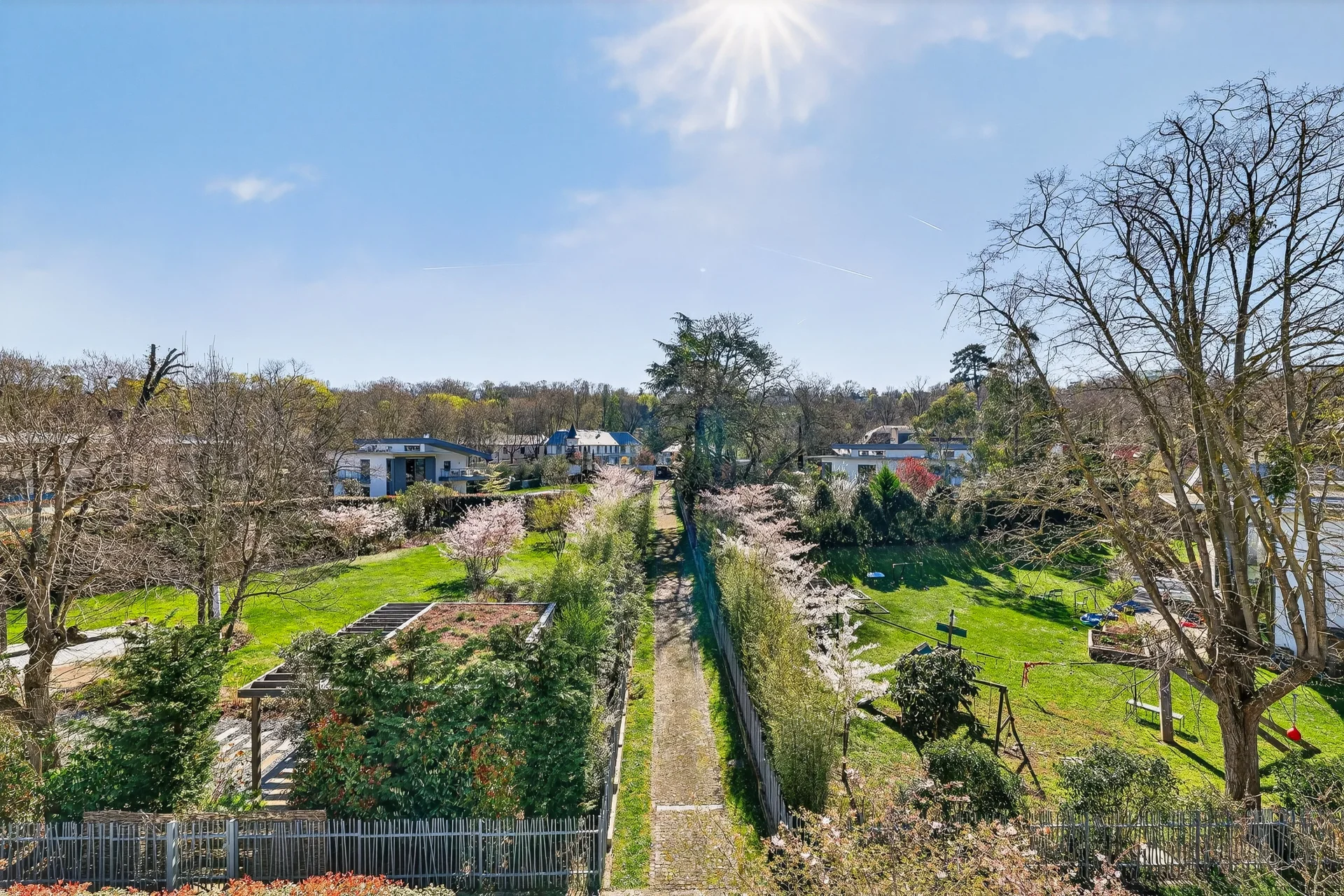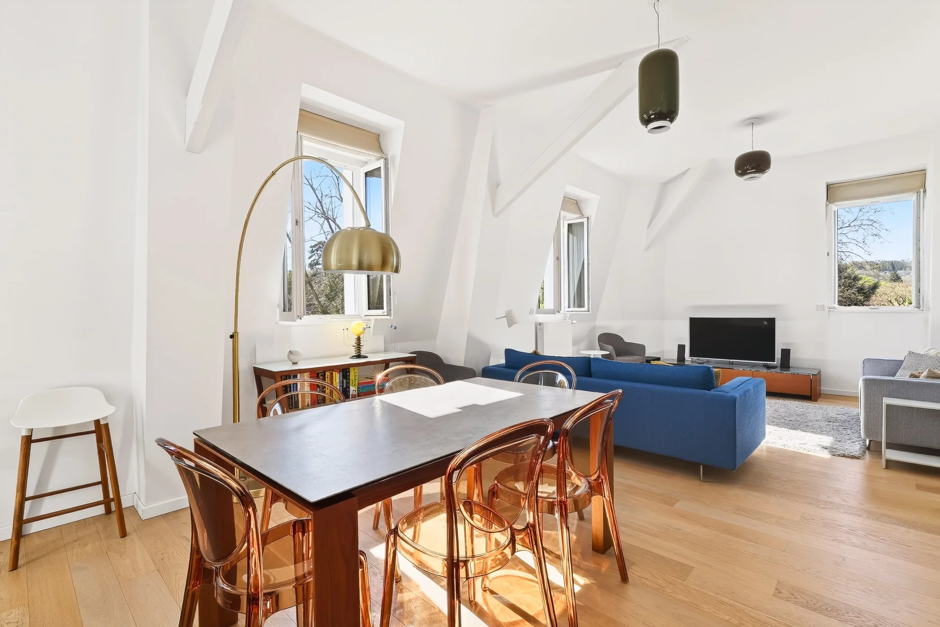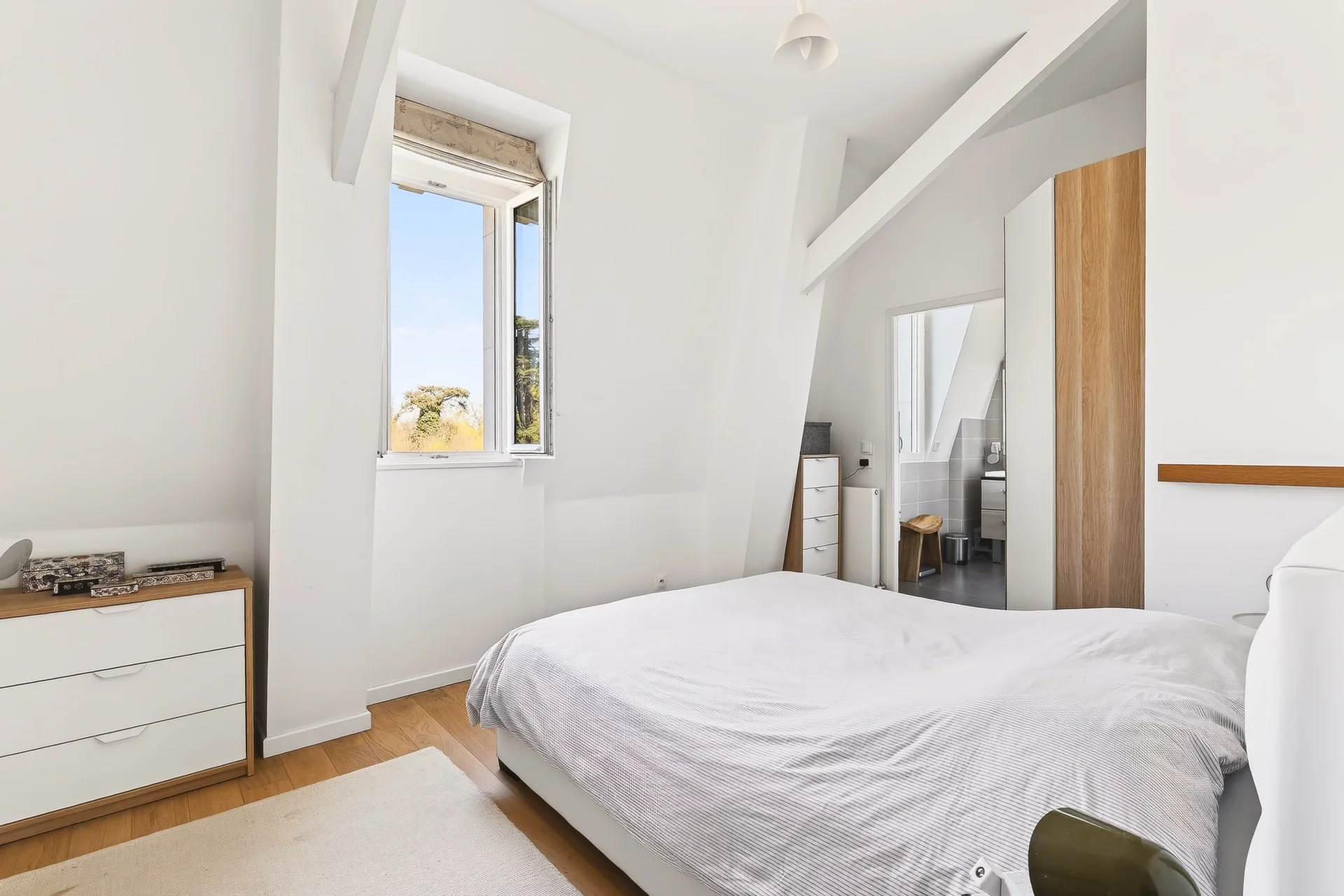 Within a charming character house, this beautiful 98.06 sqm apartment, located on the second floor, is charming for its superb ceiling height and refined atmosphere. It is situated in an exceptional green environment, in the heart of a confidential property enhanced by a magnificent 5,700 sqm wooded garden, a true haven of tranquility.