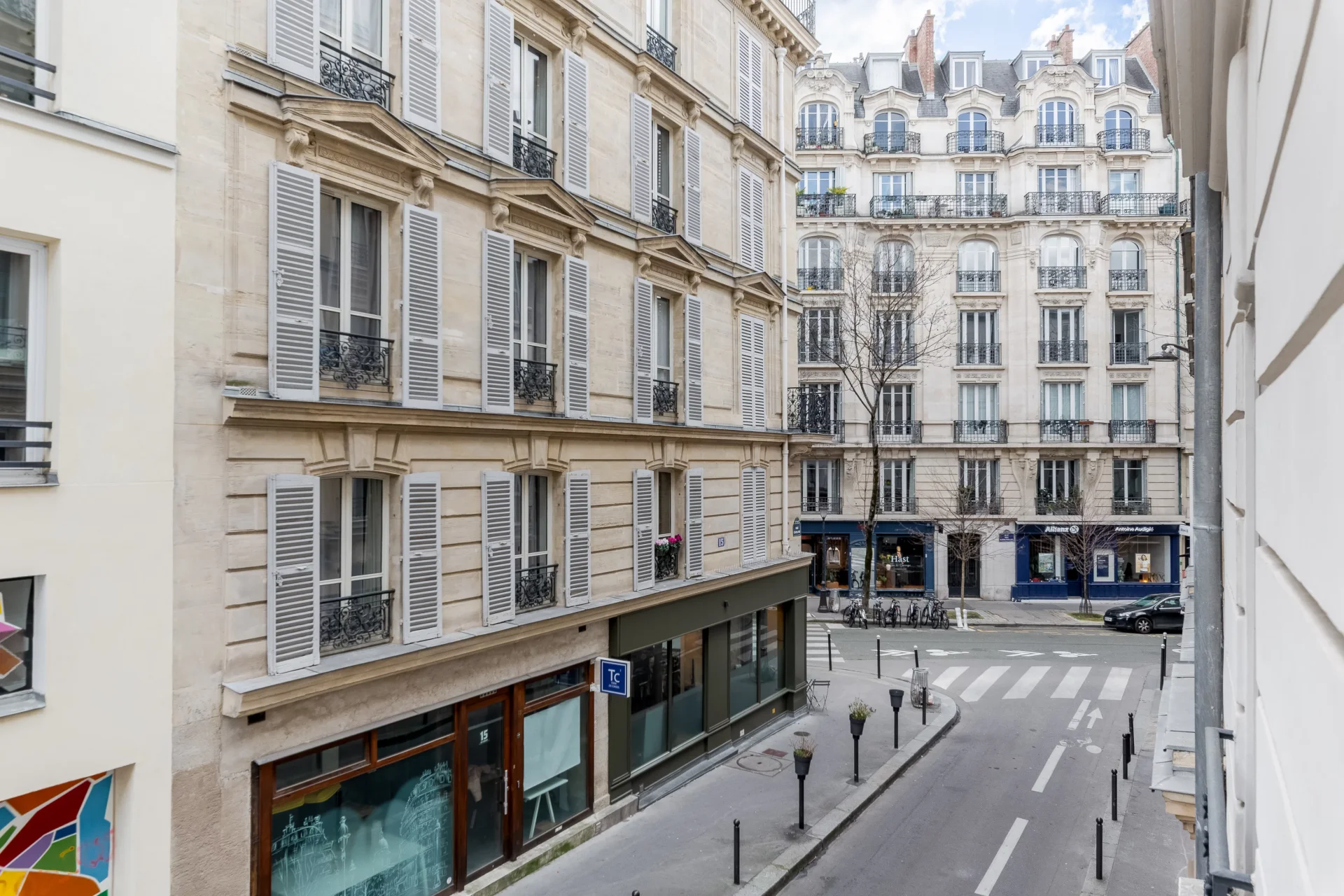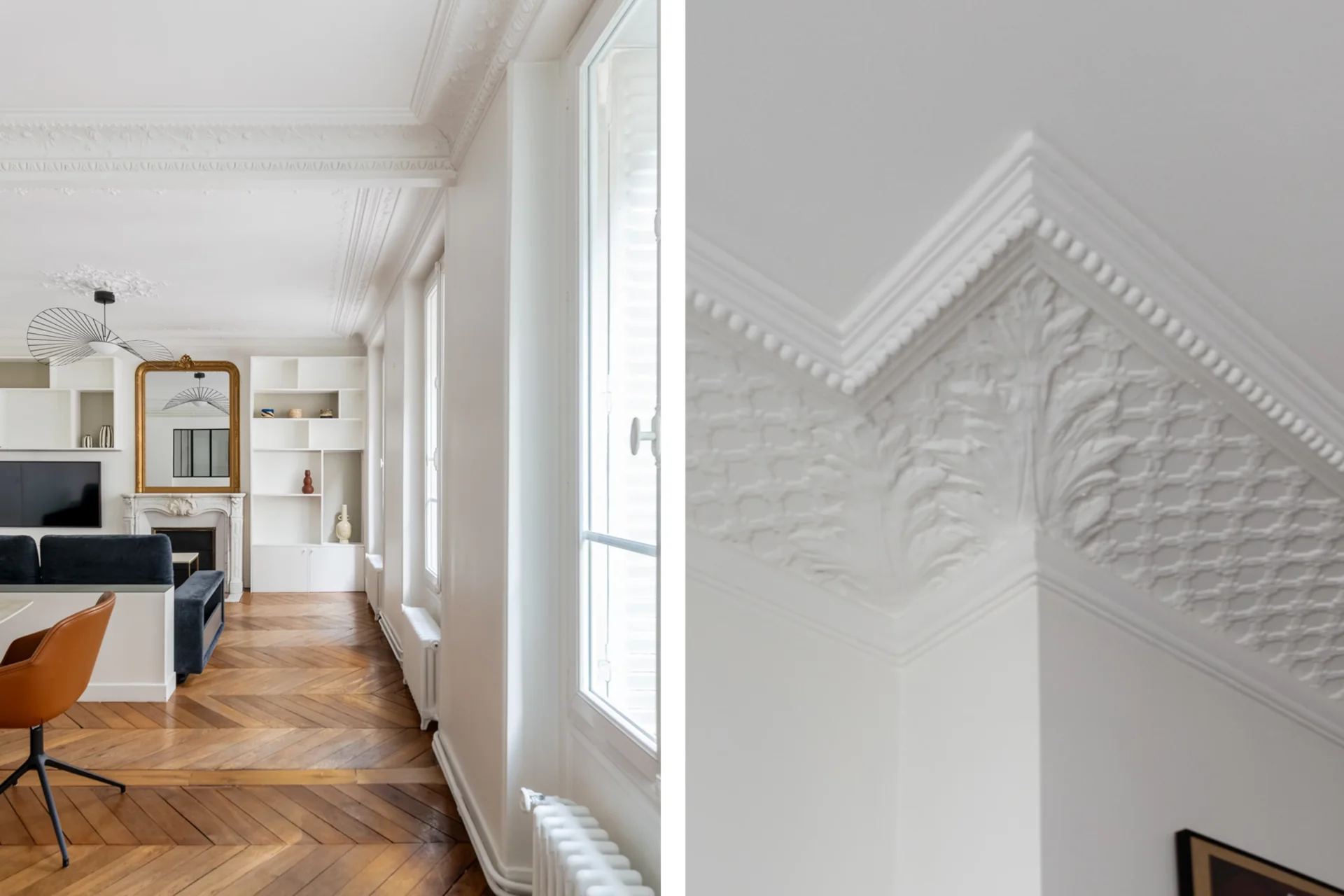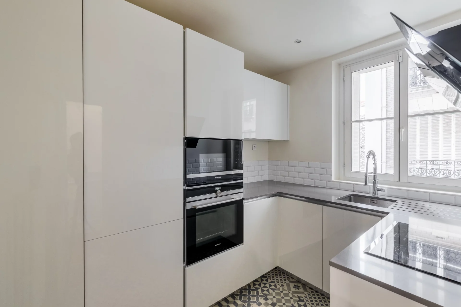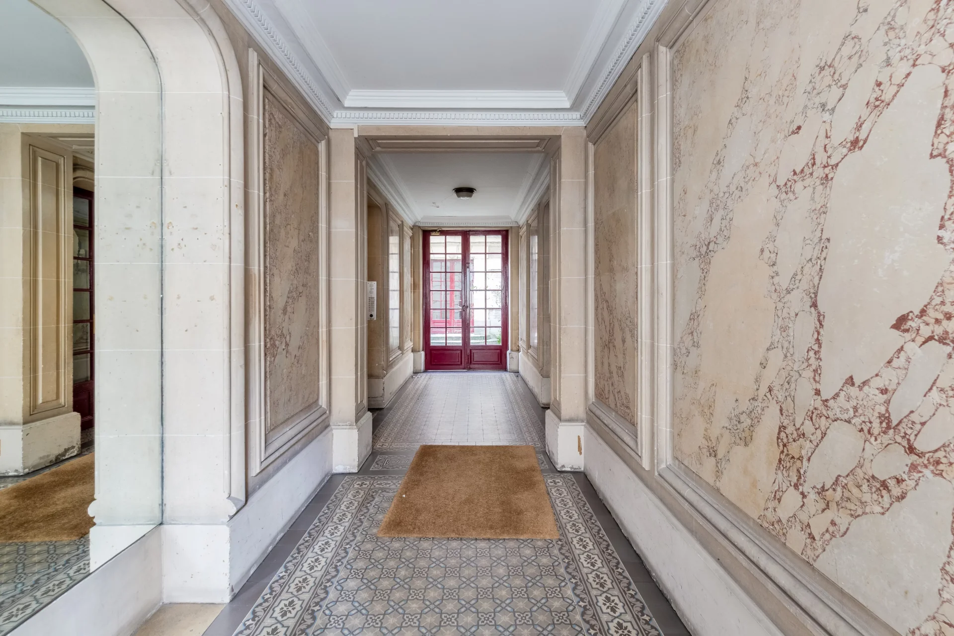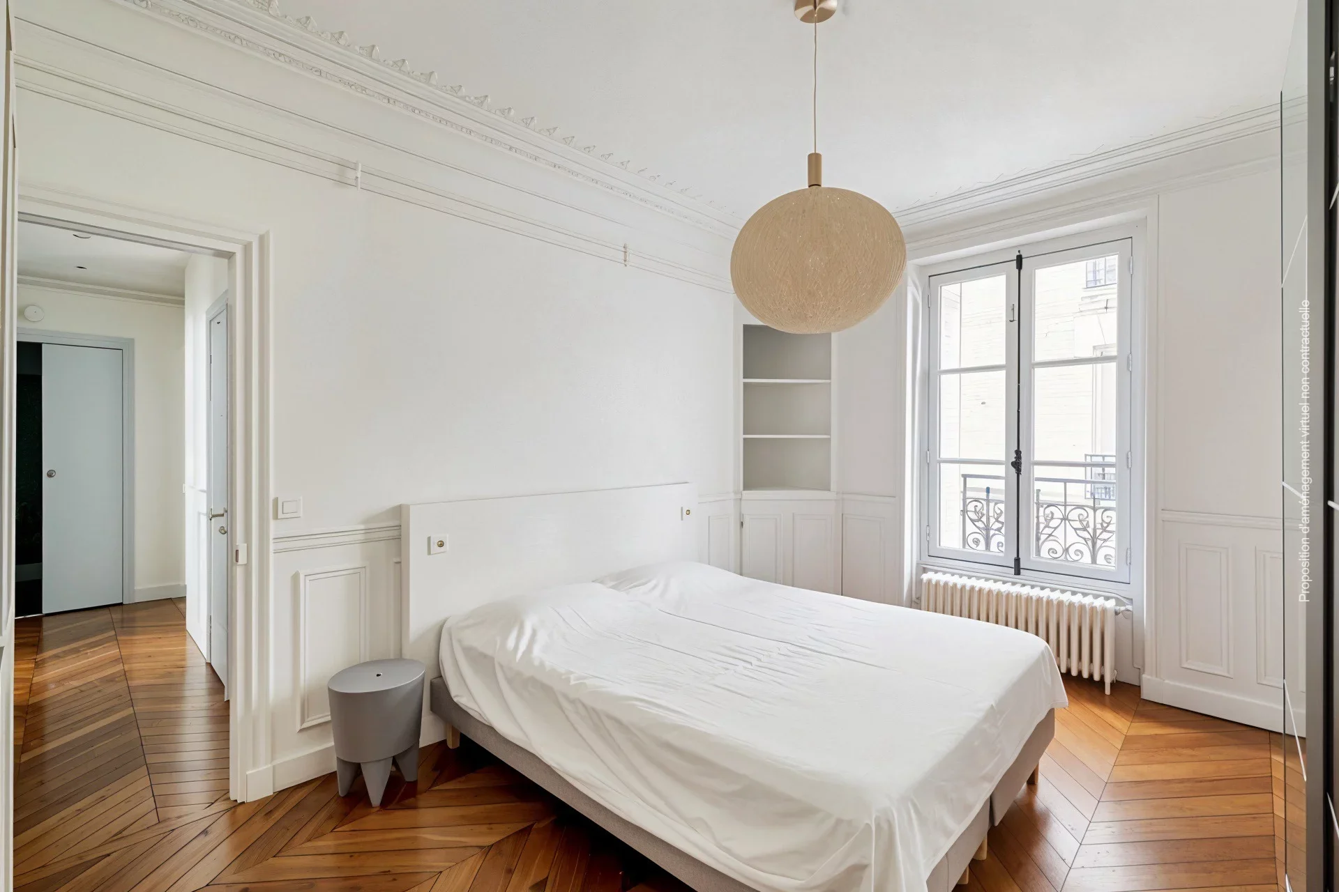 In absolute calm, it includes an entrance, a beautiful double living room, a separate fitted and equipped kitchen, two bedrooms including one overlooking a quiet courtyard, a shower room, and separate toilets. Very good volumes and careful renovation. The charm of the old has been preserved: parquet, moldings, and fireplaces.